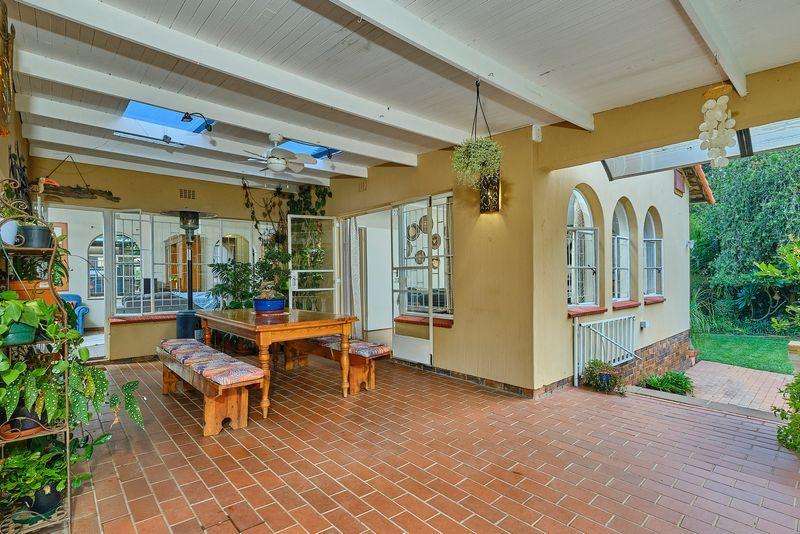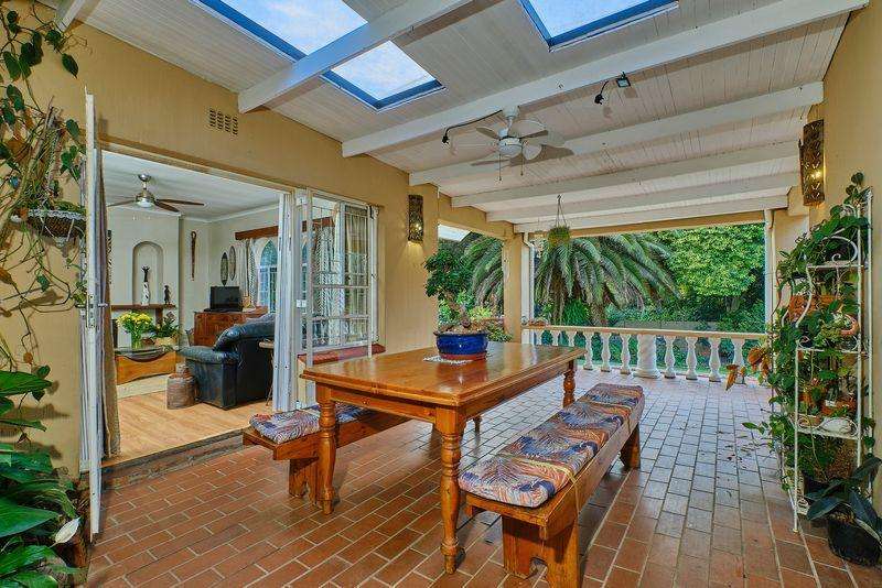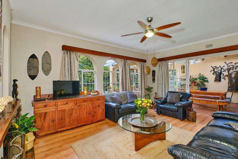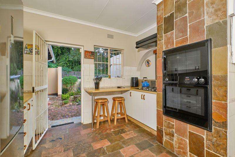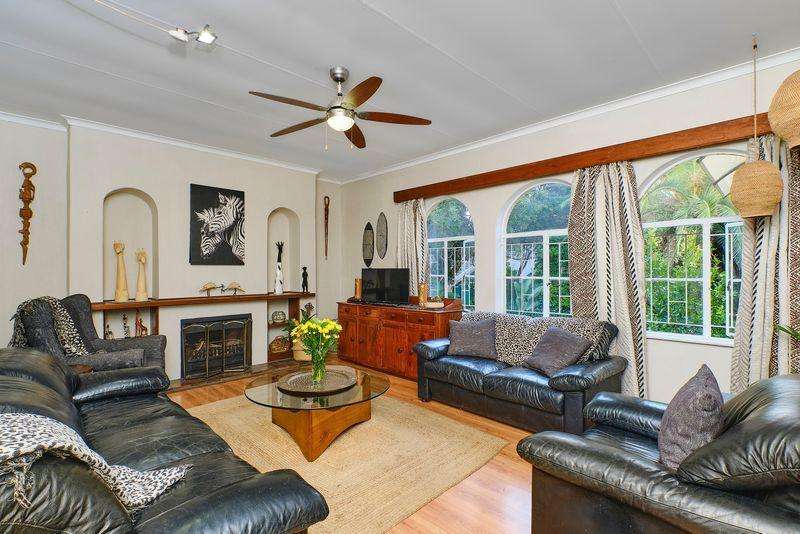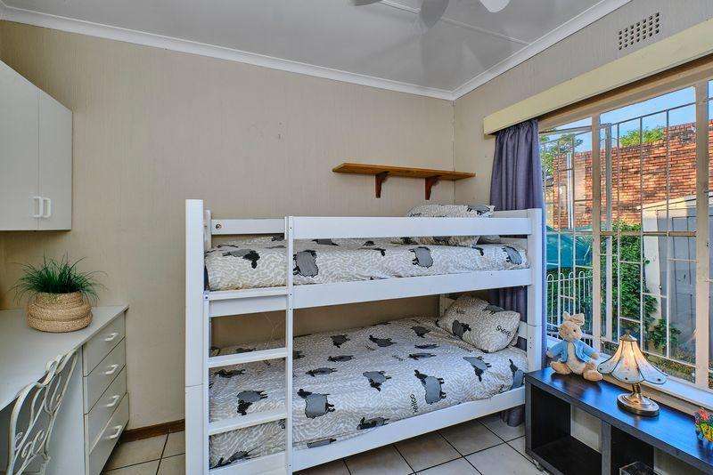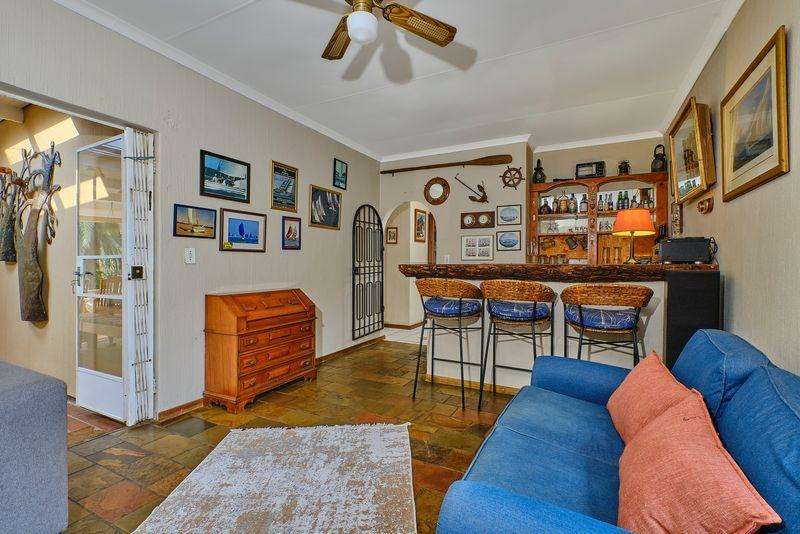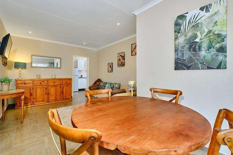 The main house is well-maintained and designed for easy family living. Four well-sized bedrooms offer plenty of space, with two bedrooms, including a main en-suite. While the bathrooms are functional, they present an opportunity for modern updates to add personal style. The home's heart is the farm-style kitchen, featuring ample cupboard space, a gas hob, and an eye-level oven. Flowing seamlessly into the dining room, which has its own patio, the layout is practical and ideal for gatherings. The dining area connects to the spacious lounge, which extends onto a covered patio, overlooking the lush garden and sparkling pool, making it perfect for entertaining or unwinding.
