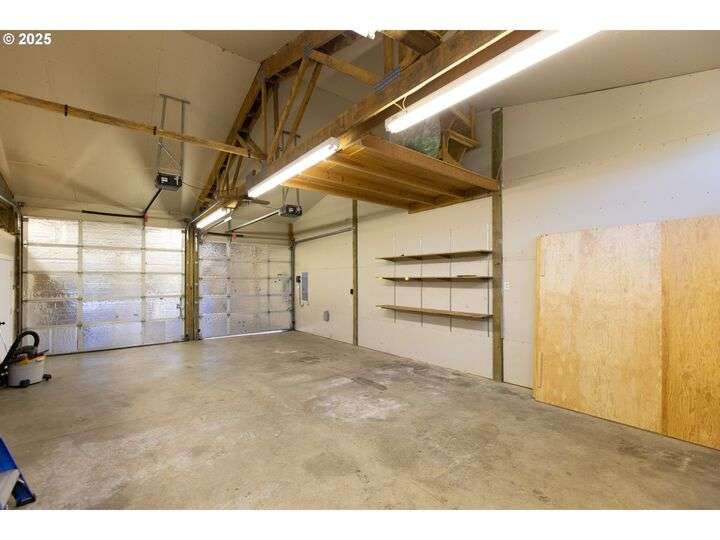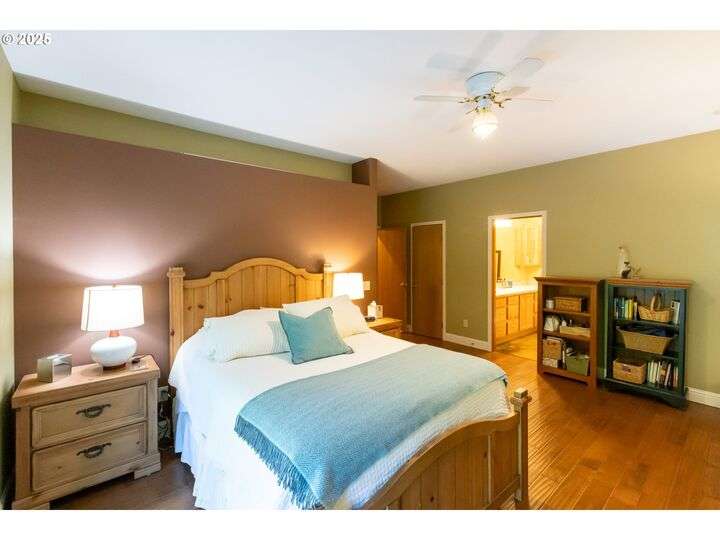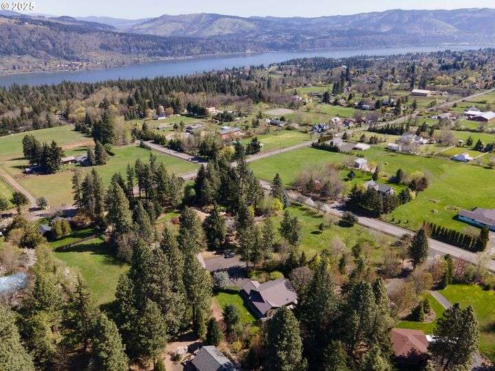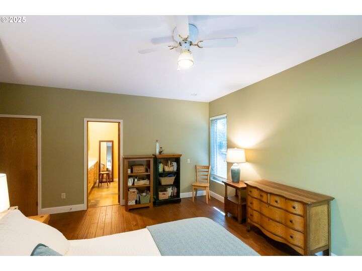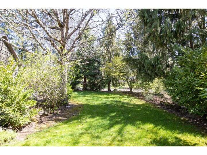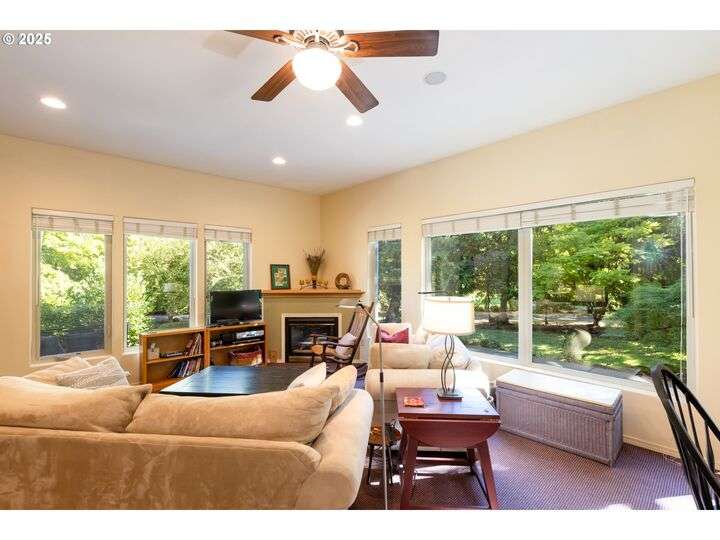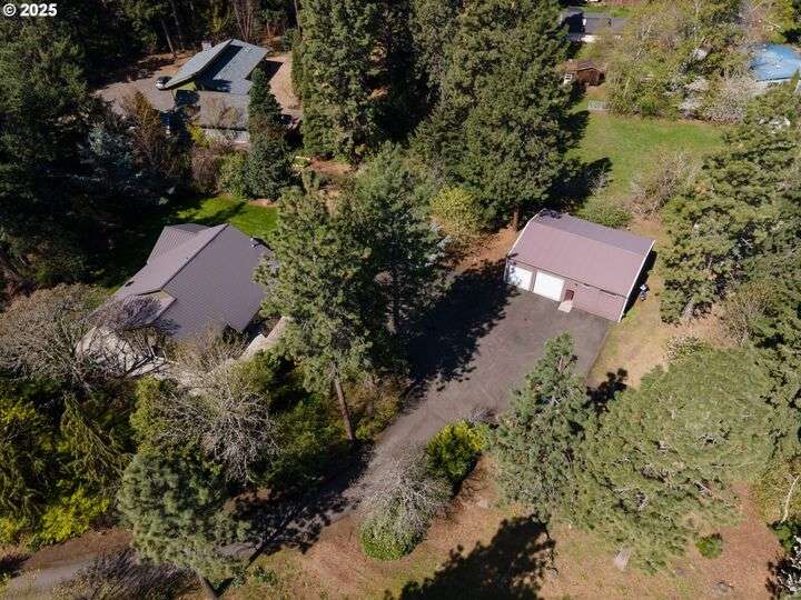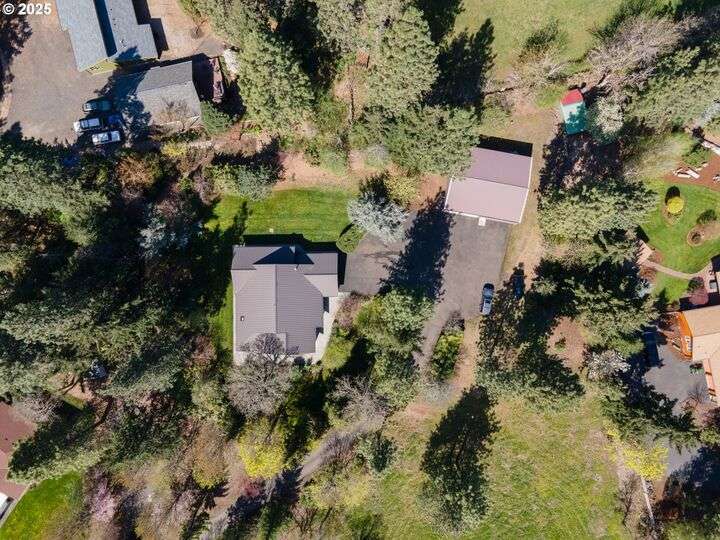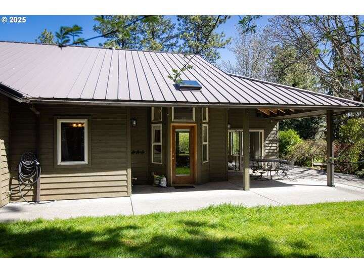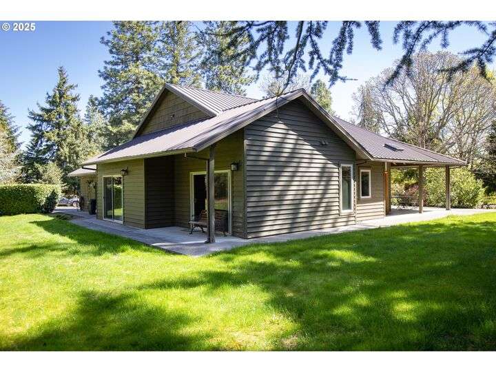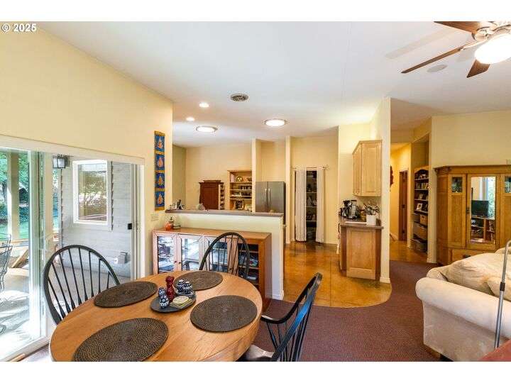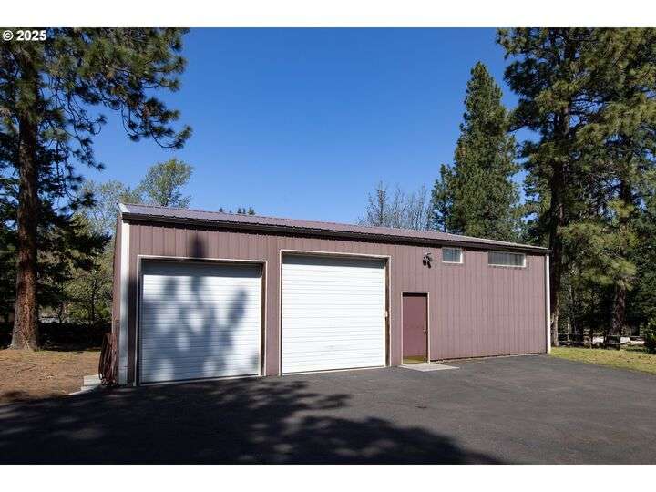 Contemporary style home with a functional floor plan and ample storage. Nine-foot-high ceilings throughout with large windows and natural light. Radiant floor heating throughout and a gas fireplace in the living room. The living room adjoins the dining area with a sliding door that opens onto a covered gabled patio. Kitchen includes maple cabinets, Corian countertops, a wet bar, a large walk-in pantry, newer stainless steel appliances including a double-oven KitchenAid stove. Gas hookup for an outdoor BBQ. New washer, dryer. The primary suite features two large walk-in closets, full private bath, and a sliding door that opens onto a second private covered patio. Other attributes: an attached two-car garage, a second bedroom, full guest bath, large office with a closet, ample storage, three windows. The office could be converted into a third bedroom. Mature landscaping with beautiful specimen trees provide privacy and naturally stunning views from each window. Each season brings new colors with a delightful change in scenery. Country setting on 2.14 acres conveniently close to town. Large outbuilding includes an insulated, sheet-rocked workshop with two oversized garage doors and operable windows, a separate finished office with tall ceilings, a bath, recently finished laundry room, both electric and gas heat. Plenty of storage. New gutter covers, new ice breaks, new well tanks, and an updated irrigation system. Fresh paint and new lighting inside and out. Ample paved parking.