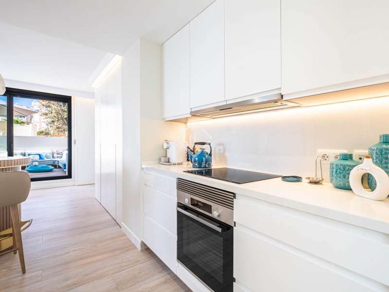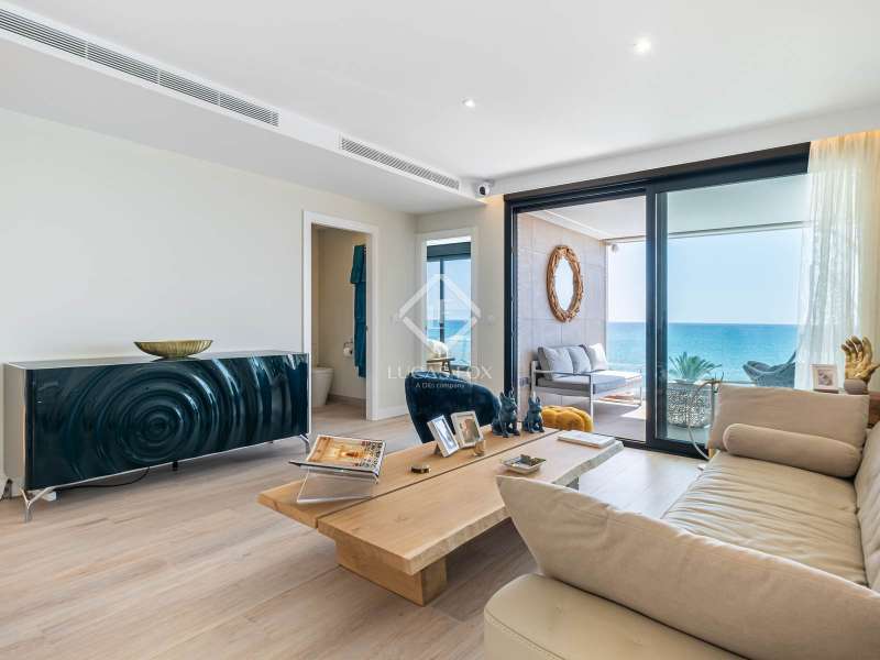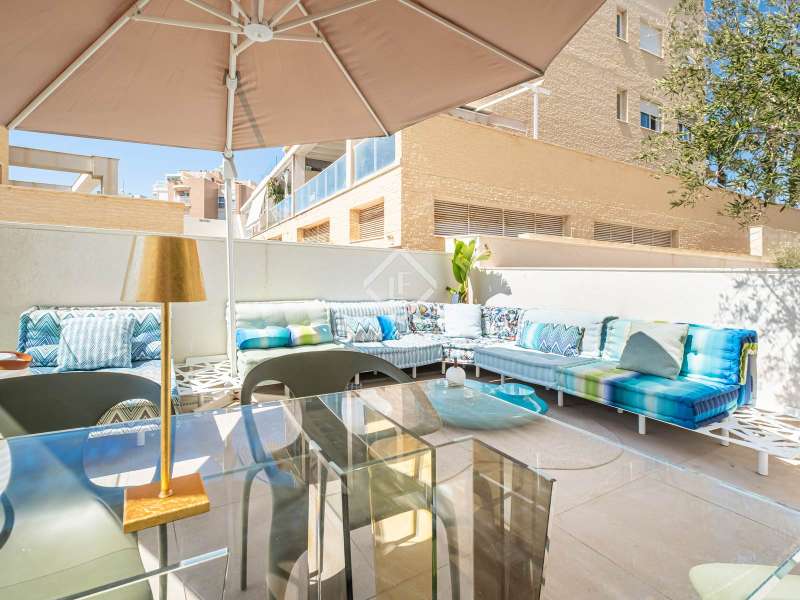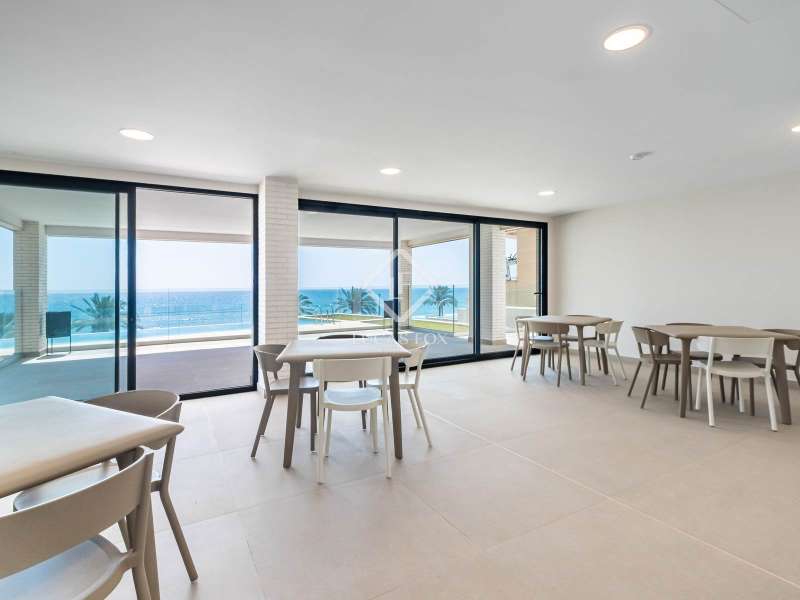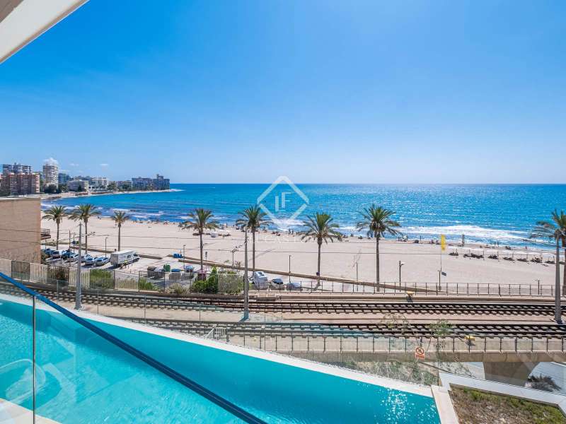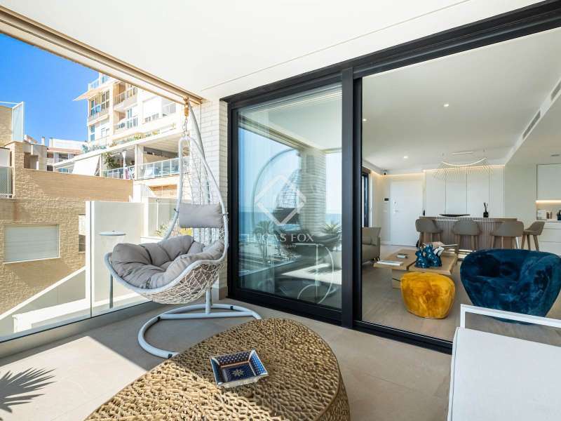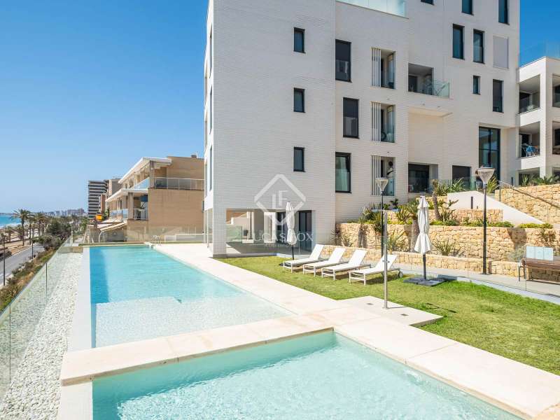This contemporary coastal residence offers a rare combination of sleek design, cutting-edge technology, and the calm of living directly by the sea. Set in a quiet residential neighbourhood, the home enjoys an unbeatable location just steps from the beach. From here, everyday essentials such as supermarkets, pharmacies, shops, and even a tram stop connecting with both Alicante and Benidorm are within easy walking distance. The development itself is intimate, with only 24 apartments, ensuring privacy and an exclusive atmosphere. The apartment is technically classed as a ground floor unit but sits at the height of a first floor, offering 110 m² of built space (98 m² of interiors) carefully designed to maximize light and comfort. A spacious living room opens directly onto a covered 10 m² terrace for relaxing under the awning and enjoying uninterrupted views of the sea. In addition, a larger 20 m² open-air terrace has been designed as a chill-out zone, which is perfect for entertaining friends, hosting dinners, or simply soaking up the Mediterranean sun. Inside, the open-plan kitchen comes fully fitted with premium Bosch appliances, while a separate laundry area provides added convenience with washing machine, dryer, and water heater. The sleeping area includes a welcoming guest bedroom with fitted wardrobes and a generous master suite complete with its own bathroom and built-in storage. A second full bathroom serves the rest of the home. Comfort is assured with underfloor heating throughout, ducted air conditioning, and motorized blinds on every window. The property is fully equipped with an advanced smart-home system, allowing you to control lighting, climate, blinds, and hot water from your mobile phone. Security has also been thoughtfully integrated with a video surveillance system. Two private parking spaces and a storage room are included in the price. (Furniture is not included, but the property can be purchased fully furnished by separate arrangement.) Residents also enjoy beautifully landscaped Mediterranean gardens, a fully equipped fitness centre, a modern coworking lounge, and a spectacular infinity pool that seems to flow directly into the sea. Please contact us for further information.