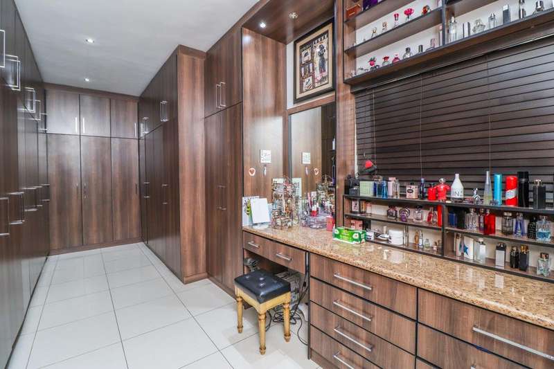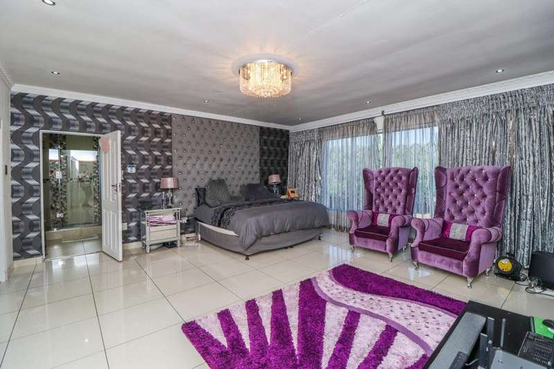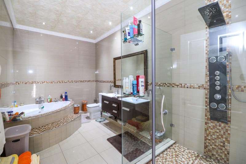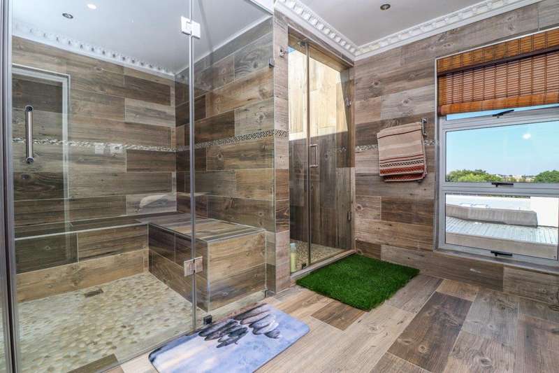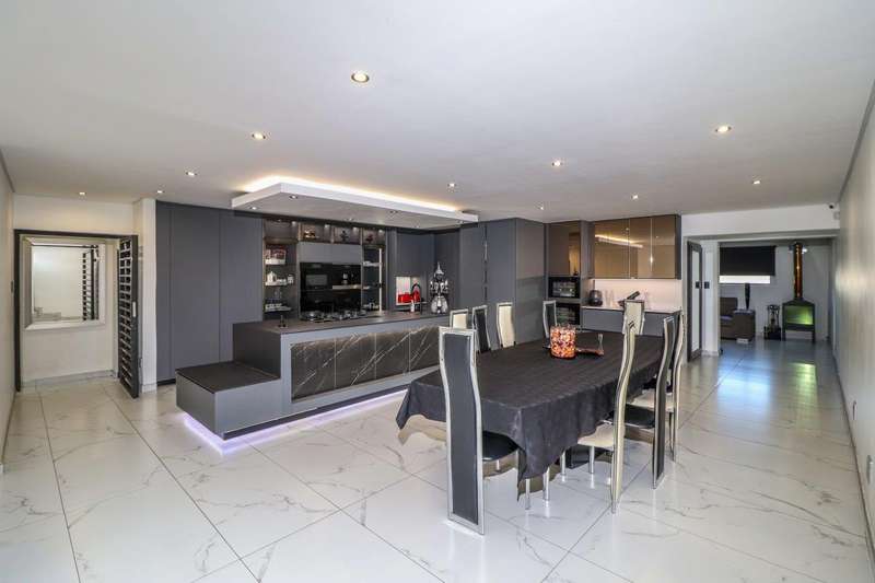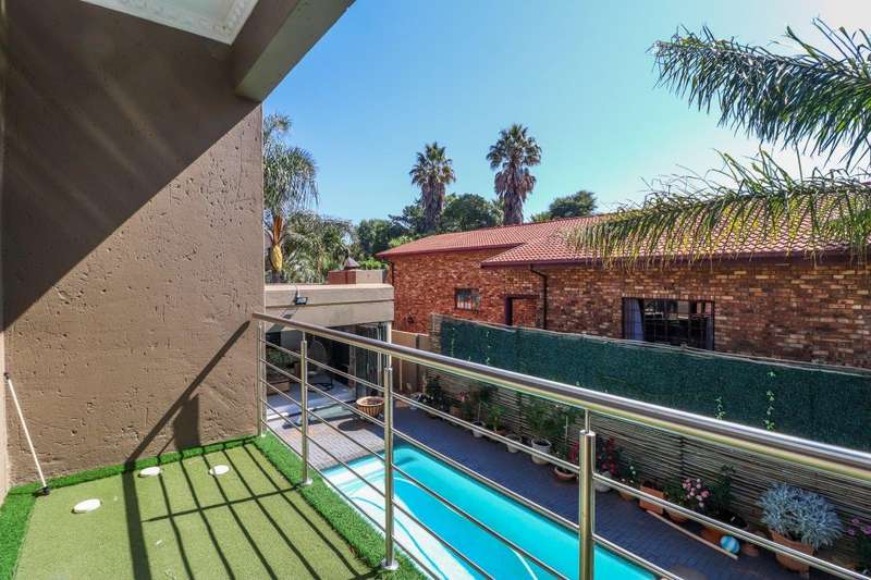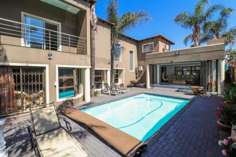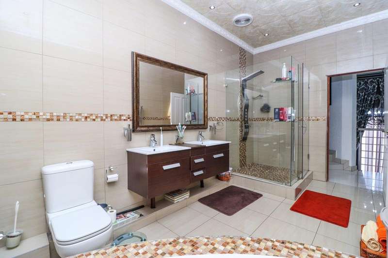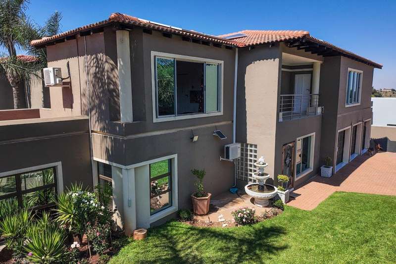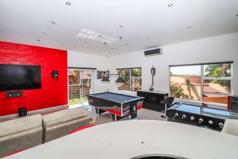 Generous free flowing receptions consisting of informal lounge that flows to enclosed patio with braai facility opens completely onto sun-kissed pool area. The dining area is open plan to the dazzling chef’s kitchen & scullery with every convenience built-in & the TV room offers a cosy fireplace that warms the entire area for those frosty winter nights. This level offers 3 spacious bedrooms & 2 modern bathrooms (one En-suite) plus a work from home study. Staircase leads to a large entertainment room fitted with fireplace, cocktail bar & pool table. Slider door opens onto a balcony with golf putting green. For the fitness fanatic a gym & on this level 3 more bedrooms, 2 bathrooms & private prayer room. The master bedroom fitted with slider doors opens onto a north facing balcony, air conditioner & an exquisite dressing room. Main En-suite with corner bath, steam room, outdoor shower & balcony. 3 Automated garages with direct access. Outbuildings: consist of: Staff Quarters; laundry facility & 2 store rooms. Many extras: Solar power with invertor& Lithium battery bank: 2 Gas/electric geysers. Pool heat pump & cover; Borehole with filtration system, fully automated sprinkler system, pre-paid electricity plus excellent security. This is a Smart house with every convenience in place. Come see, Come sign!