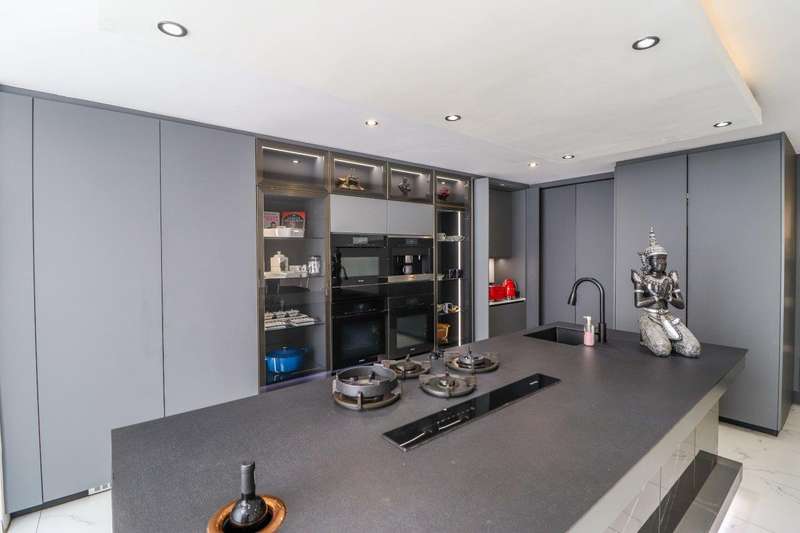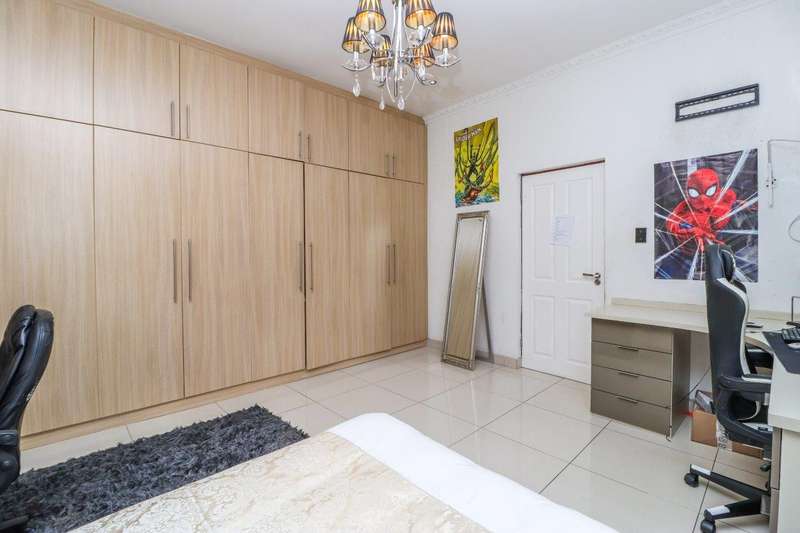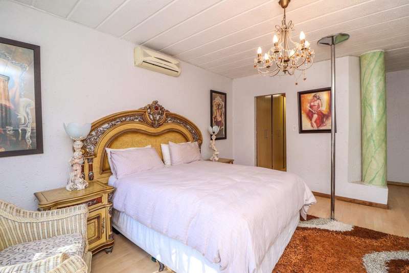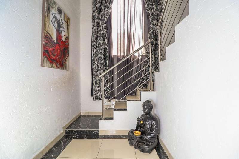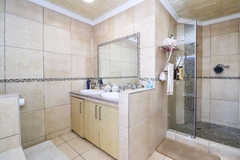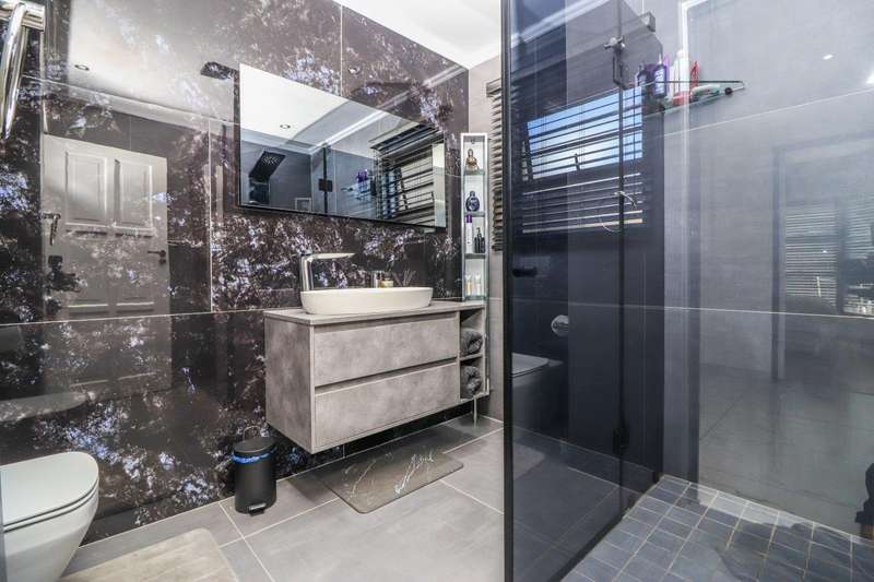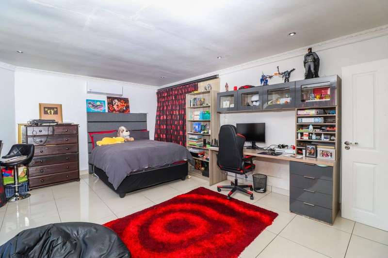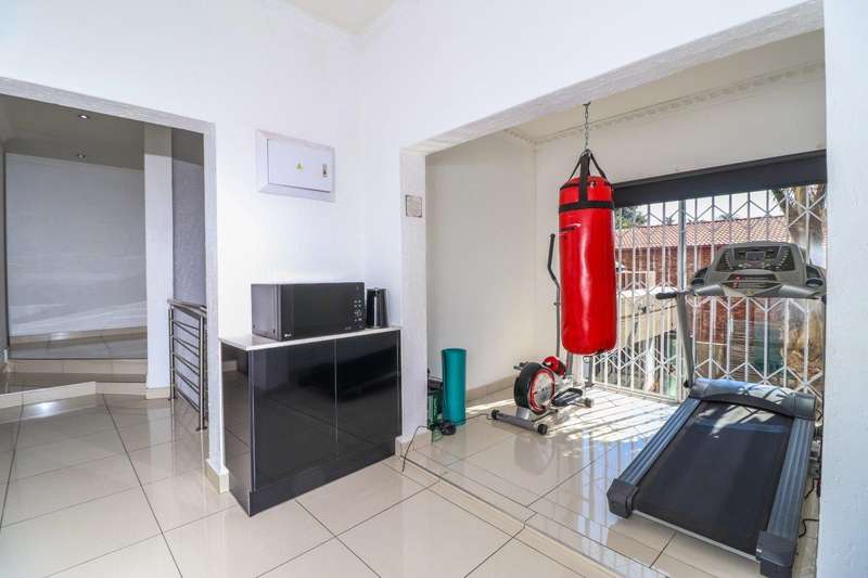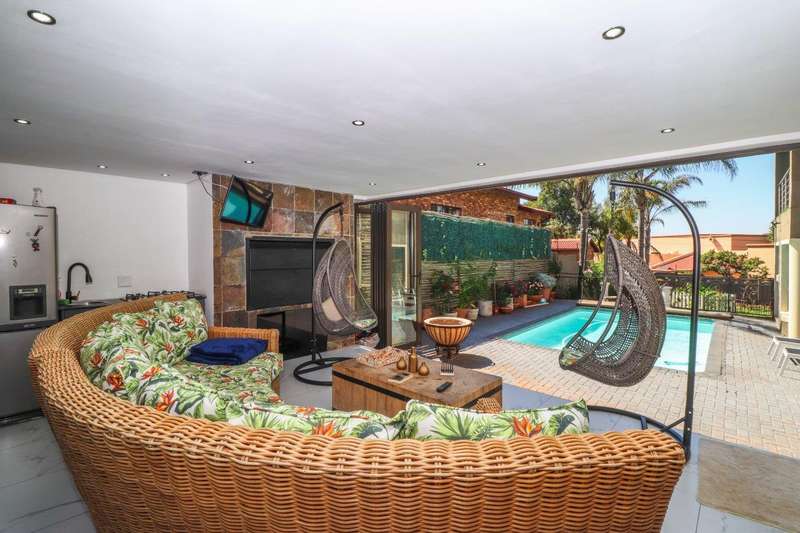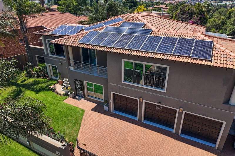 Generous free flowing receptions consisting of informal lounge that flows to enclosed patio with braai facility opens completely onto sun-kissed pool area. The dining area is open plan to the dazzling chef’s kitchen & scullery with every convenience built-in & the TV room offers a cosy fireplace that warms the entire area for those frosty winter nights. This level offers 3 spacious bedrooms & 2 modern bathrooms (one En-suite) plus a work from home study. Staircase leads to a large entertainment room fitted with fireplace, cocktail bar & pool table. Slider door opens onto a balcony with golf putting green. For the fitness fanatic a gym & on this level 3 more bedrooms, 2 bathrooms & private prayer room. The master bedroom fitted with slider doors opens onto a north facing balcony, air conditioner & an exquisite dressing room. Main En-suite with corner bath, steam room, outdoor shower & balcony. 3 Automated garages with direct access. Outbuildings: consist of: Staff Quarters; laundry facility & 2 store rooms. Many extras: Solar power with invertor& Lithium battery bank: 2 Gas/electric geysers. Pool heat pump & cover; Borehole with filtration system, fully automated sprinkler system, pre-paid electricity plus excellent security. This is a Smart house with every convenience in place. Come see, Come sign!