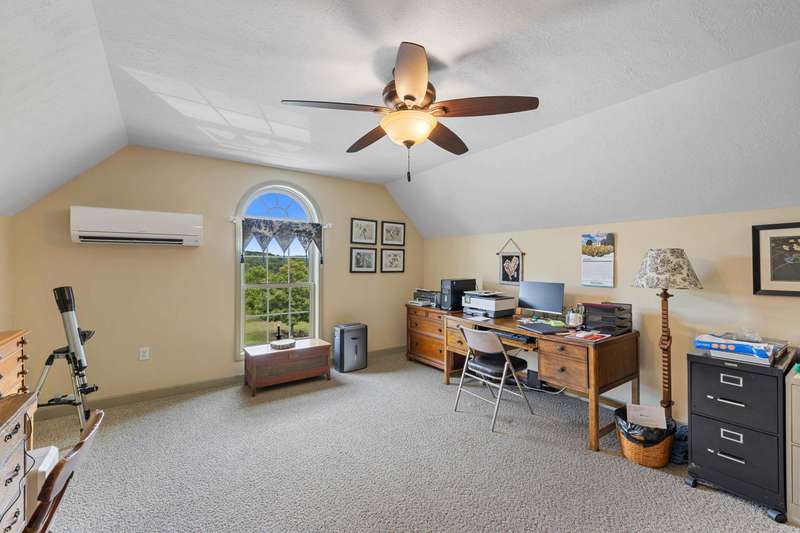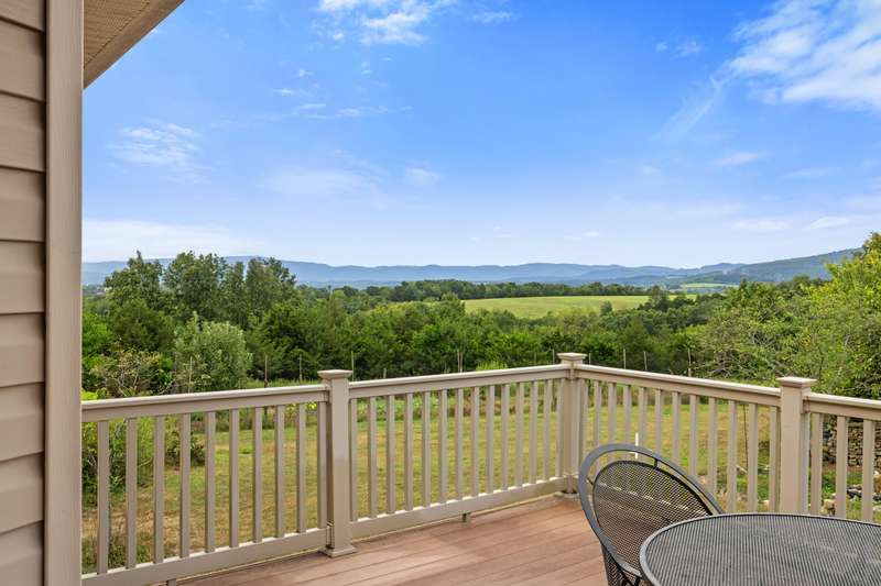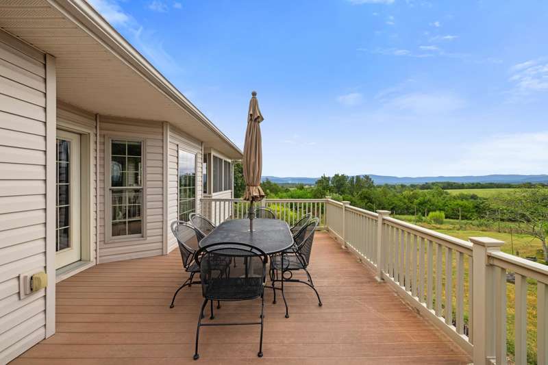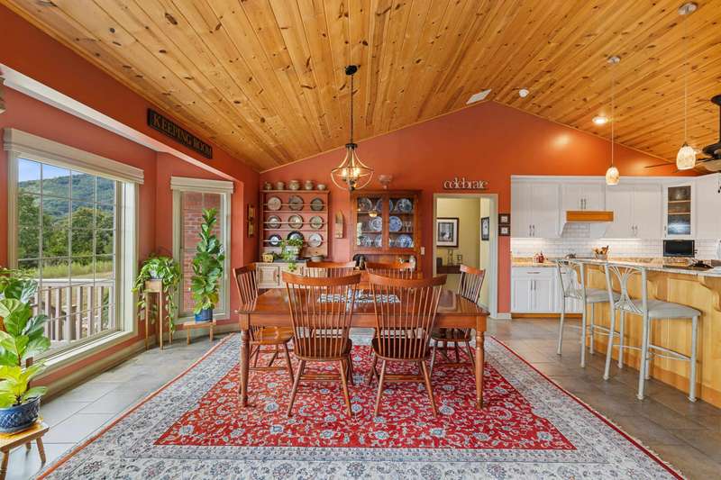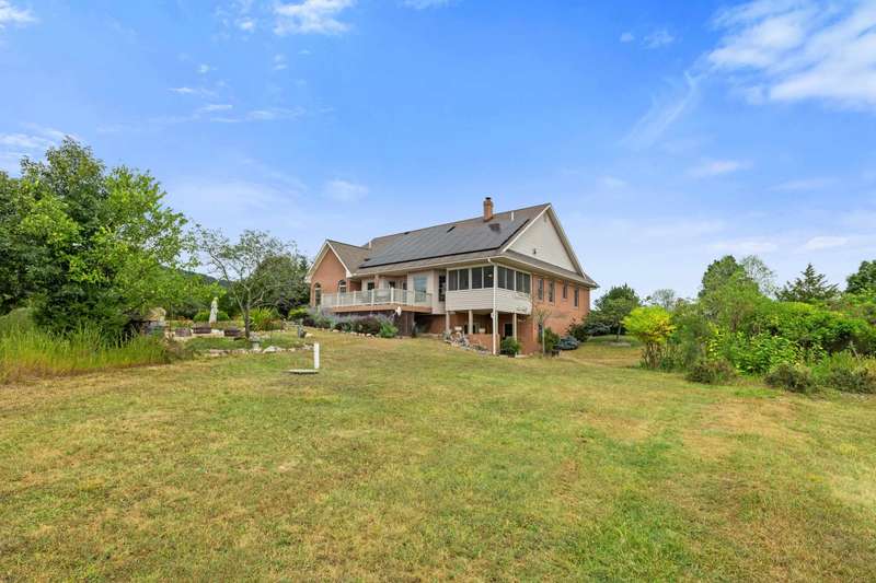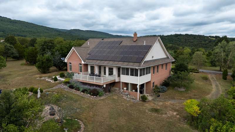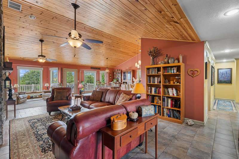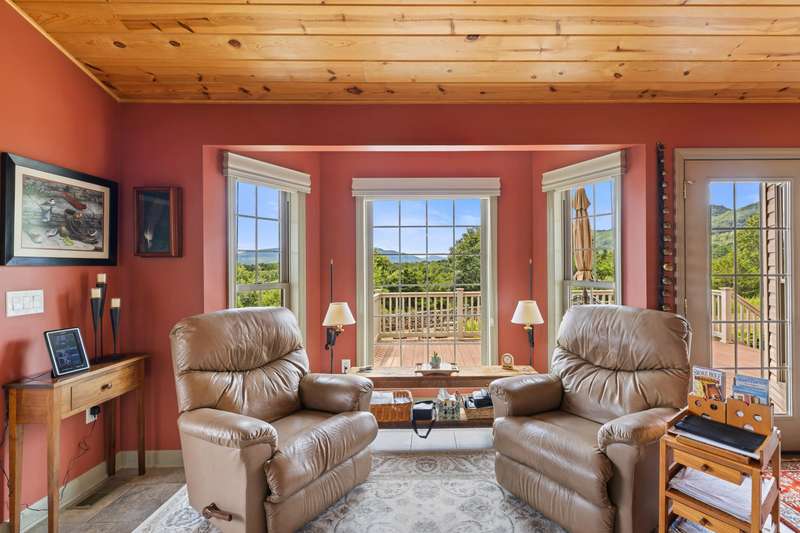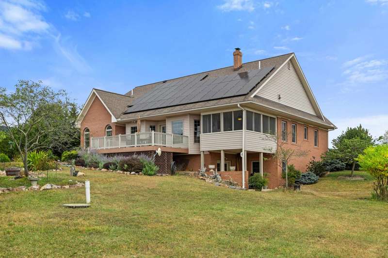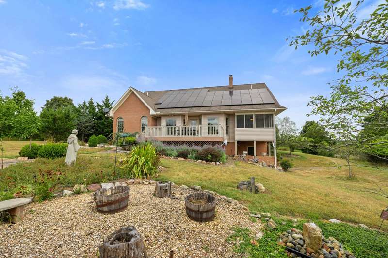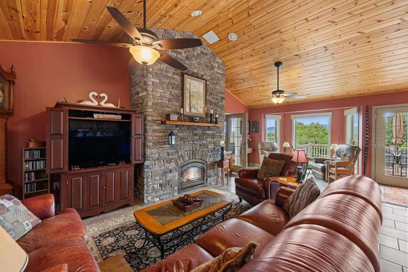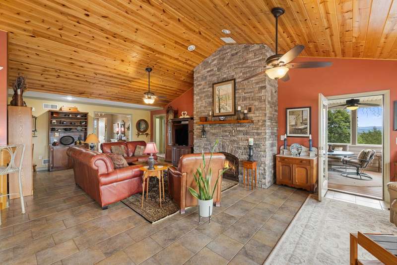 Private 6.36-Acre Retreat with Stunning Panoramic Views! This beautifully maintained 3-bedroom, 2-bath home offers the perfect balance of comfort, functionality, and privacy. Ideal as a full-time residence or peaceful getaway, the home features a spacious open floor plan with a cathedral wood ceiling, a striking stone gas fireplace, and large rear-facing windows that showcase breathtaking views. Enjoy the warmth of wood and tile flooring throughout, an inviting kitchen with informal dining area, and a generously sized laundry room with pantry. The screened-in porch and composite deck provide perfect spaces to relax or entertain while taking in the serene natural surroundings. Heating and cooling are covered with a heat pump, mini split, and pellet stove, ensuring year-round comfort. The solar system installed in 2019 has generated enough power for the home to eliminate an electric bill since installation. A full unfinished basement offers plenty of storage or future expansion potential. The property includes a 2-car attached garage, a large 24' x 32' detached garage/workshop, and an additional 12' x 20' outbuilding—perfect for hobbies, tools, or extra storage. Beautiful landscaping adds to the charm of this private property.