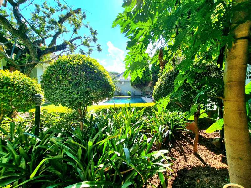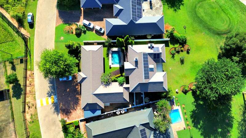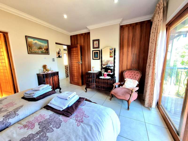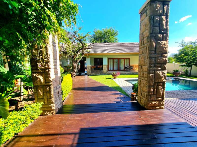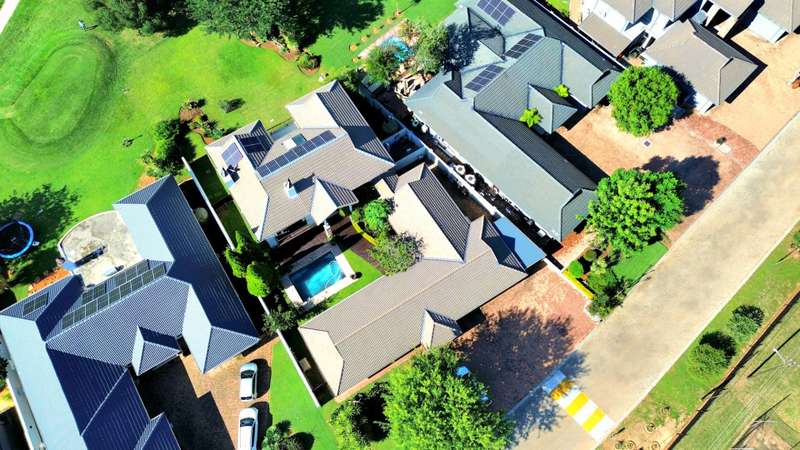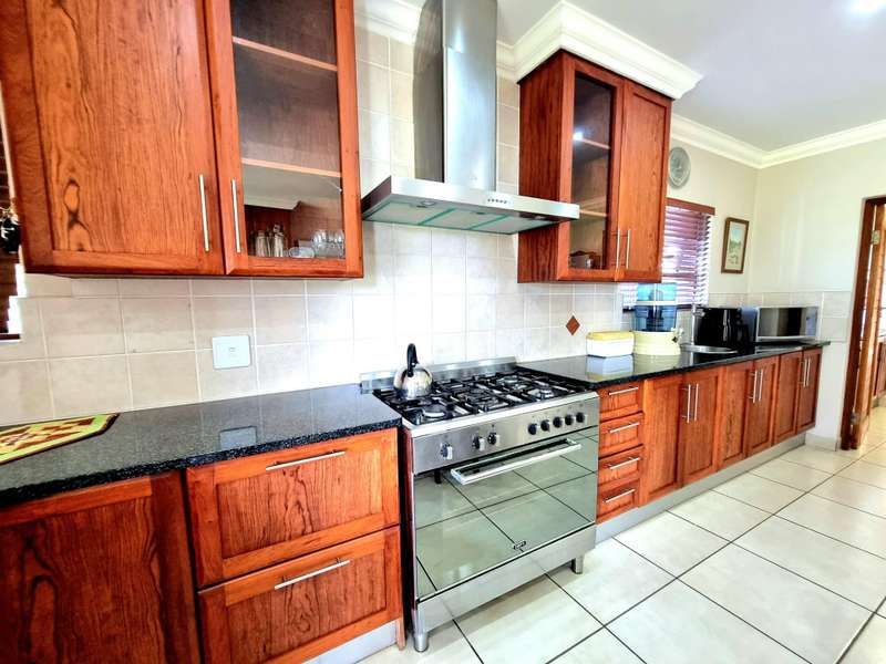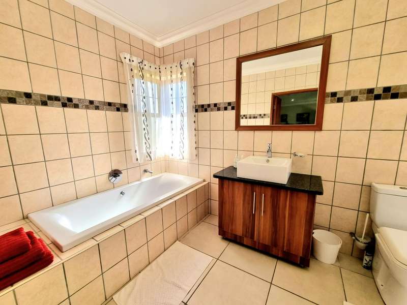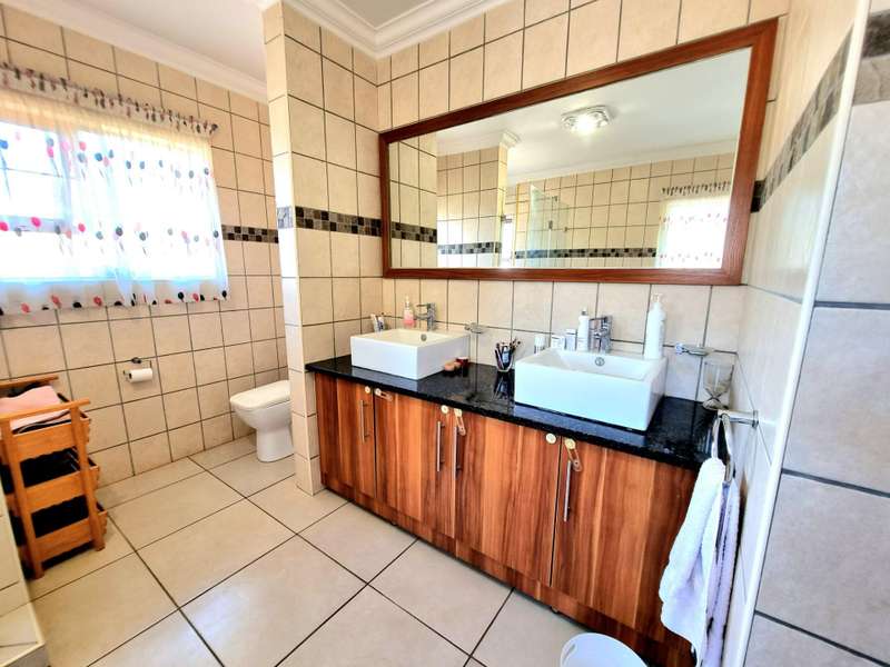 Discover luxury living in Koro Creek Golf Estate with this stunning home perfectly positioned on the golf course, offering breathtaking views. Designed for modern convenience, this home features a solar system with 12 panels and a fully equipped borehole, making it a semi-off-the-grid sanctuary. The property includes three garages and an additional covered carport. As you step inside, you are welcomed by a beautifully landscaped private garden and a sparkling swimming pool, creating a tranquil retreat. To the left of the entrance, a charming granny flat with a full en-suite bathroom opens onto a patio overlooking the pool. On the right, a separate bachelor flat with a bathroom, complete with a shower, toilet, and basin, provides the perfect space for guests, a home office, or additional rental income. Entering the main house, a grand double-volume entrance hall and staircase make an impressive statement. The ground floor boasts a spacious open-plan living and dining area, seamlessly flowing into a well-appointed kitchen fitted with a gas hob and electric oven, a large pantry, and a separate scullery and laundry room leading to a private courtyard. The living area opens completely with stacker doors to a patio with breathtaking golf course views. An enclosed entertainment area, also accessible through stacker doors, features a built-in braai and prep area, blending indoor and outdoor living effortlessly. Upstairs, a second living area with air conditioning leads to a balcony, providing a peaceful space to unwind. The three spacious bedrooms all open onto balconies with stunning estate views. The main bedroom boasts a luxurious full en-suite bathroom, while the remaining two bedrooms share a Jack-and-Jill bathroom with a shower, basin, and toilet. This exceptional home is truly one of a kind and a must-see. Contact me today for more information or to schedule a viewing!