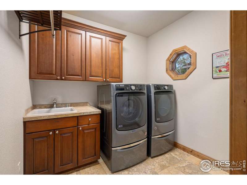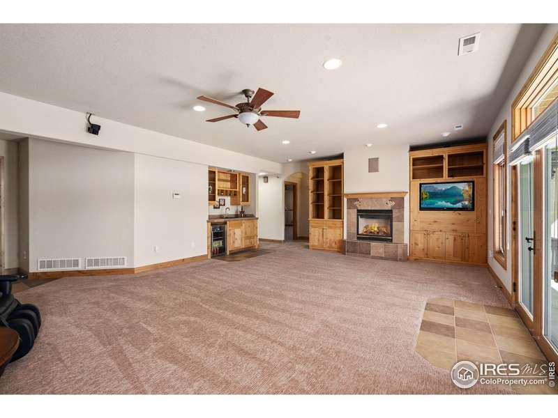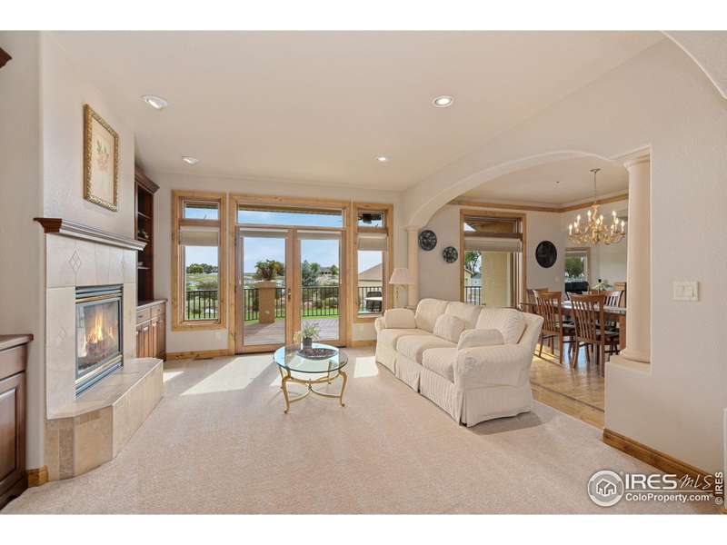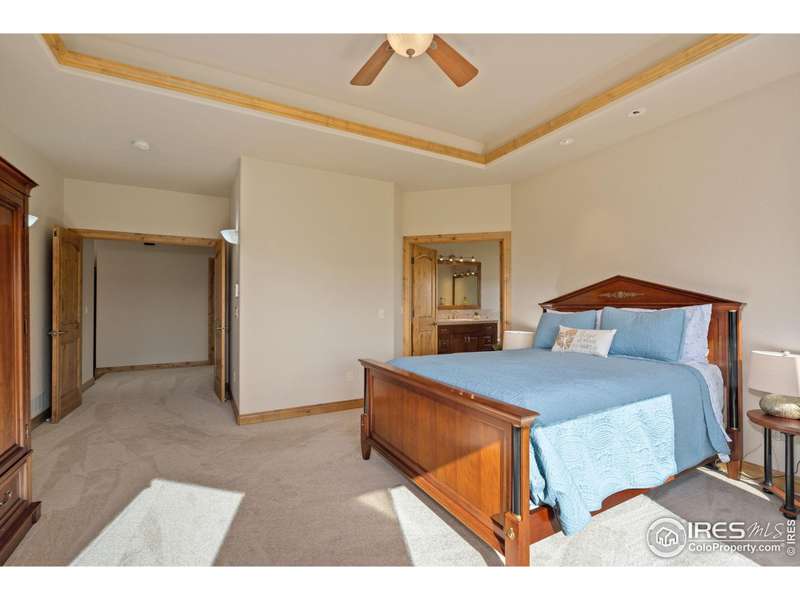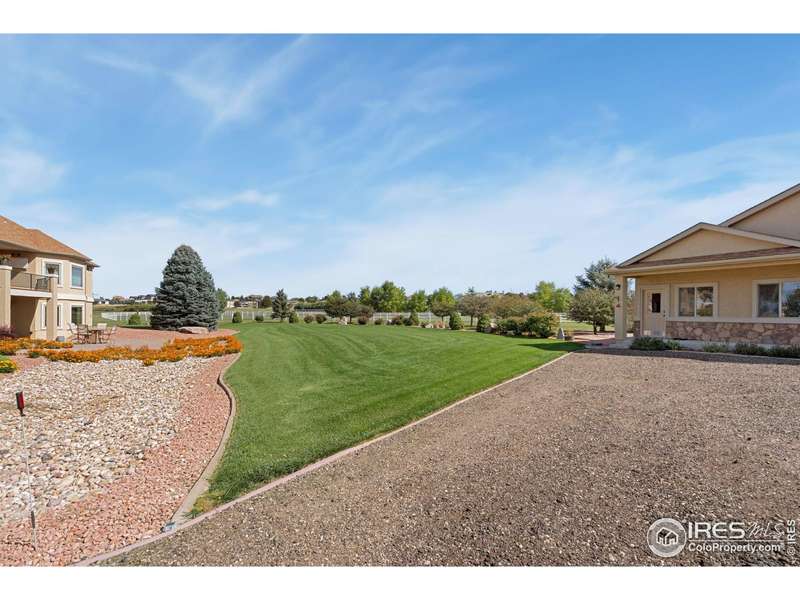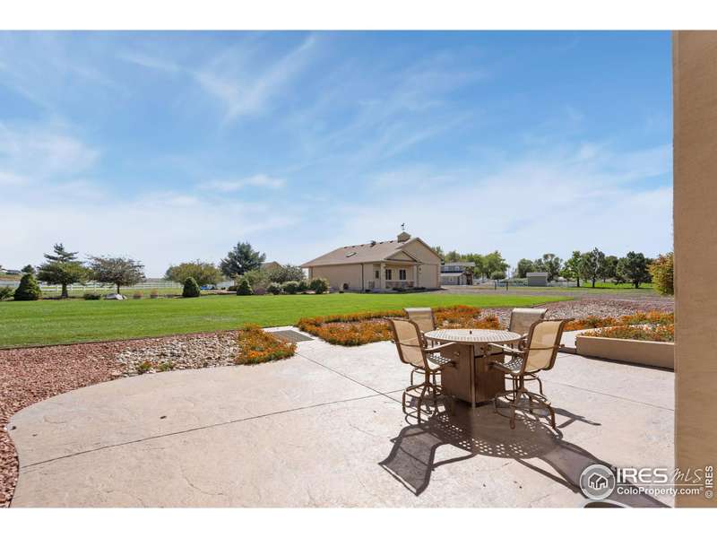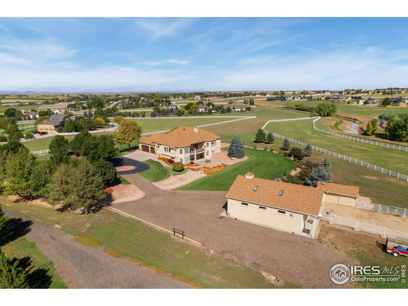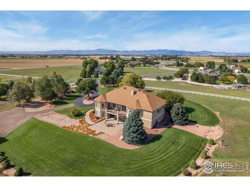 Located on over 5 acres in a gated cul-de-sac community, this property combines quality craftsmanship with superb maintenance. The home features hardwood inlay floors, arched doorways, solid wood doors, and abundant windows showcasing mountain and plains views. The finished walkout basement includes a wet bar, fireplace, and flexible living space, and the primary bathroom offers heated floors for comfort. Outdoor living is maximized with multiple patios and decks, mature landscaping with LED night lighting, and HOA-provided irrigation for crops or pasture. The barn is equipped with box stalls and a heated shop, ideal for equestrian or hobby use, with direct access to community horse trails, arena, and pedestrian paths. The garage is fully finished with epoxy flooring, and the home's condition reflects true pride of ownership-single owner, meticulously maintained, and move-in ready. Every window captures a view, creating a bright and inviting interior throughout. This property offers an exceptional combination of amenities: equestrian facilities, gated privacy, extensive outdoor spaces, and a residence that lives like a show home. A rare opportunity in a premier setting.