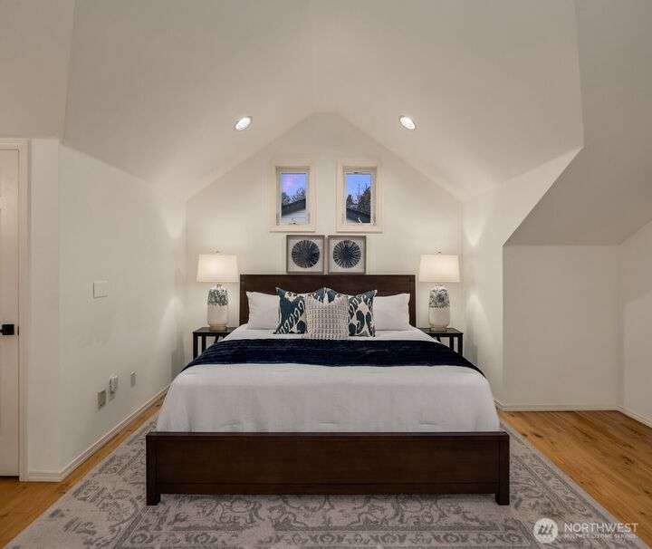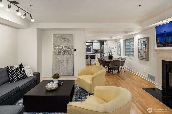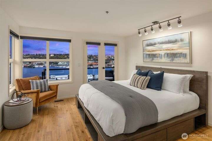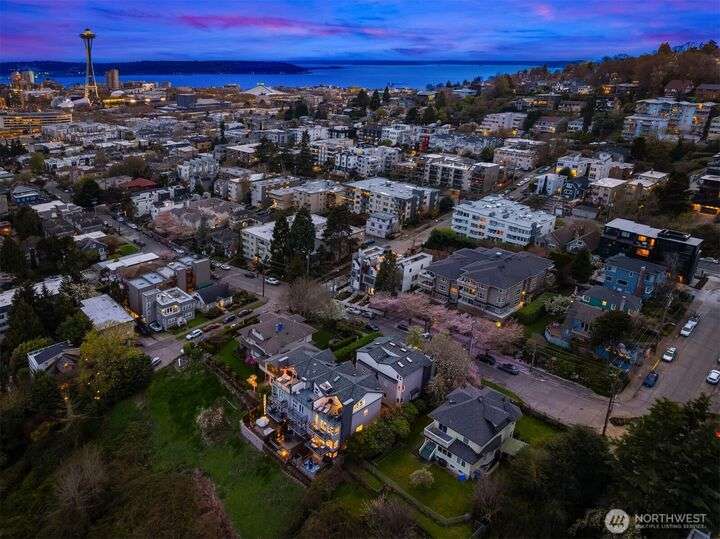 Sweeping views of Lake Union, Downtown, & Cascades can be enjoyed on four levels in this stunning end-unit townhome high on the east slope of Queen Anne. Natural light moves throughout the home & open-concept main living area is perfect for entertainment. Terraces on each level, including a spectacular rooftop area with sublime 180 vistas. High-end kitchen features stainless appliances, large pantry & expansive bar. Owners’ suite has private balcony & 5-piece spa-like bath with a jetted tub; 2nd guest bedroom w/ ensuite bath. Large top-floor bedroom has a dramatic vaulted ceiling, wet bar, & is exceptionally bright. Bonus home office/workout area w/ private patio + rare attached 2-car garage. Walk to vibrant SLU for work, shops, & dining.
