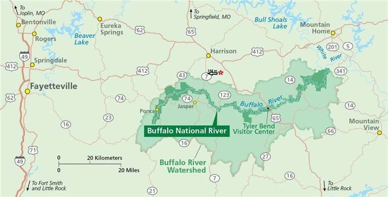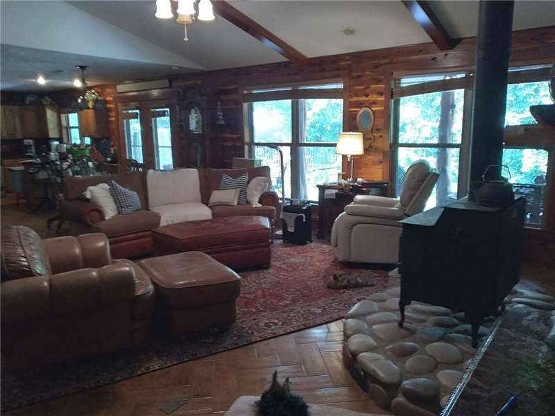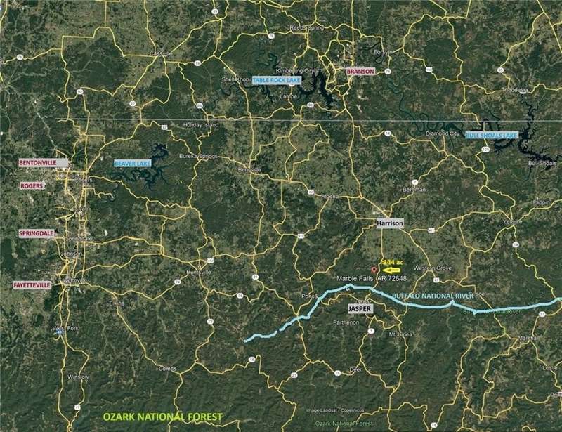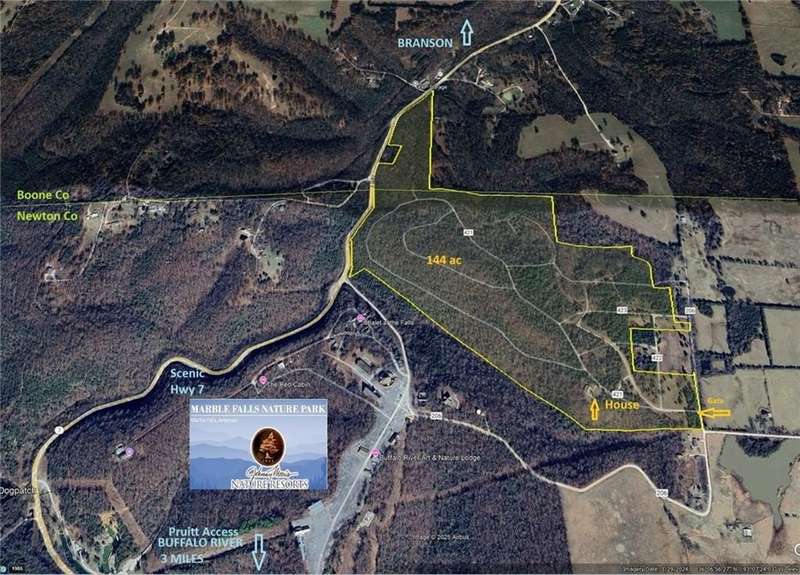 Beautiful custom log home built 2005 features ceramic tile, wood burning stove with creek rock hearth, central HVAC, vaulted living room ceiling, cover front and back porches running entire length of home, 2 car garage and jacuzzi tub in master bathroom. House sits on beautiful development acreage located in the heart of the Ozarks' Boston Mountains. South boundary adjacent to old Dogpatch and Johnny Morris' planned Marble Falls Nature Village in Newton County. Acreage plotted for development with partially completed new graveled interior roads and other old roads throughout. Perfect for development with older roadbeds established along benches. Nice flat pasturelands 10% and sloped timberland 90% with 1/2 mile frontage on Arkansas' Scenic Highway 7. Great hunting! House rental income 16,800/yr. Can also be bought as development acreage, see MLS 1311651.