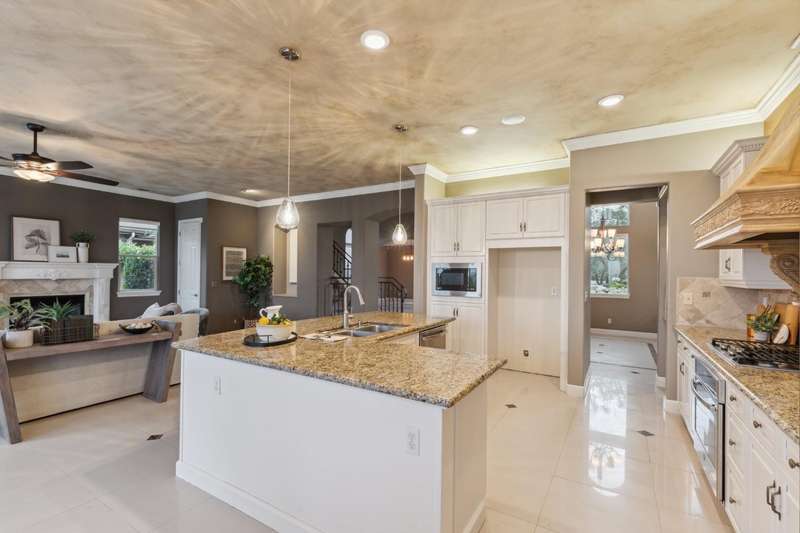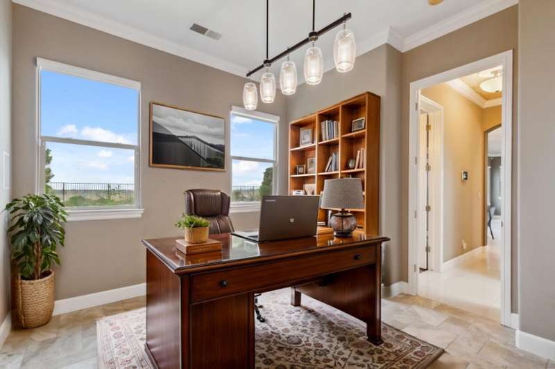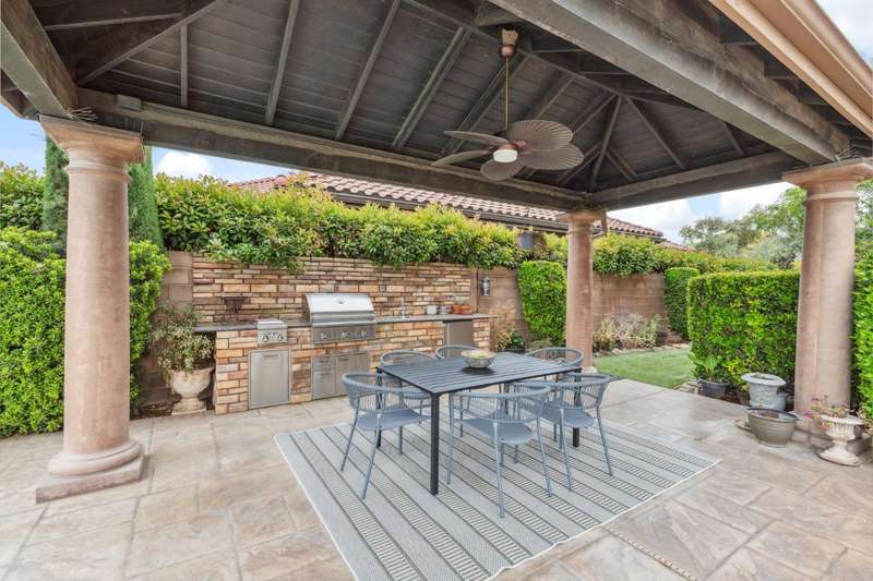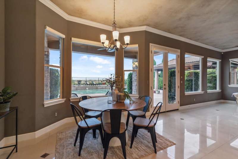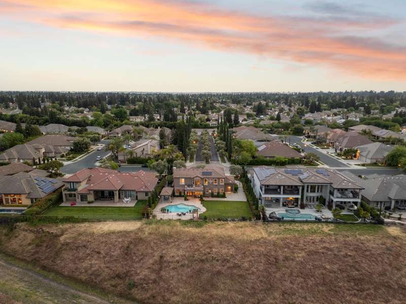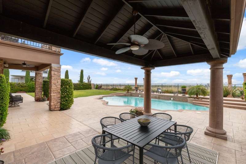 OWNED SOLAR! Ask your agent for a list of upgrades.. Spectacular McCaffrey custom home in the exclusive Bellaviera neighborhood, offering panoramic views of the Bluff, Lake San Joaquin River, Sierra Nevada mountains, and sparkling city lights. Enter through olive tree-lined cobblestone paths into a masterpiece of craftsmanship - soaring vaulted ceilings, large porcelain tile with stone inlay, wrought iron stair rails, and Dentil style crown molding & other custom features throughout. The gourmet kitchen features custom cabinetry, granite countertops, a convenient island breakfast bar, and a custom crafted range hood. The primary suite opens to a private balcony, the perfect spot to take in the breathtaking scenery. Designed for entertaining, the backyard showcases a built-in BBQ island, sparkling pool with a waterfall, majestic lion water features, and a charming gazebo dining area. Additional highlights include OWNED SOLAR, two heat pumps, RV/Boat parking, electric car charger, surround sound, and a lot size of nearly 1/3 acre. A rare blend of luxury, function, and unforgettable views - truly one of a kind!
