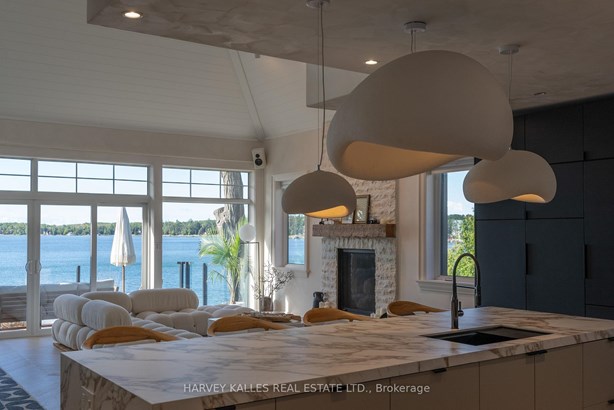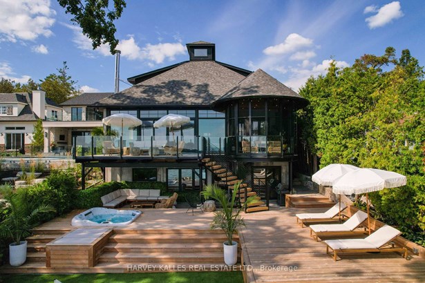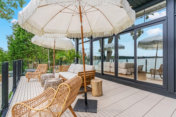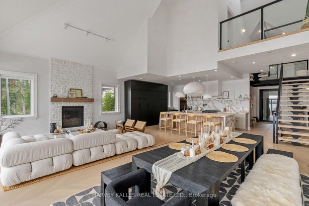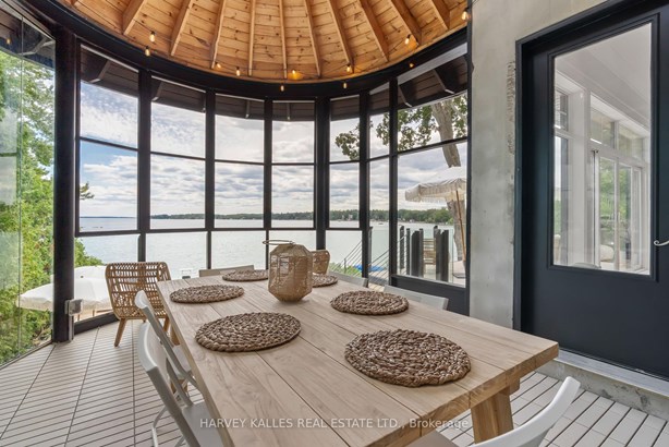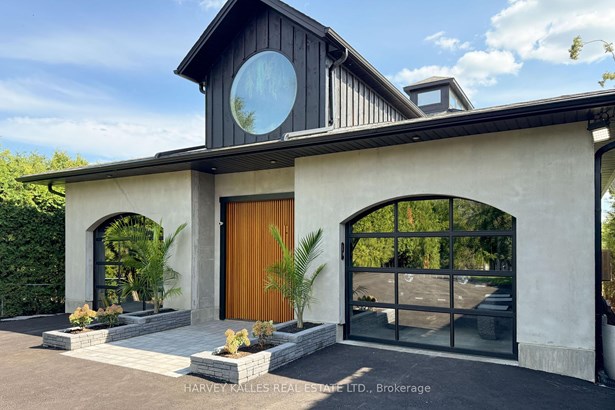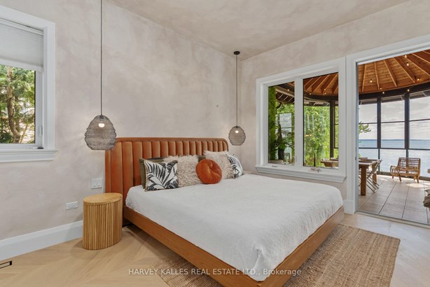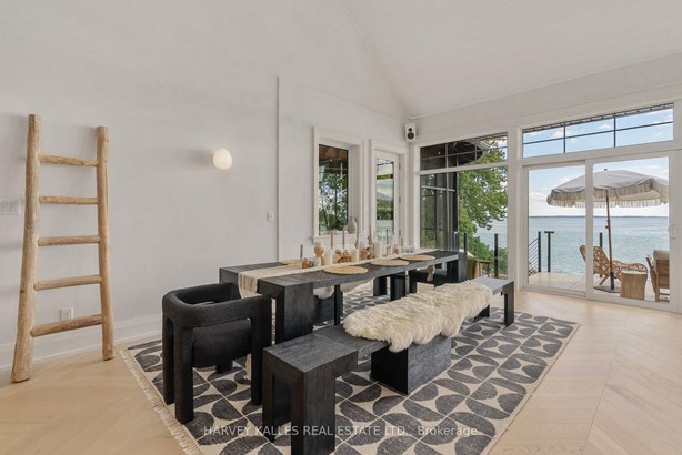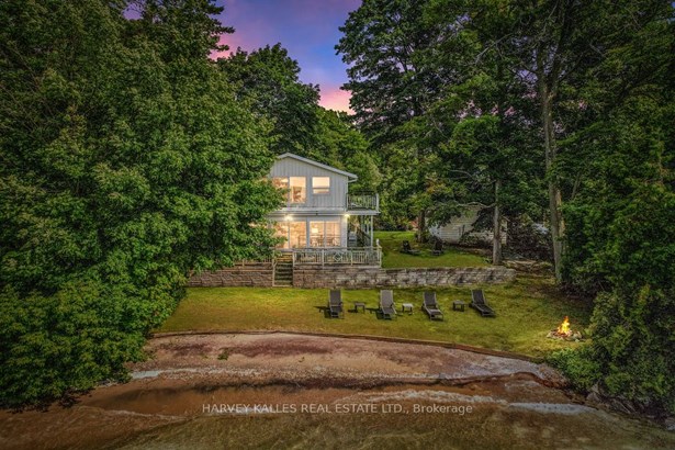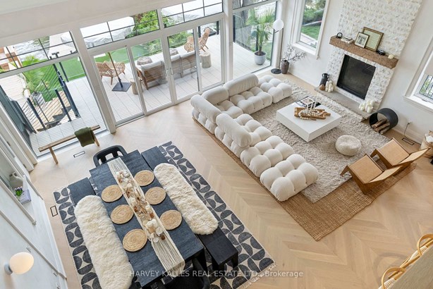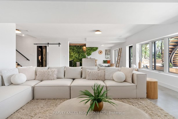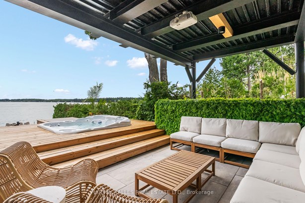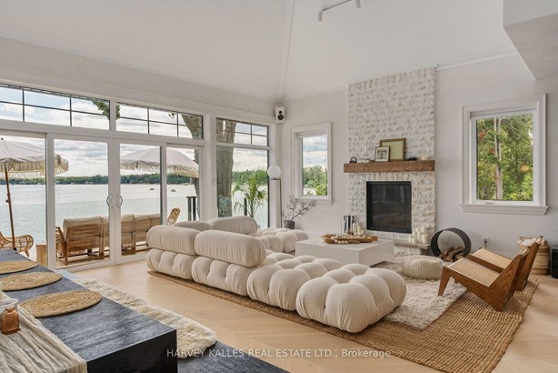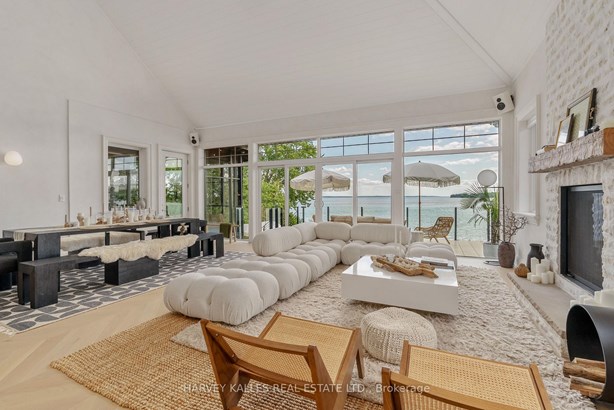 A rare architectural luxury waterfront residence blends concrete, glass, steel, and warm wood to create a one-of-a-kind Boho-modern retreat. Privately set off one of the finest sought after lakefront streets in Innisfil on Lake Simcoe, the home opens with a grand custom wood entry door into a dramatic space with polished concrete floors and soaring 20-foot ceilings layered in custom hung chandeliers. Walls of floor-to-ceiling glass and accordion-style doors blur the line between indoors and out, flooding the home with natural light and showcasing unobstructed lake views.A floating wood staircase /glass railings and custom finishes throughout reinforce the homes refined modern aesthetic. The gourmet kitchen is a showpiece with bespoke cabinetry, a large waterfall centre island, full service butlers pantry, and designer lighting. The expansive great room, with vaulted ceilings and statement fireplace, serves as the heart of the home framed by wall to wall south-facing windows capturing a panoramic lake view. Resort-style outdoor living is second to none. A two-story screened-in porch with glass, walk out to terrace lead to tiered entertainment spaces: a sun deck, custom wrought-iron stairway, built-in wood fire pit, hot tub, covered lounge areas, boathouse and putting green. Flagstone steps provide a gentle slope to the waters edge for seamless lake access.The lower level was designed for entertaining, featuring a recreation room with bespoke paneling, a backlit glass staircase, spa-inspired bath, and a concrete sit-up bar. With five bedrooms and multiple living and lounging areas, this property offers unparalleled space for family and guests.A truly rare offering modern design, resort amenities, and a world-class waterfront lifestyle converge in this extraordinary estate. ONE OF A KIND SHOWS A 10!