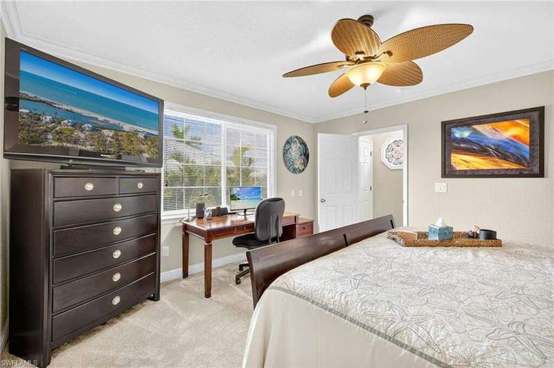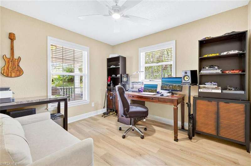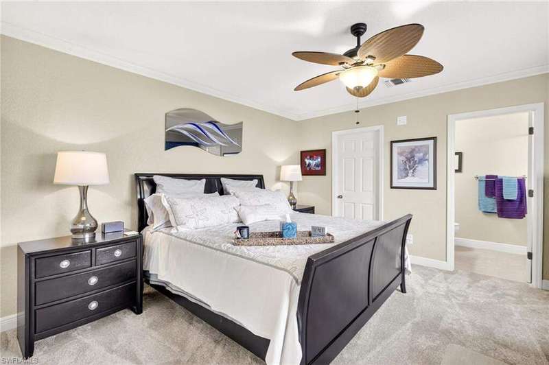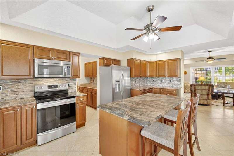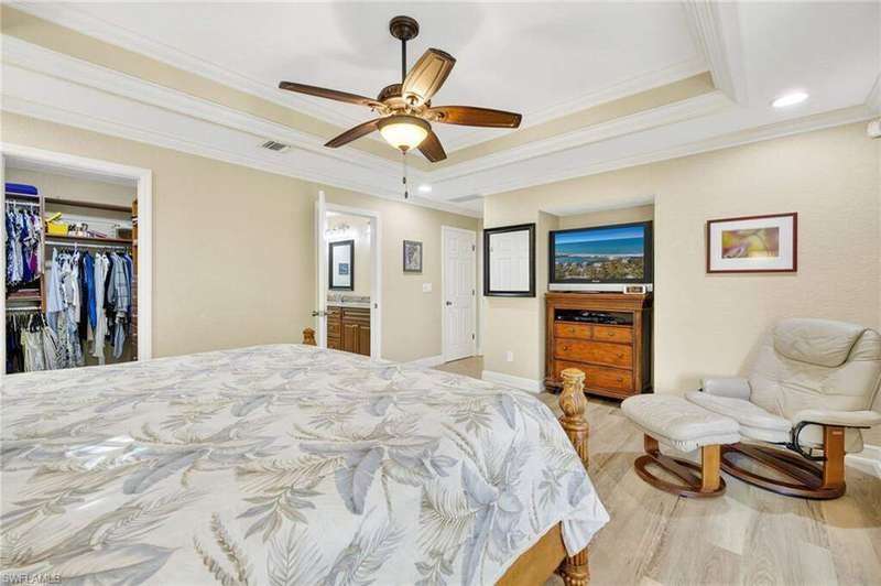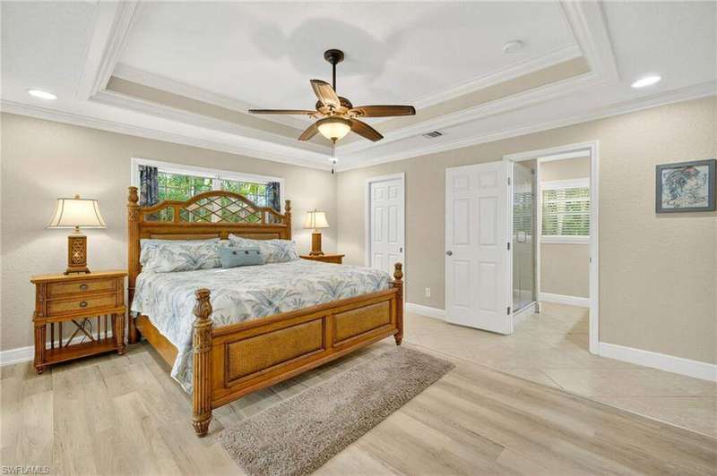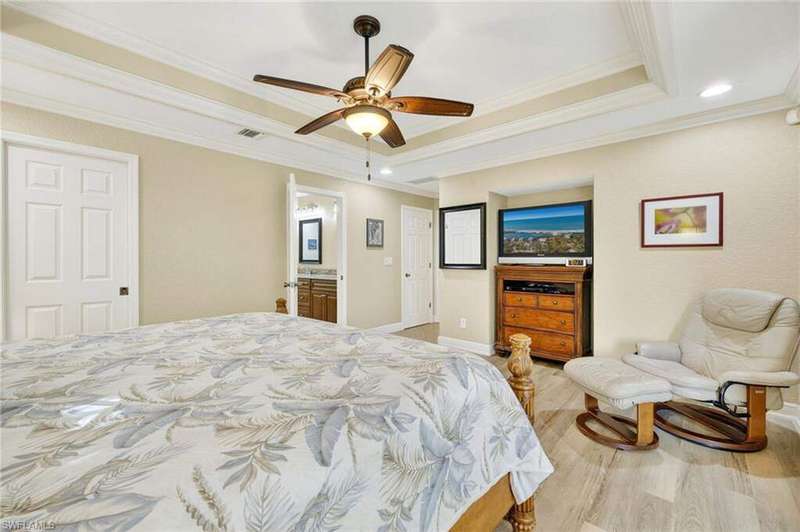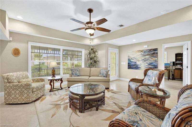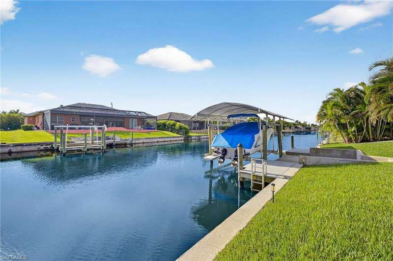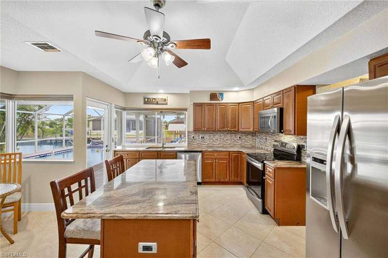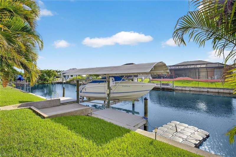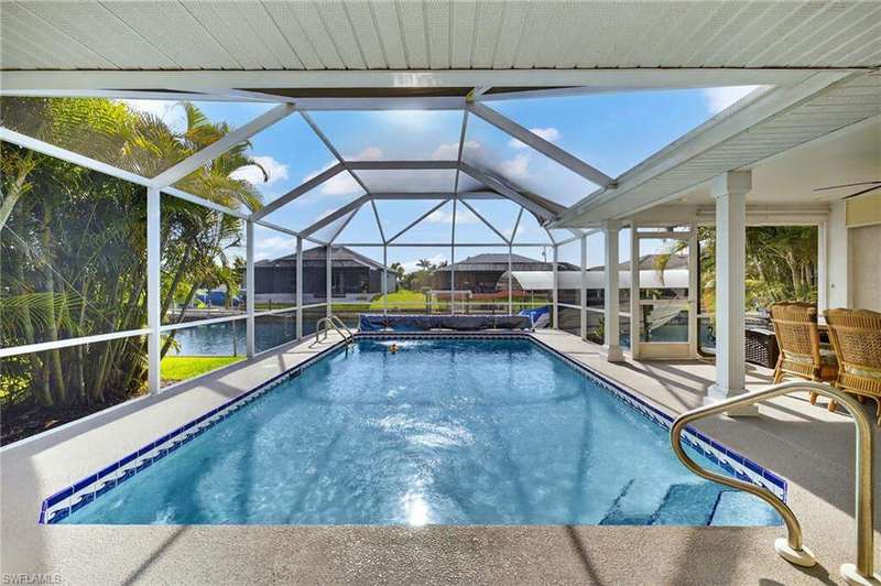 Welcome to this beautifully maintained Key West-style Gulf access pool home located in one of Cape Coral's most highly sought-after neighborhoods. This unique property offers 4 bedrooms, 3 bathrooms, and 2,228 square feet of living space, making it the perfect opportunity for families, seasonal residents, or investors. Thoughtfully designed with both comfort and function in mind, the home features a rare dual-primary layout with two spacious master suites-one on the main level and one upstairs-offering flexibility for multi-generational living or guest privacy. Three of the four bedrooms are en suites, each providing their own private bathroom. The heart of the home is a large chef's kitchen, complete with granite countertops throughout, abundant cabinetry, custom pantry shelving, and generous prep space for entertaining. The main living and wet areas showcase 18" designer tile laid on the diagonal, while all main-level bedrooms have been upgraded with luxury vinyl flooring. Additional interior upgrades include custom closet organizers and a dedicated generator switch at the meter. Outdoors, enjoy the Florida lifestyle with an expansive screened-in pool area, a large outdoor entertaining space, and two under-truss lanais-one off the downstairs master and one off the guest suite-providing peaceful retreat-like areas to unwind. Boaters will love the 10,000 lb boat lift with 2022 canopy, composite dock, and paver steps leading to the seawall for easy waterfront access. The home also features a durable metal roof, a hurricane-rated garage door, a freshly painted exterior and front porch, and transferable flood insurance for added peace of mind. This home has never flooded, offering rare security and peace of mind in a waterfront property. With its unique Key West styling, prime location, and blend of charm and functionality, this move-in-ready home truly offers the best of Southwest Florida living. Don't miss this one-of-a-kind opportunity!