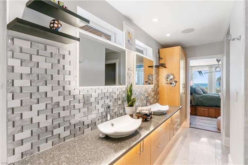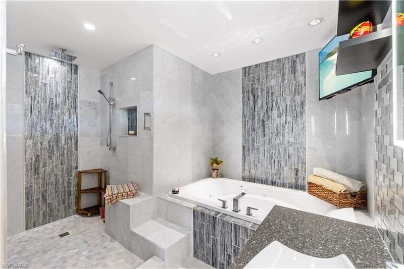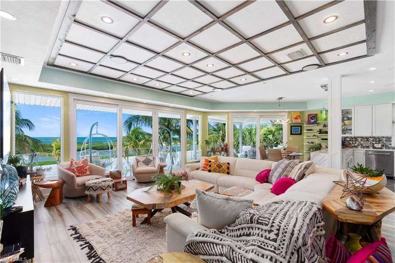 Beautifully renovated direct beachfront home on South Estero Island with breathtaking Gulf views! Sits on a rare stretch of beach with an ultra-private backyard with no passersby to be seen, providing optimal privacy. This 4 bed/4.5 coastal delight has been completely remodeled and features a NEW METAL ROOF, Generac whole house generator (2021), 2 new HVACS (2020), new instant water heater (2020), hurricane impact windows/sliders throughout, and new interior staircase. Step outside onto your open-air wraparound balcony and enjoy endless views of the turquoise waters of the Gulf of Mexico. Stunning chef's kitchen contributes to the wide-open floor plan and offers custom-built white cabinetry, gorgeous white quartz countertops, waterfall island, walk-in pantry, and new high-end Jenn-Air appliances (2020) including double ovens and induction cooktop. The spacious primary bedroom is a tranquil haven with floor to ceiling windows/slider to fully indulge in the Gulf views and has a spa-like bath with dual vanities, large jetted soaking tub, and separate walk-in shower with multiple shower heads. The top floor is perfect for a private guest wing or an extra bonus room with an ensuite bathroom and top floor sun deck for picture-perfect sunsets over the Gulf. Just steps from the beach, your outdoor oasis awaits - featuring a fenced-in heated saltwater pool and spa, along with a brand-new summer kitchen ideal for poolside dining and sunset entertaining. Other features include a Lutron lighting system, Savant sound system upstairs, tile flooring, and coffered ceiling details. This is a fantastic vacation home or investment opportunity located in a weekly rental zone allowing for maximum rental income if desired! Perfectly situated on the coveted South-end of Estero Island near Lovers Key, Bonita Beach & the South bridge to the mainland with dining and shopping walking distance.