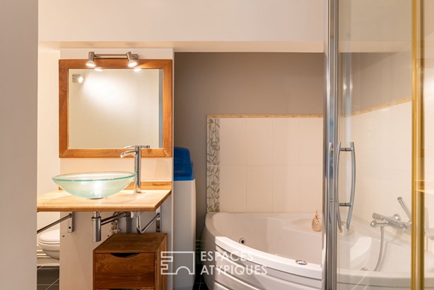 The entrance opens onto a first bedroom and a separate area with a toilet. Upstairs, a bedroom with its own bathroom invites privacy.