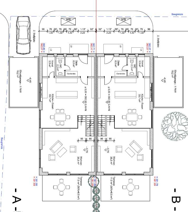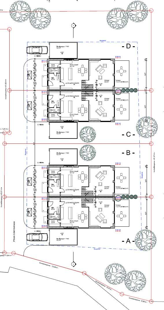 Start of construction soon: Four modern semi-detached houses with garage in one of the most beautiful locations in PA-Grubweg. The four houses all have the same layout and consist of two floors each. Daily life takes place on the first floor. A large and bright cooking, living and dining area forms the center of the house. From here, you can also access the garden, which in turn borders a wooded area. The first floor also has an office (or guest room), a WC, a hallway and a storage/technical room. The two children's bedrooms and the master bedroom with dressing area are located on the upper floor. The spacious, almost 10m² bathroom has everything you would expect from a modern bathroom. There is also a further storage room on this floor. The living space will be approx. 130m². The additional usable area is approx. 27m². The offer corresponds exactly to the needs of a modern family and accordingly offers enough space. The exact separation of the plots, allocation of parcel numbers and property surveying will take place in the course of the notarization of the purchase contract. All details are currently still approximate and may change, e.g. for construction reasons. The current building description corresponds to the content of an earlier but directly comparable construction project. Completion of construction is planned for Q4/2024. The energy certificate will also be issued then.