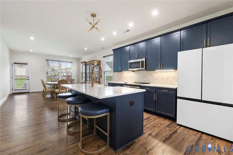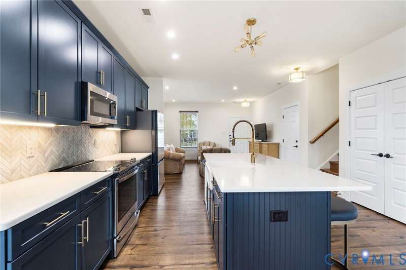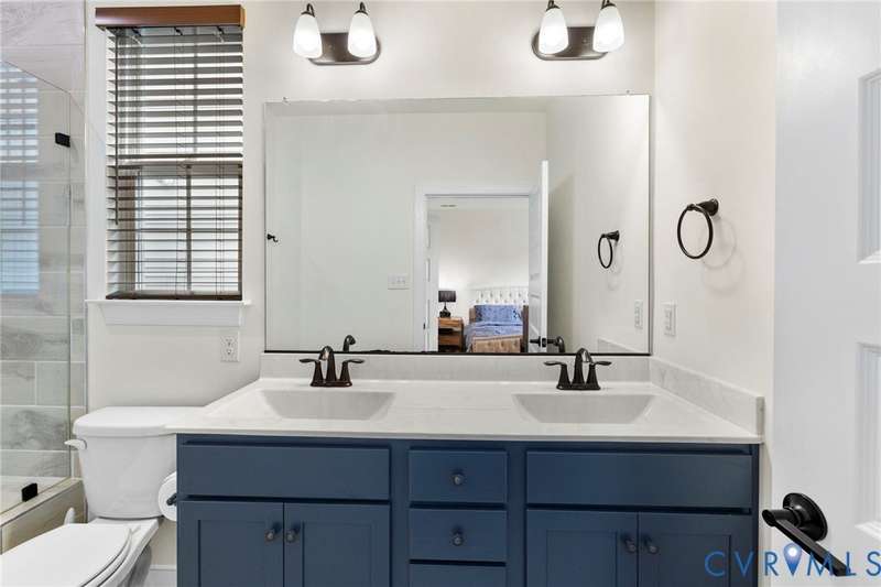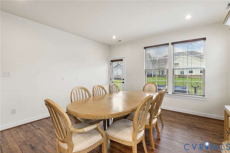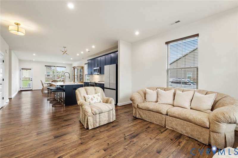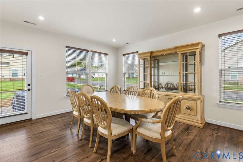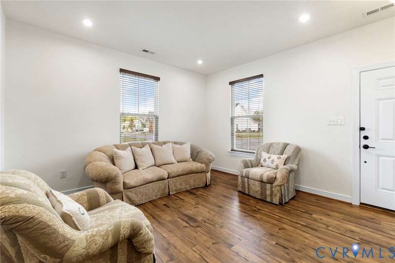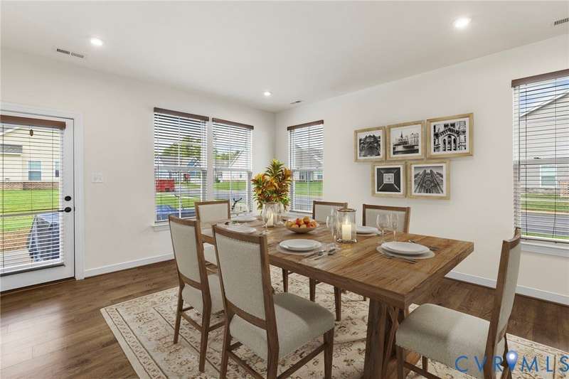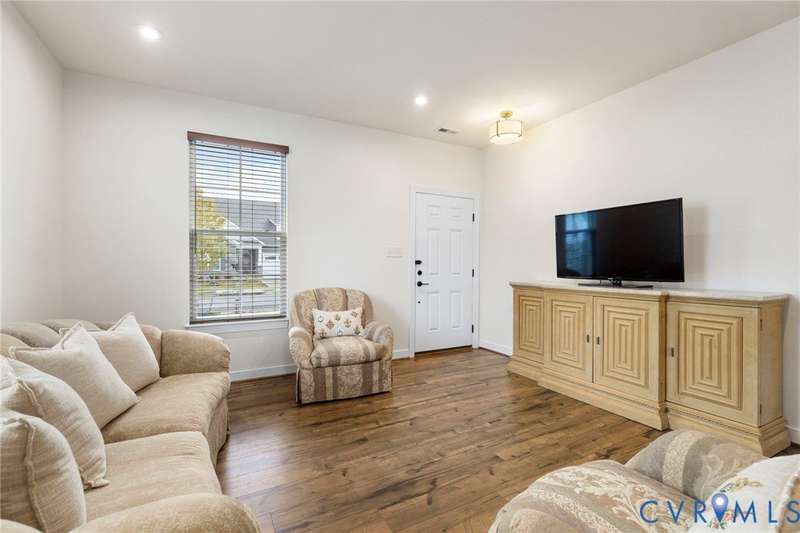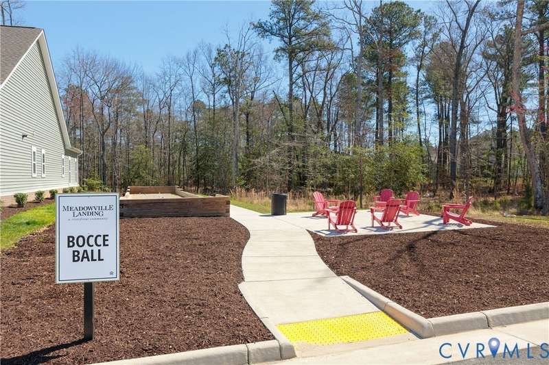 Welcome to beautiful Twin Rivers at Meadowville Landing where landscaping is taken care of, so you can enjoy the community amenities WITHOUT THE HASSLE OF YARDWORK! This gorgeous two-story home is packed with style and thoughtful upgrades, offering 3 bedrooms, 3 full baths, and nearly 1,700 sq. ft. of inviting living space. Perfectly positioned on a corner lot, it combines curb appeal with comfort inside and out. Step inside and feel the difference-wide-plank flooring runs throughout, leading you into an open layout designed for today's lifestyle. The family room is light-filled and spacious, flowing right into a show-stopping kitchen where every detail shines. Quartz counters, a beadboard island, farmhouse sink, 42""Â? cabinetry, under-cabinet lighting, and a stunning tile backsplash make it a dream for both everyday meals and entertaining. The first-floor primary suite offers true retreat status with its spa-inspired bath featuring dual vanities, decorative tile, a frameless glass shower door, and a walk-in closet you'll love. Another bedroom and full bath on this level create the perfect setup for guests or a home office. Upstairs, a private bedroom with its own bath and walk-in storage gives you flexibility to grow. Thoughtful touches are everywhere-raised outlets for sleek wall-mounted TVs, LED lighting, ceiling fan prewires, and an insulated garage package with opener already in place. Even the staircase has been upgraded with wrought iron balusters for a custom touch. Outside, a 15x10 patio and spacious backyard set the stage for summer cookouts, gardening, or simply relaxing under the stars. All of this in a community you'll love-packed with amenities including clubhouse, fitness center, pool, playground, pickle ball, bocce ball and sidewalks throughout connecting the areas of Meadowville Landing! Convenient access to I-295. Upgraded, move-in ready, and absolutely beautiful-this one is too good to miss! (Some photos are virtually staged)