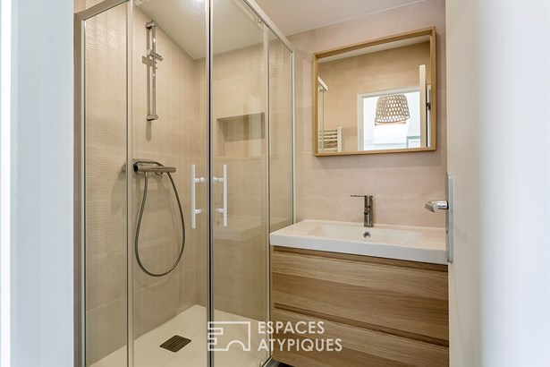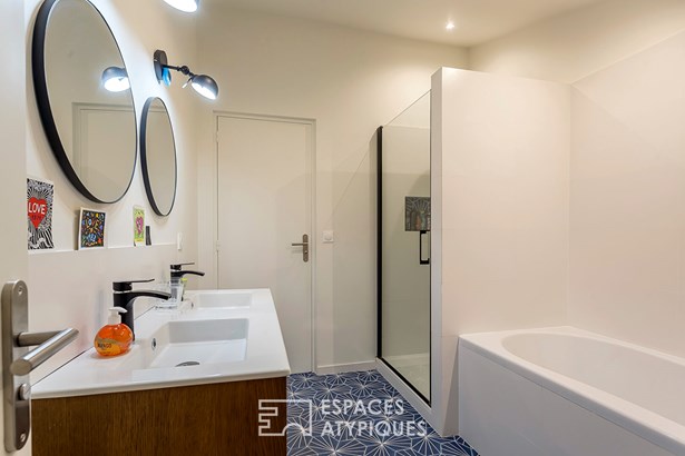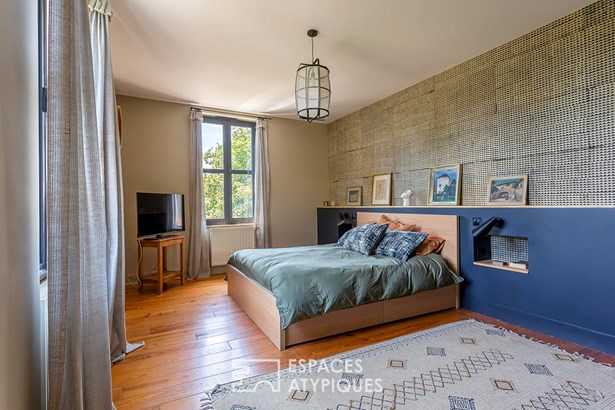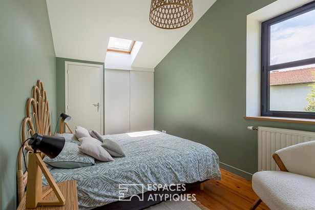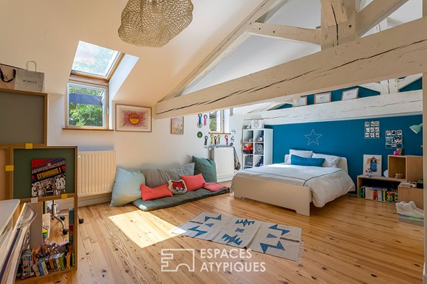 On the same level, a light-filled office completes the ensemble. The upper floor, intended for the sleeping area, consists of a master suite, two large children's bedrooms sharing a bathroom and a guest bedroom with a private bathroom. A large semi-buried cellar of 130 sqm with laundry room completes the whole.