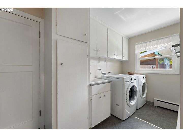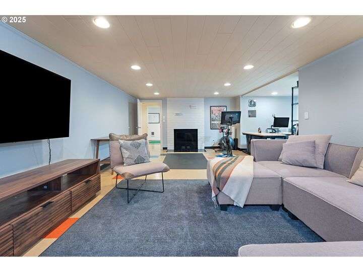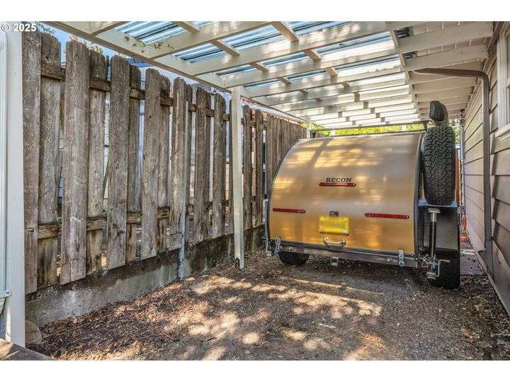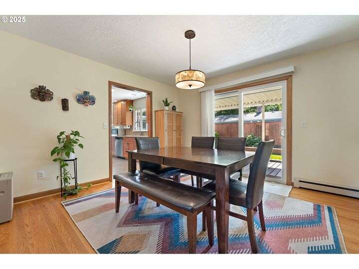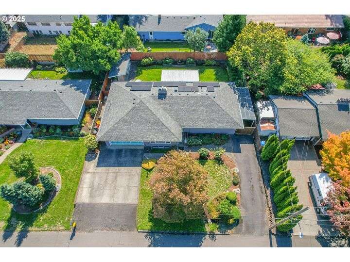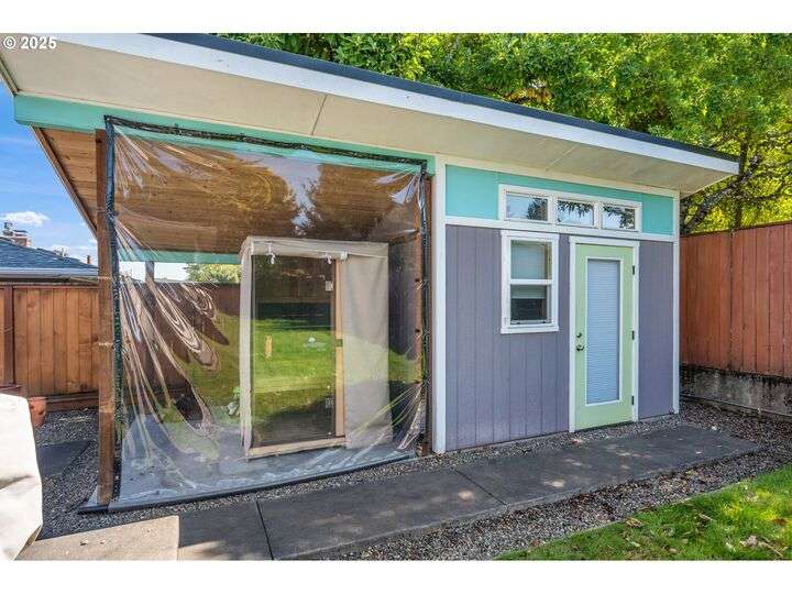 Classic 1958 Mid-Century in the sought after Glendoveer neighborhood. The main floor offers original hardwood floors throughout. A spacious living room is centered around the large picture windows, period fireplace and mahogany paneled feature wall. The adjoining formal dining room provides access to the expansive covered deck and private patio space, perfect for outdoor entertaining. An updated eat-in kitchen offers stainless steel appliances, granite, solid wood cabinets, and a cozy breakfast nook. The bedroom wing provides three bedrooms and two full baths, including the primary suite with a walk-in shower. The half bath and separate laundry room with additional storage completed the main floor. The lower level provides space for a large family/bonus room with a second fireplace, storage and a separate private office area. The home is situated on a beautifully landscaped 0.20 acre fenced lot with a second driveway and covered RV parking. The back yard also offers a studio sized outbuilding with power. Just a short walk to the Glendoveer Golf Course's walking trails and onsite restaurant. Mechanical updates include newer heat pump and mini-split HVAC system, PEX plumbing, solar attic fan, newer windows and a new solar power system. [Home Energy Score = 7. HES Report at https://rpt.greenbuildingregistry.com/hes/OR10041592]