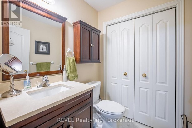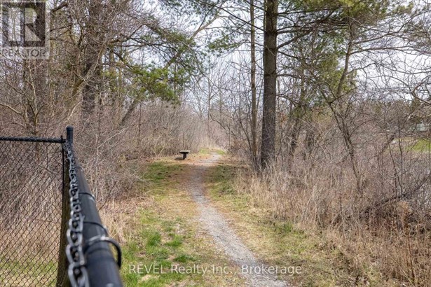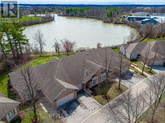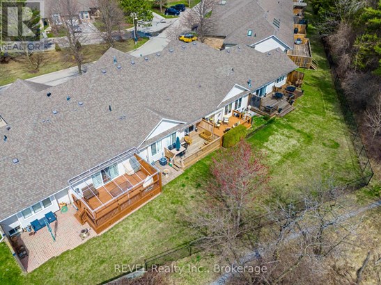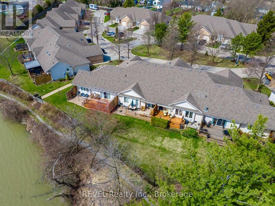 Welcome to this meticulously cared-for brick bungalow in Glen Brooke Estates, offering 1,360 sq ft of elegant main floor living in the heart of Niagara-on-the-Lake. The main level features a bright and spacious living room with cathedral ceilings and a cozy gas fireplace, a separate formal dining room, and a generous kitchen with Corian countertops, built-in dishwasher, and a charming dinette. Sliding doors lead from the dinette to a 20 x 12 wood deck, perfect for relaxing or entertaining. The primary bedroom boasts a walk-in closet and a private 4-piece ensuite. A second bedroom has been thoughtfully converted into a versatile den, study, or home office. There is also a convenient 2-piece bathroom off the dining room and main-floor laundry just off the kitchen. Direct access to the attached single-car garage adds ease and convenience. The finished lower level offers a large family room, a spacious guest bedroom, a 3-piece bathroom, and a substantial utility room with a new high-efficiency Lennox furnace and A/C. Additional features include a dedicated workshop, and storage area. Backing onto city-owned green space and a peaceful municipal reservoir fed by Four Mile Creek, this home combines natural beauty with low-maintenance living. Condo fees cover all exterior maintenance, lawn care, snow removal, building insurance, and water costs. This well-maintained one-story townhome complex is highly sought-after in the vibrant community of Virgil.
