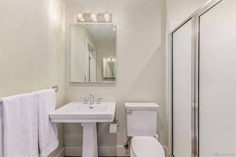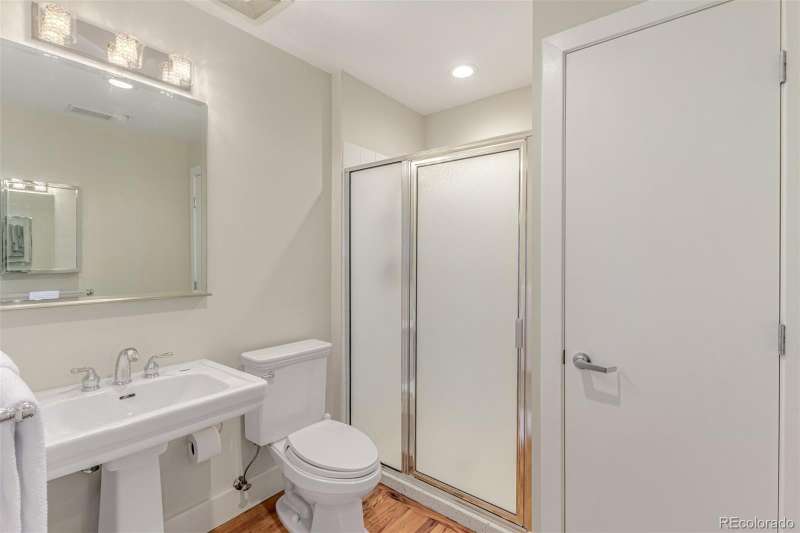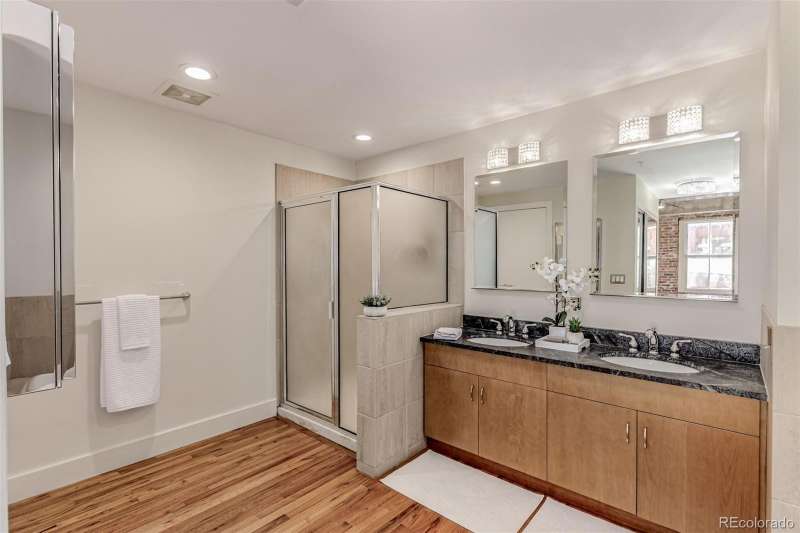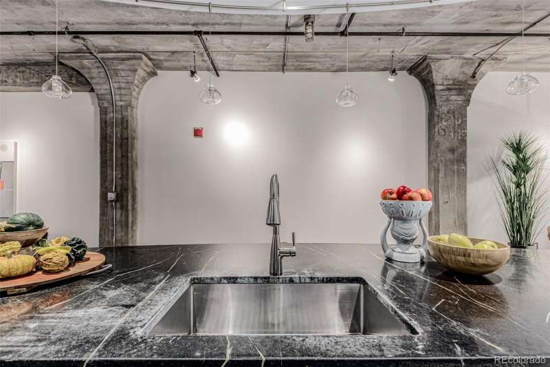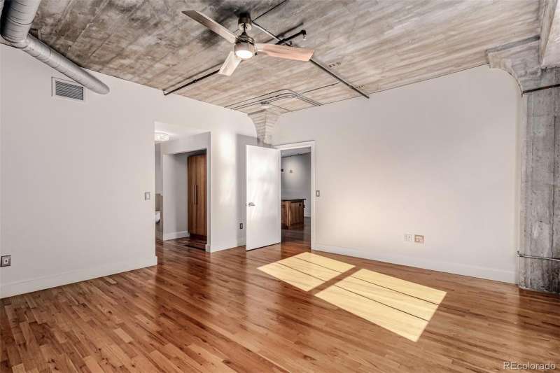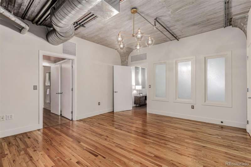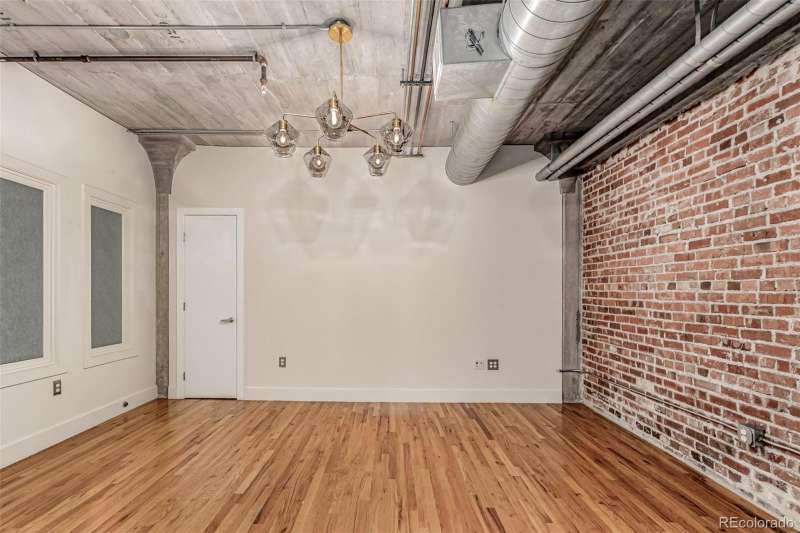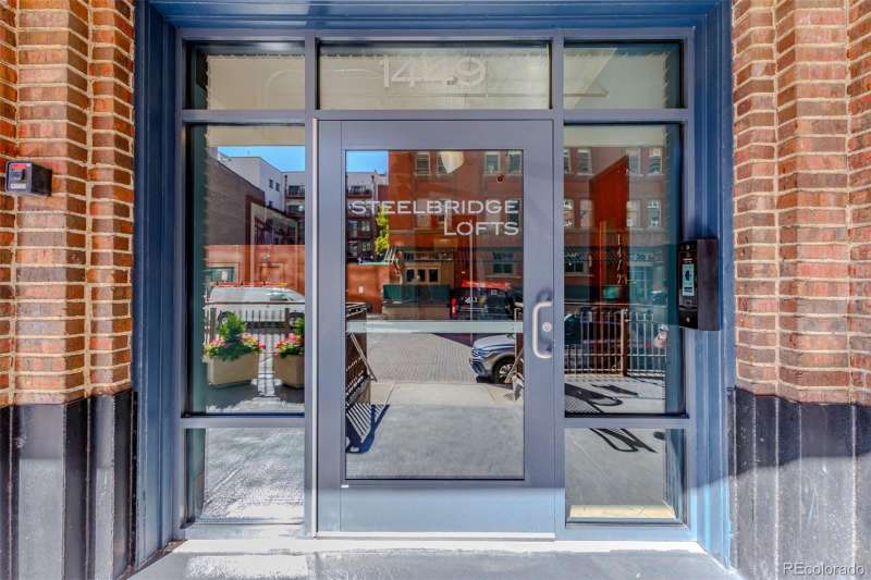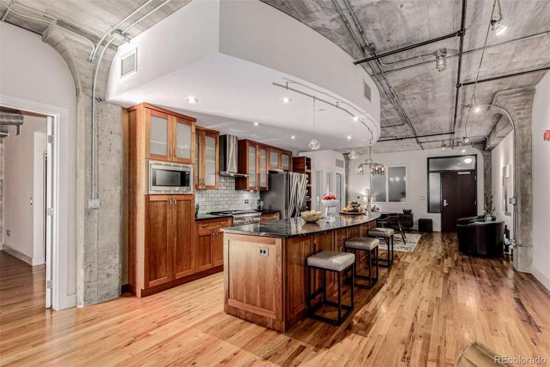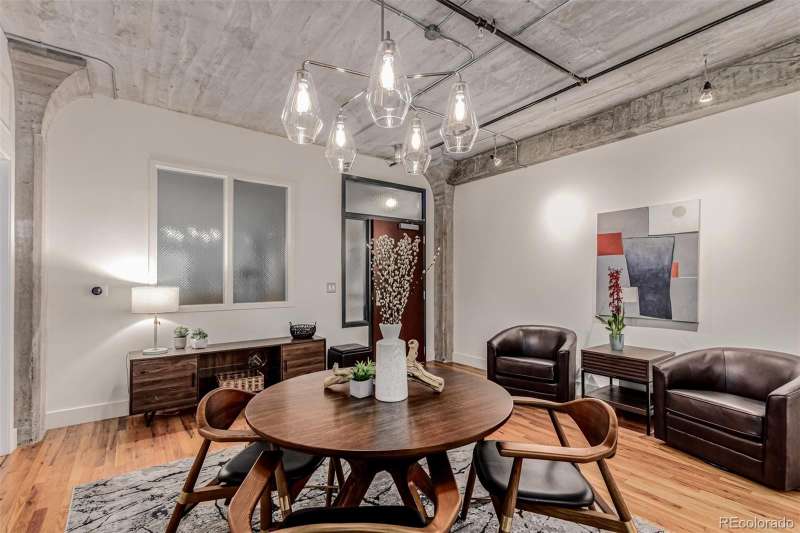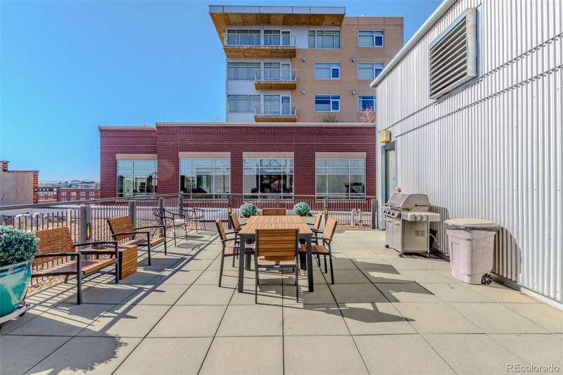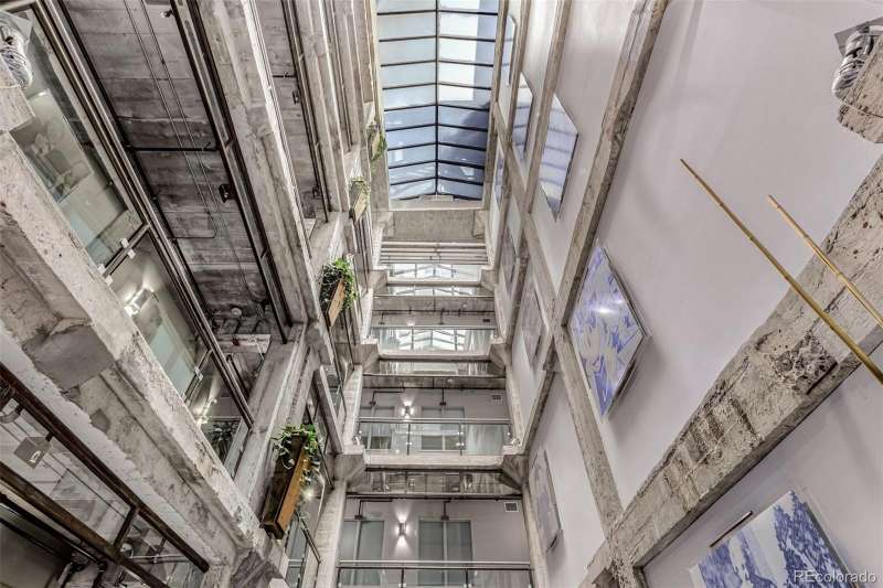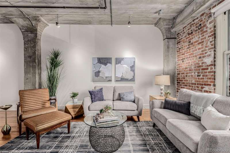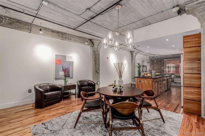 Stunning historic loft in the heart of LoDo! This residence combines character and modern comfort with exposed brick & concrete, high ceilings, and hardwood floors throughout. The spacious eat-in kitchen features a full subway tile backsplash, under-cabinet lighting, Soapstone countertops, and stainless-steel appliances including a refrigerator, gas range with hood, dishwasher, microwave, and beverage refrigerator. Enjoy both a casual dining area and a formal dining space ideal for entertaining. The living room showcases a custom contemporary metal and wood built-in entertainment center. Both bedrooms are fully enclosed a rare feature in a loft offering privacy and quiet. The primary suite includes a luxurious 5-piece bath and two closets, while the second bedroom suite is perfect for guests or a home office. Additional highlights include a side-by-side washer and dryer, two deeded parking spaces, and a personal storage unit. Amenities include central interior courtyard flooded with natural light and a common area roof top deck with BBQ grill, dining table and striking views! Experience the best of downtown living with this stylish and well-appointed LoDo loft in a prime location near Union Station, light rail, Riverfront Park, bike paths, restaurants, DCPA & more.
