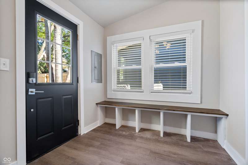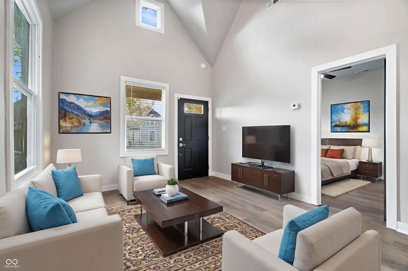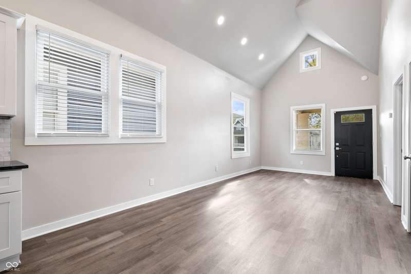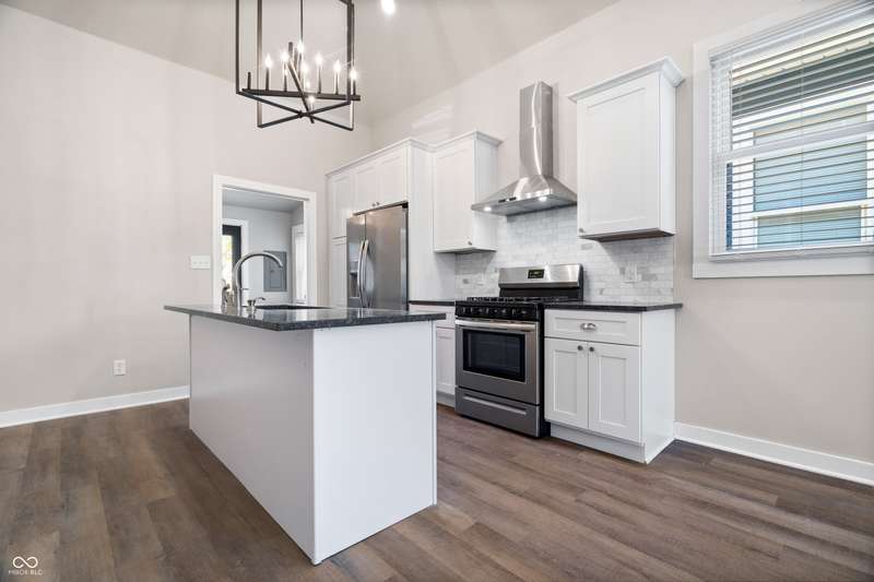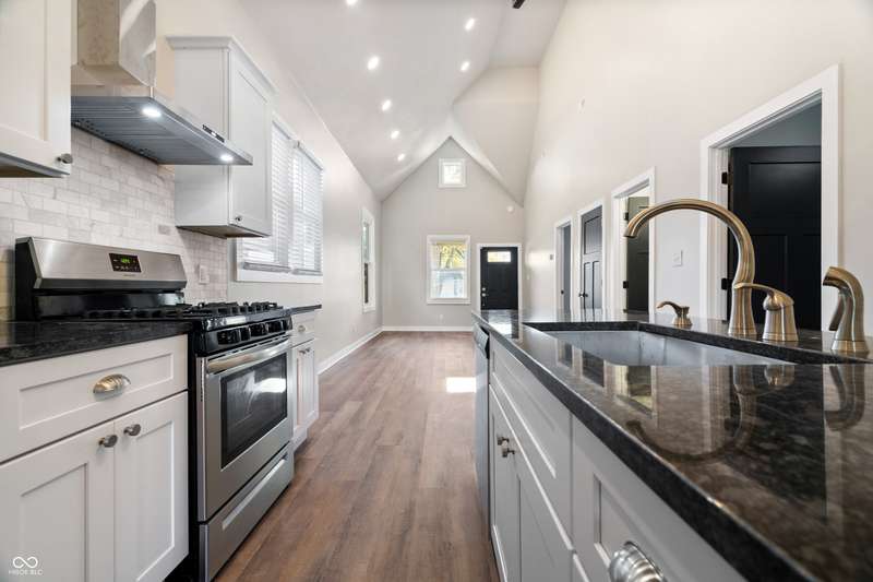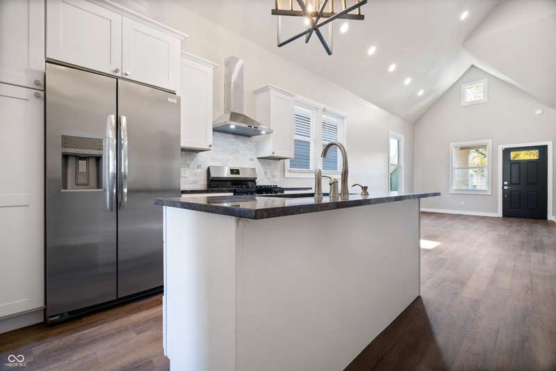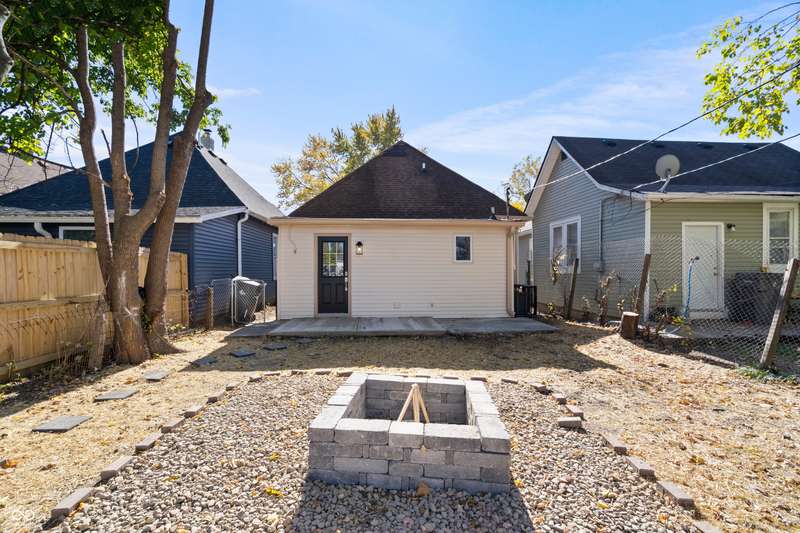 Enjoy the vaulted ceilings in this renovated historic home on Indy's South Side, close to Fountain Square, Garfield Park, and Pleasant Run Trail. Inside you will find open living space and a brand new kitchen with upgraded soft close cabinetry, granite tops, tile backsplash and a center island with breakfast bar. Stainless steel appliances included. The Primary Bedrooms features a large walk-in closet. Ceiling fans in both bedrooms. And a separate laundry room on the main level. New flooring and fresh paint. 8 new windows. New AC and water heater. Covered front porch, back patio, fenced backyard, a parking area and a new fire pit. Get in just in time for the holidays!