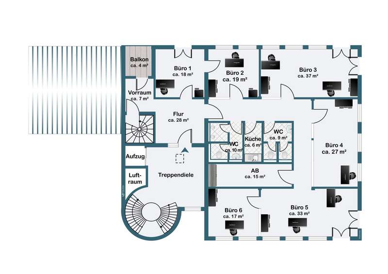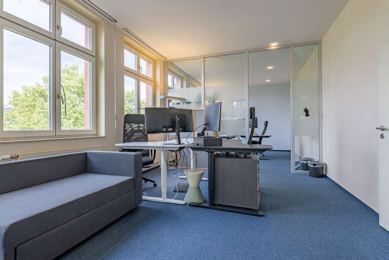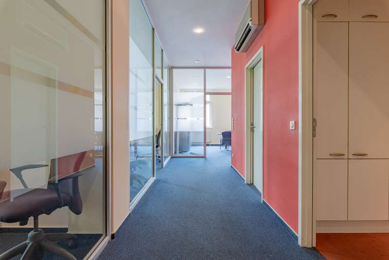 This versatile office space of approx. 230 m² offers you the ideal basis for modern work concepts. The building, which was completed in 1997, is in an established location and impresses with its functional room layout, which allows numerous possible uses for offices or practices. The office unit currently has a total of seven rooms, which can be arranged in a variety of ways thanks to partially integrated glass elements. This variable room layout makes it possible to create spacious group offices as well as smaller meeting rooms or individual offices as required, thus opening up flexibility for your individual usage concept. The bright rooms benefit from a room height of approx. 3 meters and create a pleasant, spacious working environment. Two separate sanitary units for men and women increase comfort for employees and visitors alike. A practically designed kitchenette is available and is ideal for breaks and light refreshments. The building has good transport links, which is a particular advantage for customers and employees. There are several parking spaces on the fenced-in site, some of which are equipped with wallboxes - an important contribution to electromobility in your company. This means that you and your guests always have a safe place to park right next to the building. Access to the office space is easy via the well-kept stairwell and a modern elevator that reliably transports both people and materials. The unit is therefore barrier-free and also suitable for larger teams or customers who require accessibility. An attractive detail is the associated balcony, which offers employees or visitors a welcome opportunity for short breaks outdoors and thus rounds off the working environment. In summary, you will be provided with an office space that impresses with its variable room layout options, practical fittings and good accessibility. The existing technical requirements, such as parking spaces with wall boxes and an elevator, offer you and your employees contemporary comfort. The combination of a well thought-out floor plan and flexible usage options makes this property the ideal base for companies from a wide range of sectors. We will be happy to provide you with further information or arrange an individual viewing. Discover the possibilities that this office space opens up for your business.