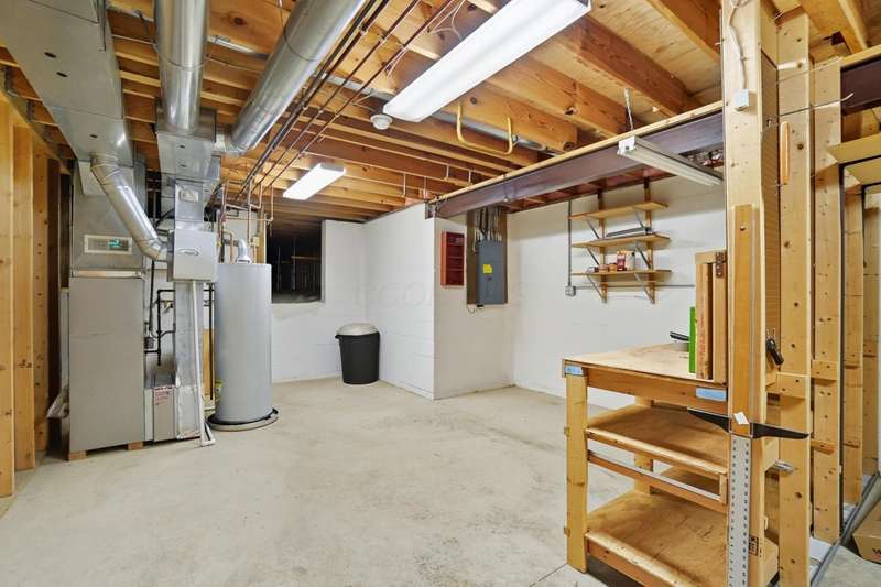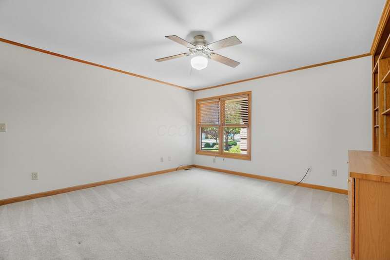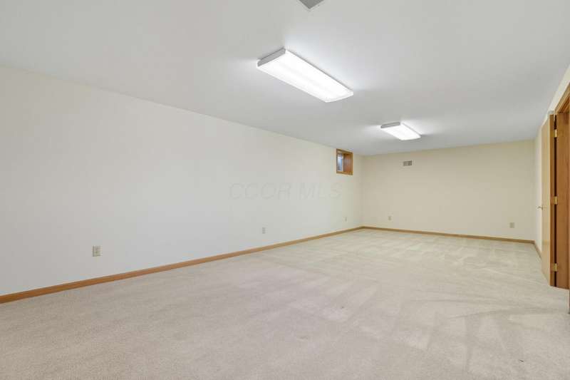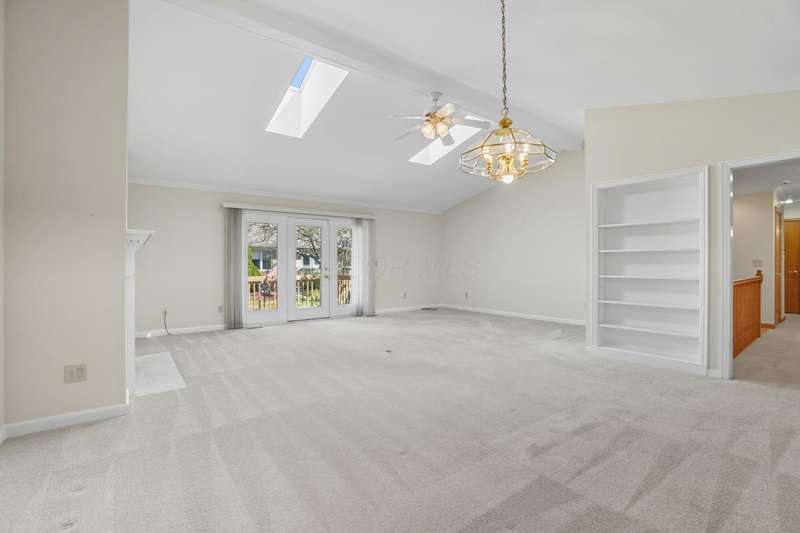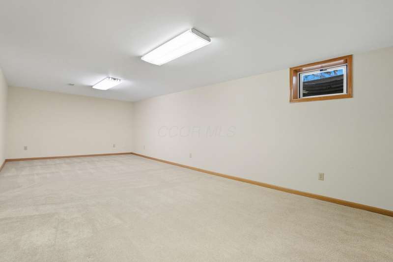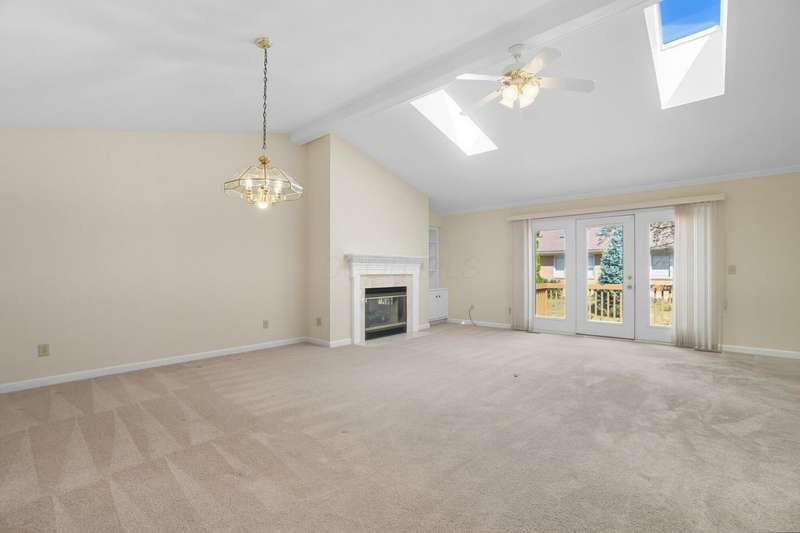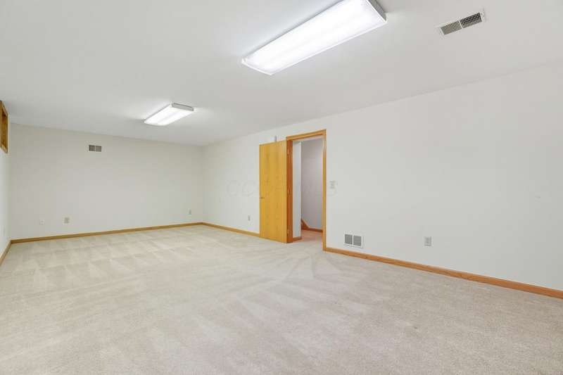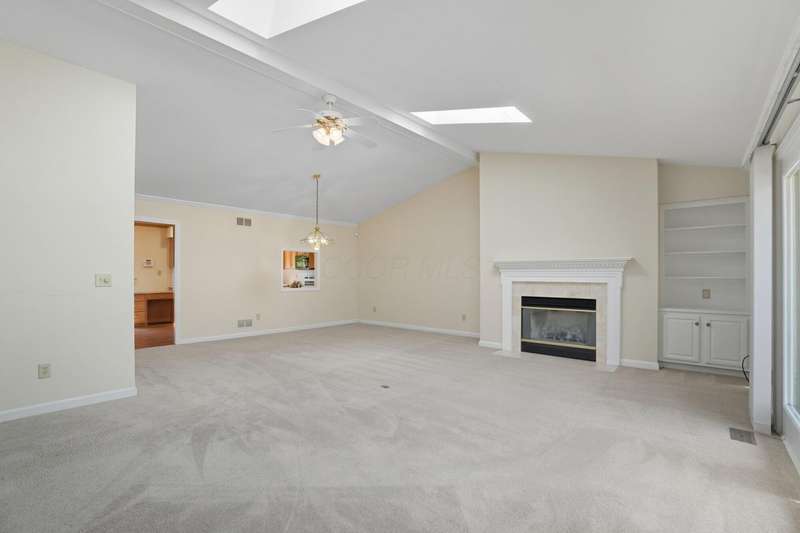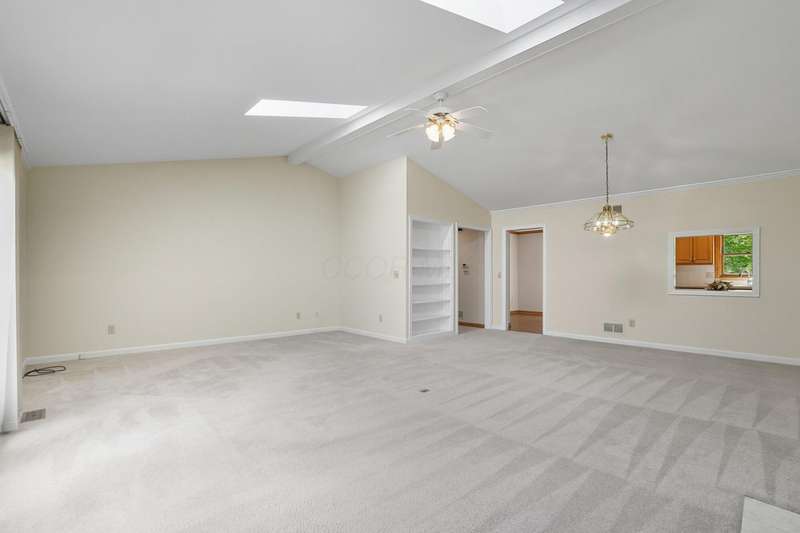 Welcome to this well-maintained, charming ranch home in the quiet and desirable Hayden Falls community of Dublin (Columbus taxes!). Step into a bright, welcoming foyer that leads to a spacious kitchen featuring abundant cabinetry, ceiling fan, and an eating area filled with natural light from large window. The large, open-concept great room boasts vaulted ceilings, skylights, a cozy gas log fireplace, and convenient built-in shelving, perfect for relaxing or entertaining.Retreat to the oversized primary suite with a walk-in closet and a private en-suite bath, complete with a double vanity and walk-in shower.The unfinished side of the lower level contains mechanicals, utility sink, and built-in work bench, as well as storage space and generous shelving. The large finished area in the lower level would be perfect for a rec room, extra bedroom, or work-out space. Additional highlights include a first-floor laundry room near the second full bath with tub, and a flexible bonus space off the 2-car garage entry, ideal for a bedroom or home office Don't miss this opportunity in a sought-after location with easy access to Dublin amenities and lower Columbus taxes!