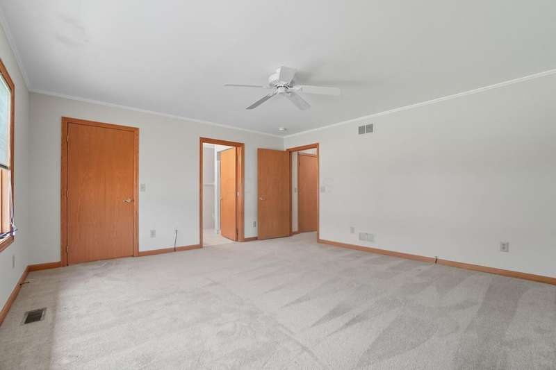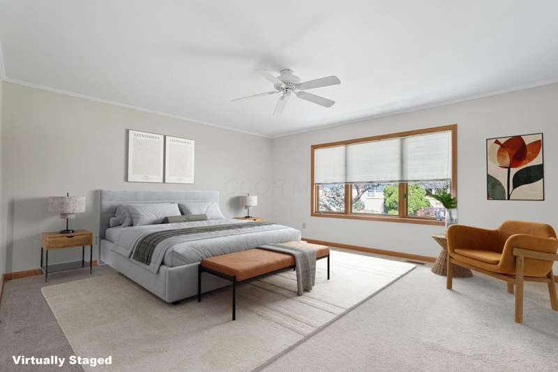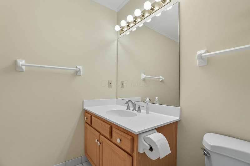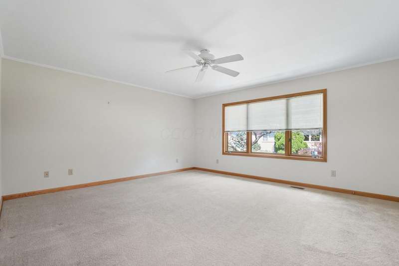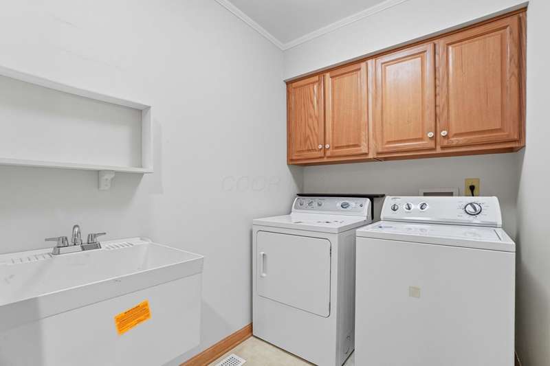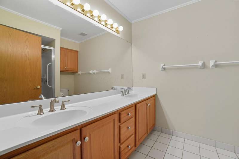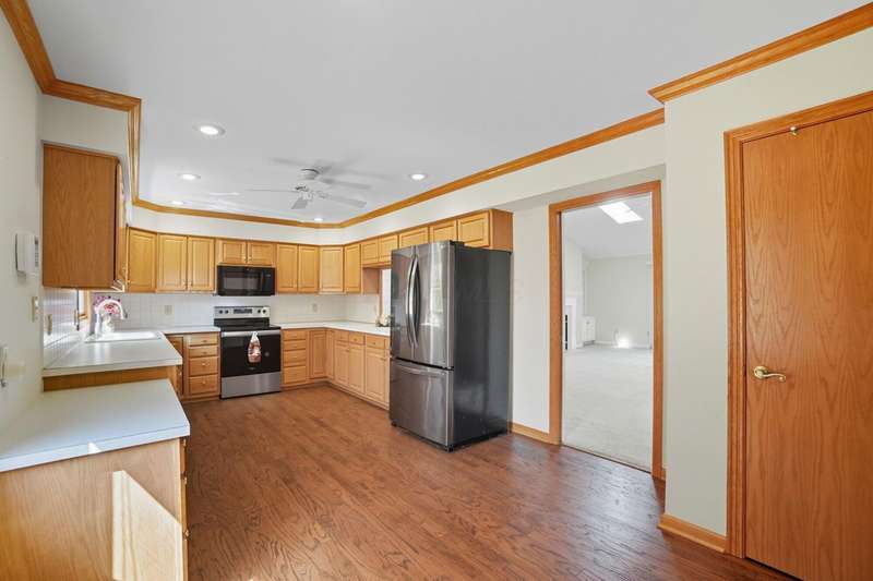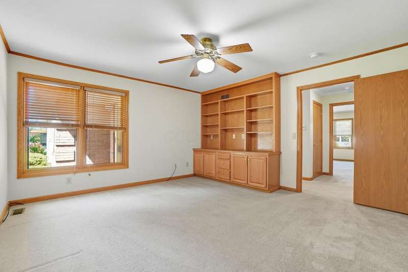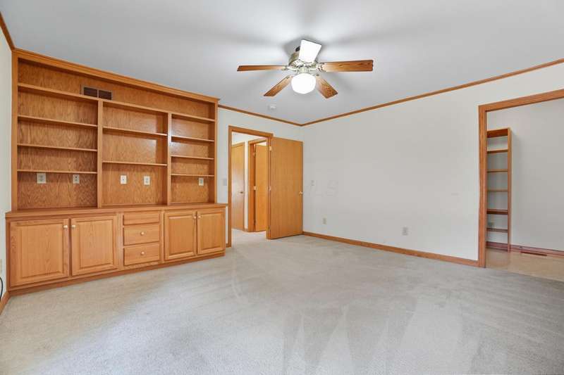 Welcome to this well-maintained, charming ranch home in the quiet and desirable Hayden Falls community of Dublin (Columbus taxes!). Step into a bright, welcoming foyer that leads to a spacious kitchen featuring abundant cabinetry, ceiling fan, and an eating area filled with natural light from large window. The large, open-concept great room boasts vaulted ceilings, skylights, a cozy gas log fireplace, and convenient built-in shelving, perfect for relaxing or entertaining.Retreat to the oversized primary suite with a walk-in closet and a private en-suite bath, complete with a double vanity and walk-in shower.The unfinished side of the lower level contains mechanicals, utility sink, and built-in work bench, as well as storage space and generous shelving. The large finished area in the lower level would be perfect for a rec room, extra bedroom, or work-out space. Additional highlights include a first-floor laundry room near the second full bath with tub, and a flexible bonus space off the 2-car garage entry, ideal for a bedroom or home office Don't miss this opportunity in a sought-after location with easy access to Dublin amenities and lower Columbus taxes!