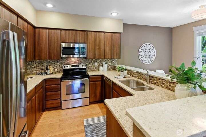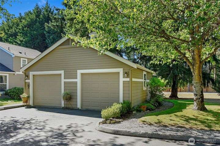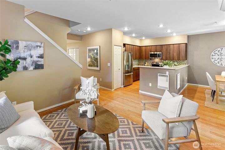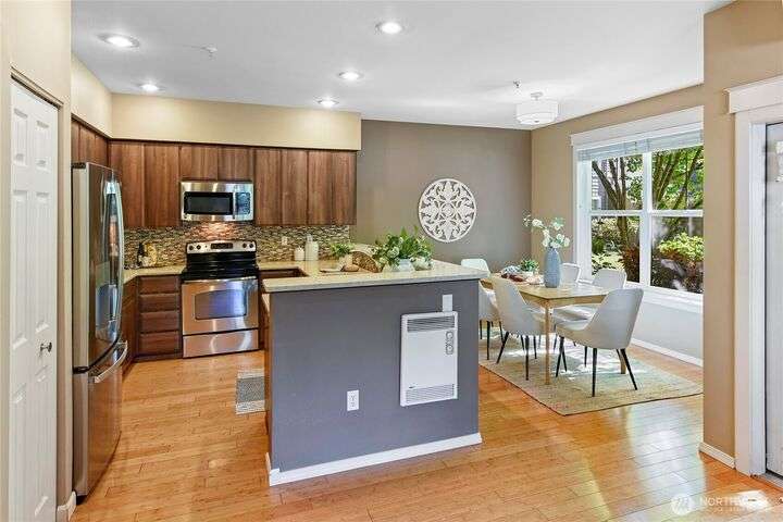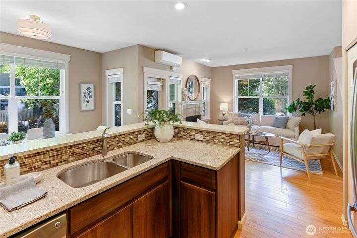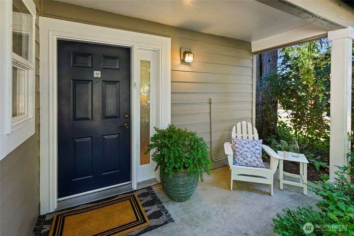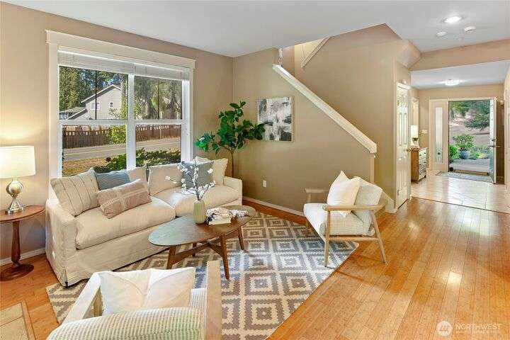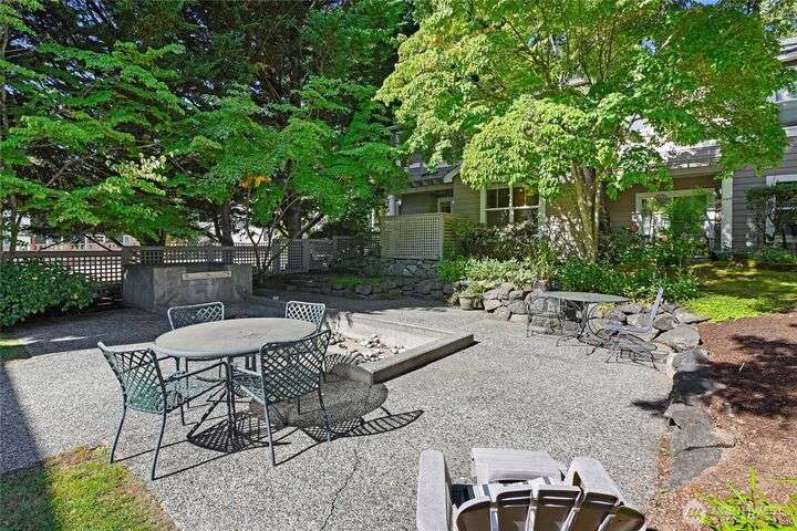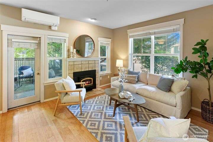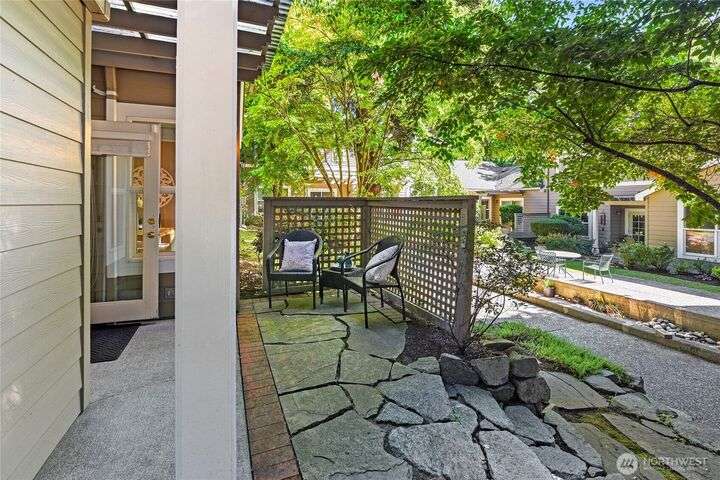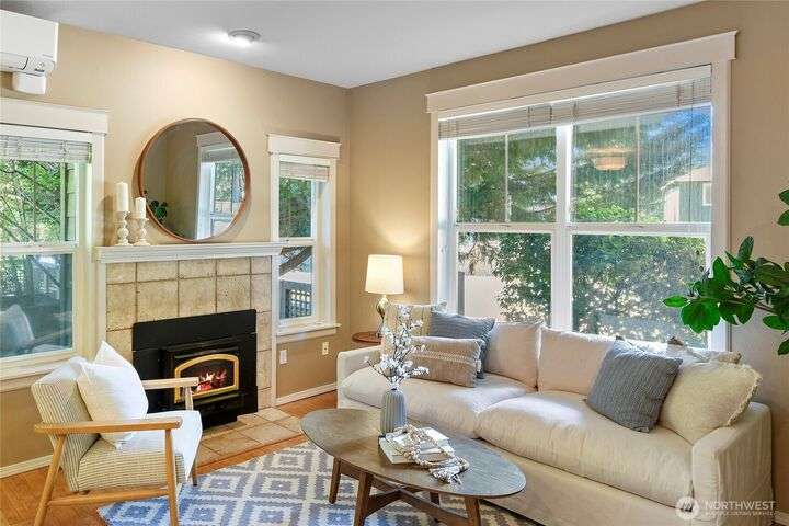 Don't miss this gem of a 3 bedroom townhome nestled in a park-like setting centrally located close to schools, library and parks. One level living with primary suite and all the communal spaces on the main level. Two additional bedrooms upstairs share a full bath. Surrounded by beautiful landscaping with serene views and spacious sitting area off the back porch. Tasteful updates include bamboo floors on the main level, mini-split for heating and cooling, quartz counters in kitchen and stainless kitchen appliances. 9 foot ceilings and an abundance of natural light make the open concept living both cozy and bright. Enjoy one of Bainbridge Island's most desirable communities w/ easy access to vibrant downtown Winslow and the ferry to Seattle.