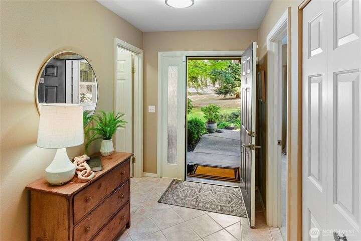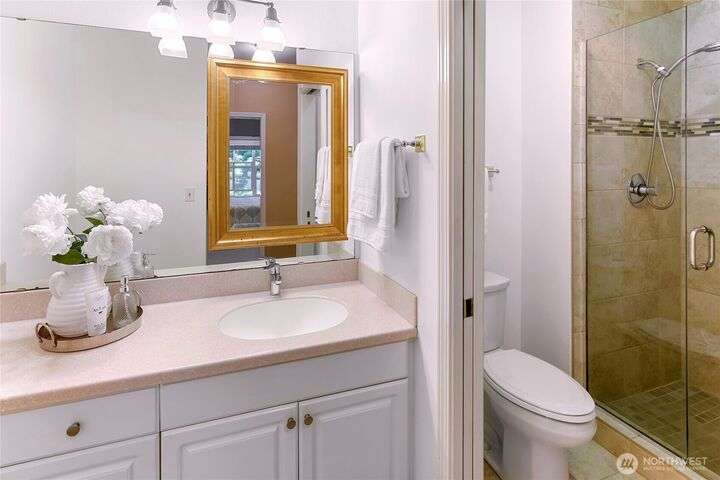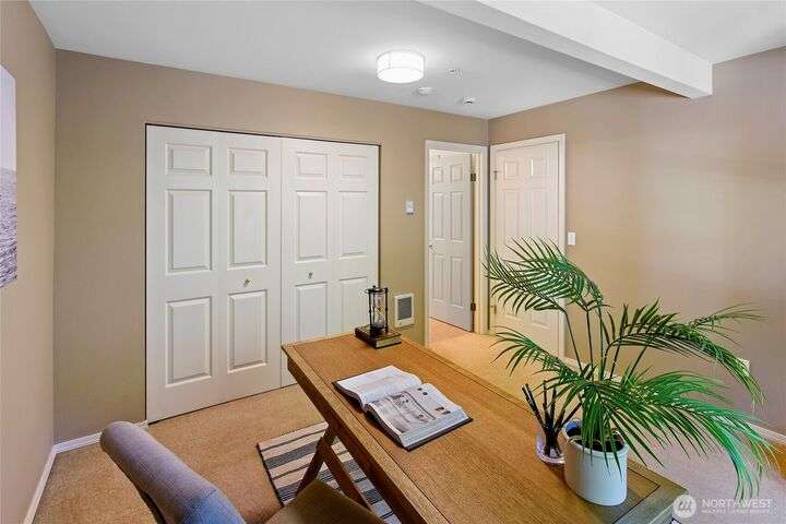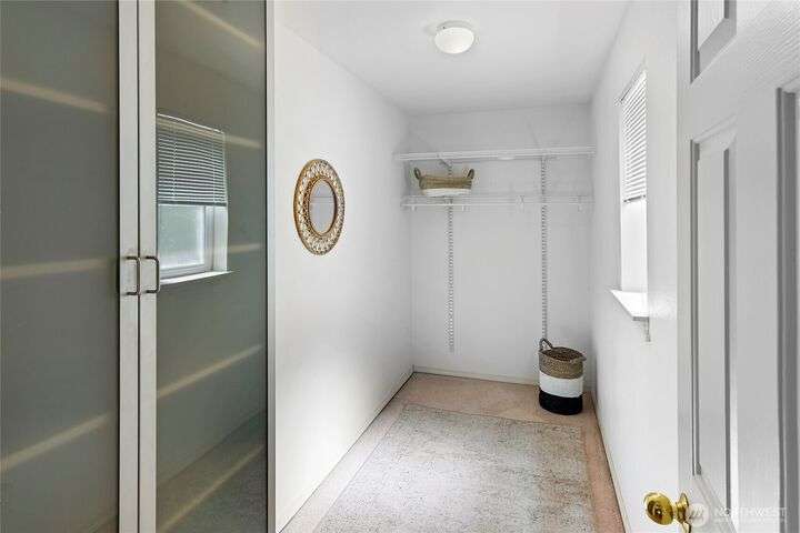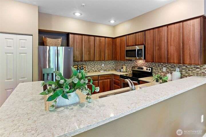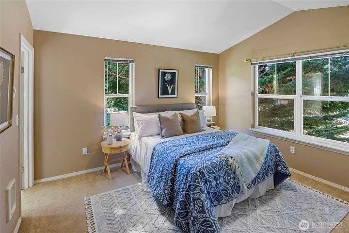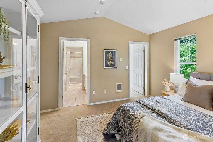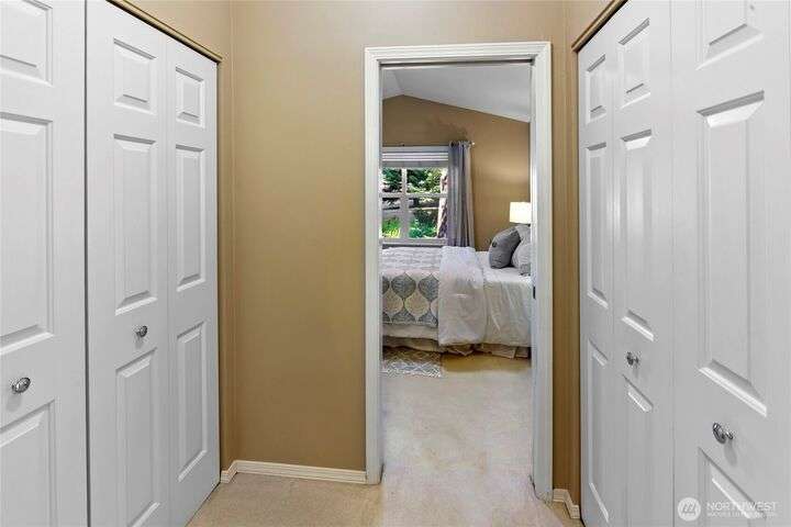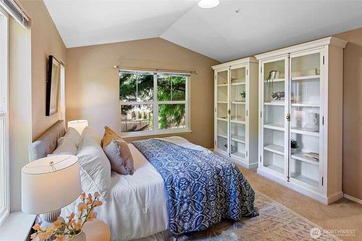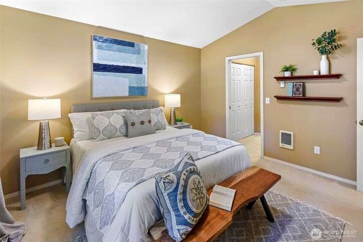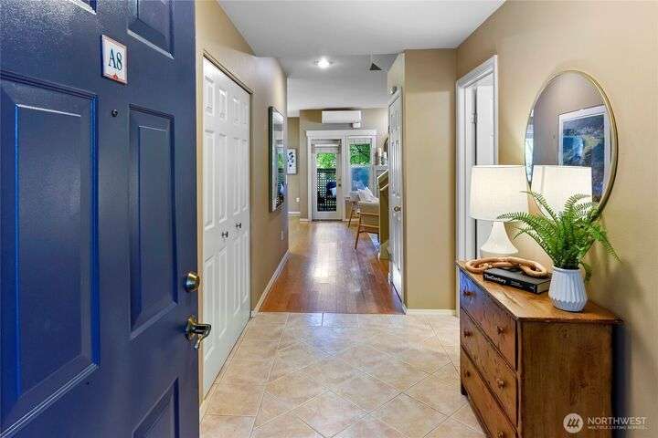 Don't miss this gem of a 3 bedroom townhome nestled in a park-like setting centrally located close to schools, library and parks. One level living with primary suite and all the communal spaces on the main level. Two additional bedrooms upstairs share a full bath. Surrounded by beautiful landscaping with serene views and spacious sitting area off the back porch. Tasteful updates include bamboo floors on the main level, mini-split for heating and cooling, quartz counters in kitchen and stainless kitchen appliances. 9 foot ceilings and an abundance of natural light make the open concept living both cozy and bright. Enjoy one of Bainbridge Island's most desirable communities w/ easy access to vibrant downtown Winslow and the ferry to Seattle.