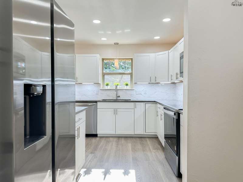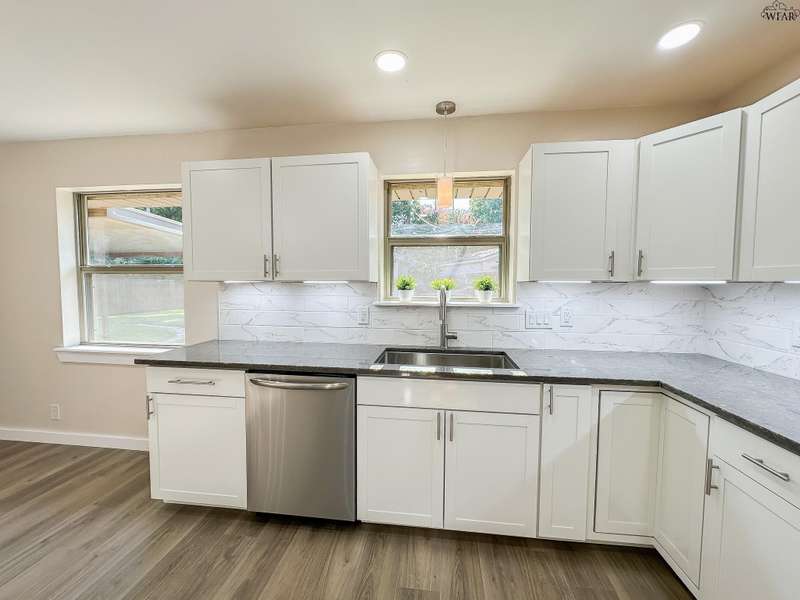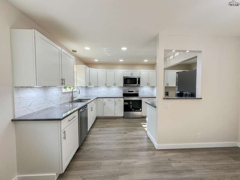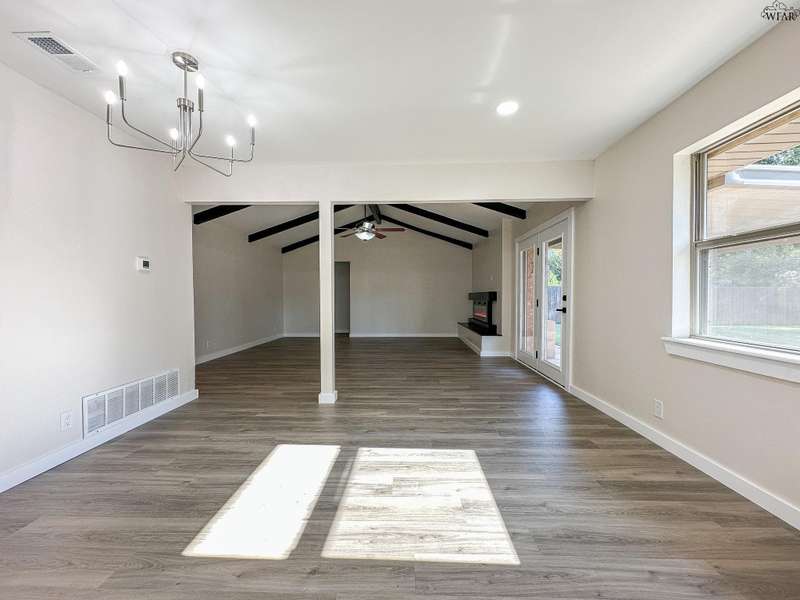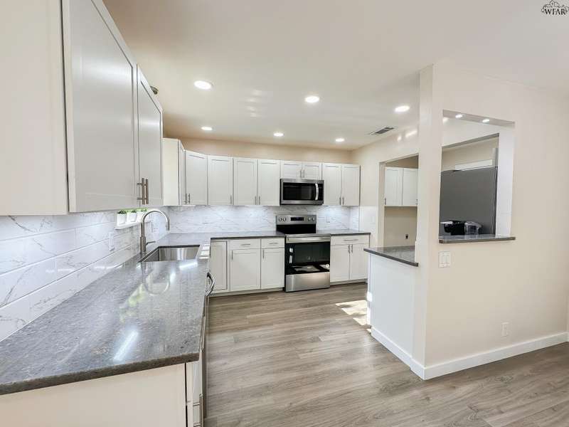 Beautiful and completely remodeled home showcasing modern upgrades throughout! Enjoy fresh paint, stylish vinyl plank flooring, and double-pane windows. Kitchen features quartz countertops, tile backsplash, new cabinets. Both bathrooms tastefully renovated. New doors, lighting throughout. A stunning fireplace creates a warm focal point in the living area. Outside, relax on the covered patio. Nestled in a great neighborhood and prime location, this move-in-ready home combines comfort, style, and convenience.