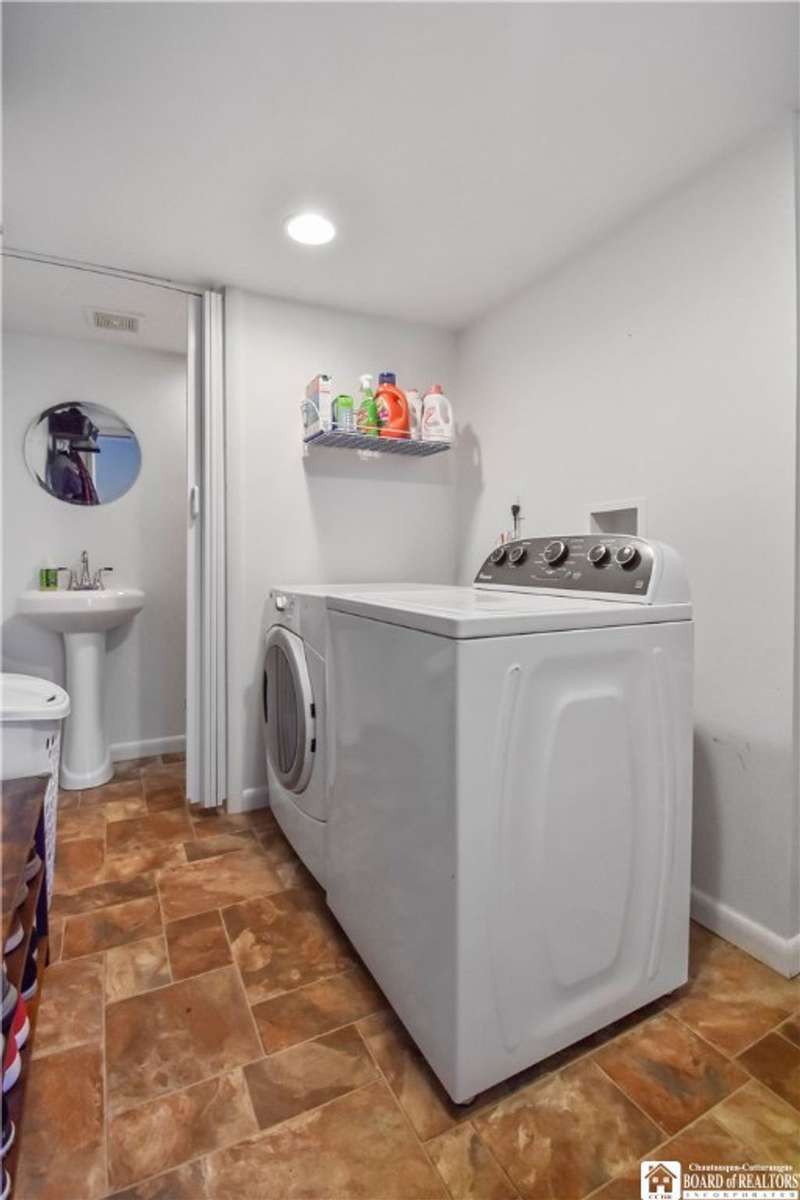 This well-cared-for ranch-style home offers easy, one-level living with thoughtful updates throughout. Inside, you'll find 2 bedrooms, 1.5 baths, and an attached 1.5-car garage. The main level includes a convenient washer and dryer, central heat and air conditioning, and a smart thermostat. The home also features wired Ethernet connections to the bedrooms and is fiber-optic internet-ready for modern connectivity. Attention to detail shows throughout, from cordless blinds on every window to updated fixtures and finishes.The mechanicals have been responsibly maintained, with improvements to the water tank, gutters with covers, the air conditioner, and the furnace. A full basement provides excellent additional storage or potential workshop space.Outside, you'll appreciate the large village lot with a spacious backyard, double deck, and long concrete driveway. The location offers easy access to nearby parks and community amenities. This move-in-ready home combines comfort, practicality, and low-maintenance living.
