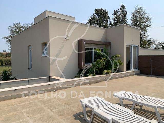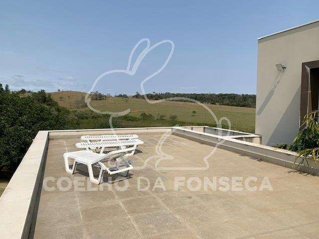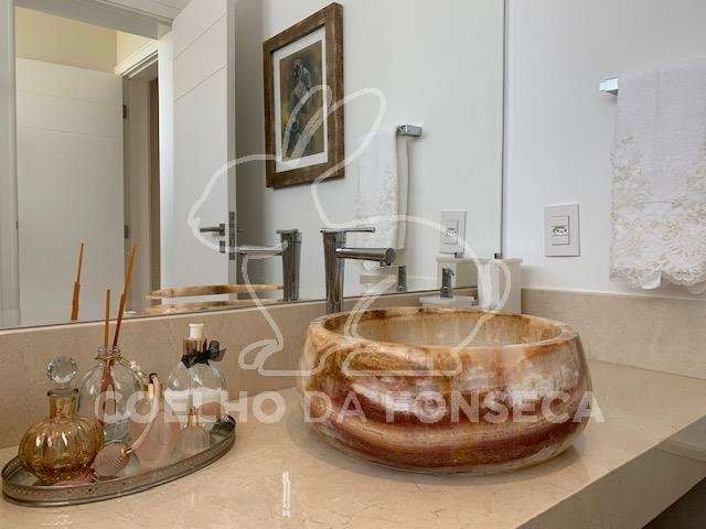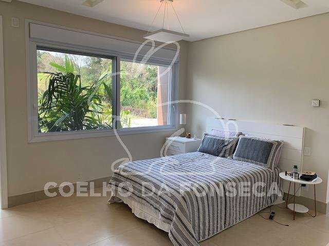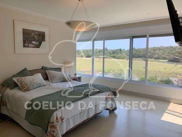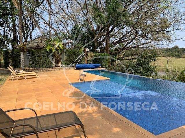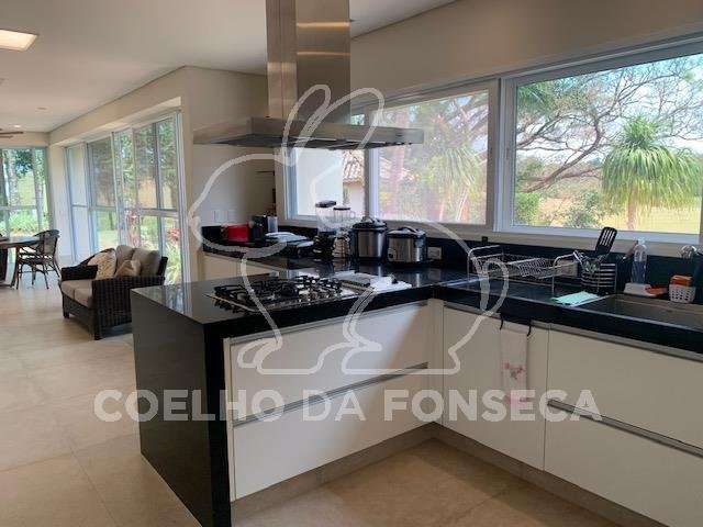 Numa construção anexa, a cozinha gourmet, integrada ao salão de festas e a piscina com borda infinita, está ligada a uma casa de apoio, a quadra de peteca e ao lago, que permite uso de pequenas embarcações.