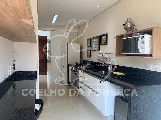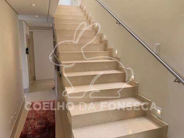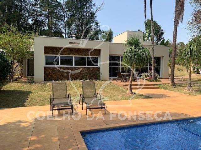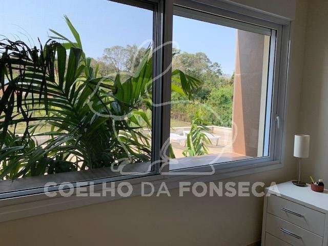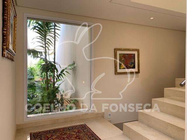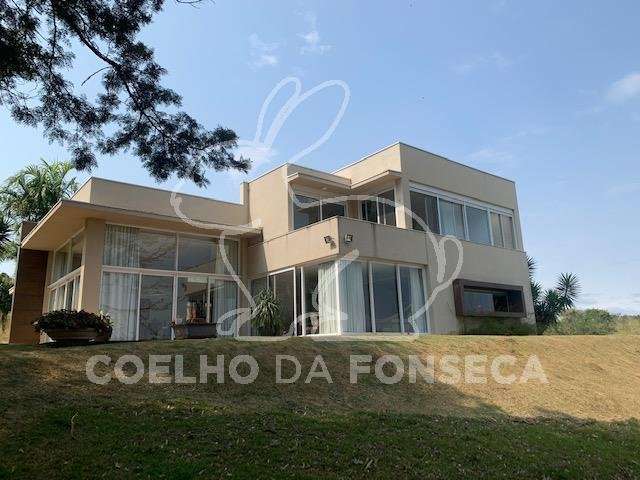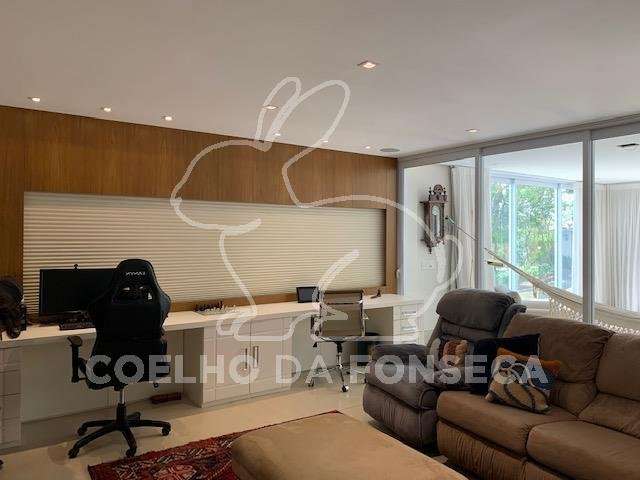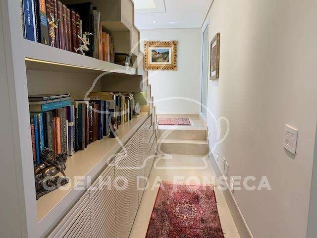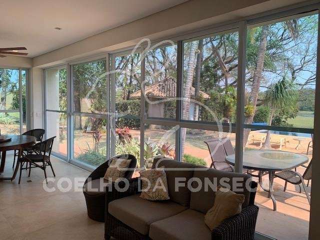 O living com pé direito alto, que garante o conforto térmico, oferece um hall imponente, sala de estar com lareira, sala de jantar com mesa para até 14 lugares, lavabo, Home Theater com escritório e cozinha de apoio.