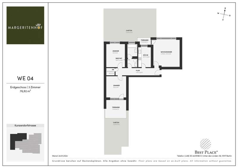 The practically designed 2-room flat with approx. 54 m² is located on the ground floor of the three-storey residential building. It has a south-east-facing terrace and a private garden, thanks to which the flat will also be easy to let in the future. The bathtub in the bathroom provides a wellness feeling and a storage room provides storage space and convenience. Our modern Margeritenhof investment project offers investors practically designed, rented condominiums. The three-storey corner building was built in 1976 and has nine flats with two to three rooms and approx. 52 to 83 m². The Margeritenhof also has a beautiful communal garden with a barbecue area, screened by hedges. An underground car park beneath the building offers seven parking spaces.