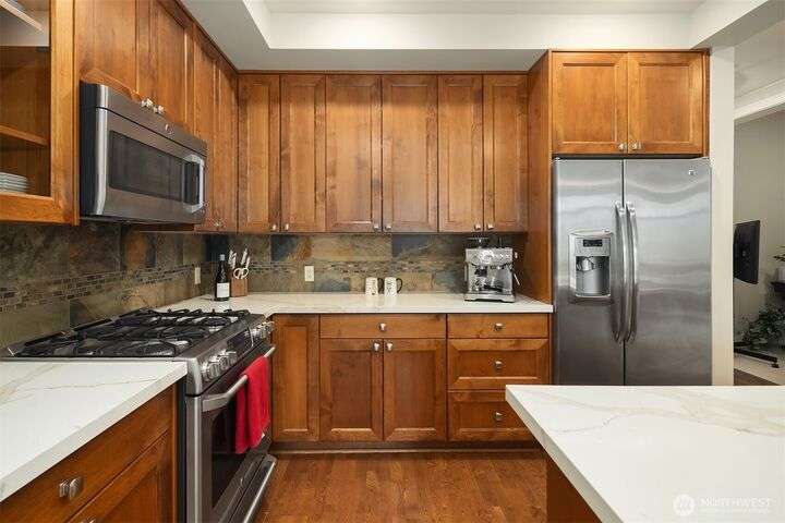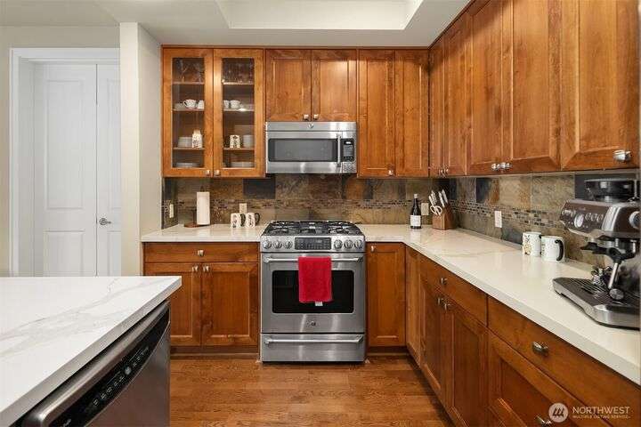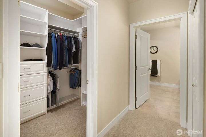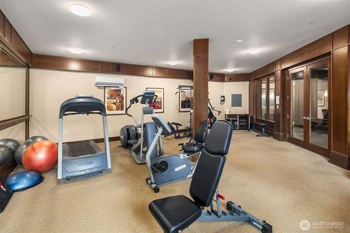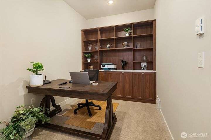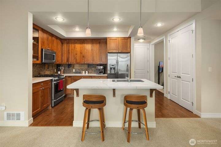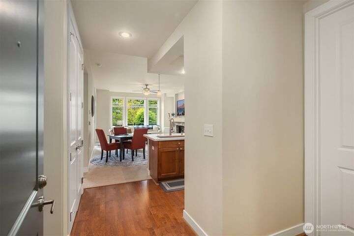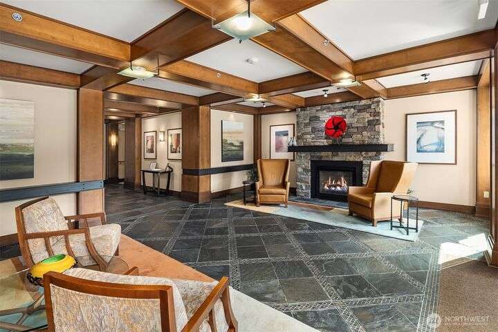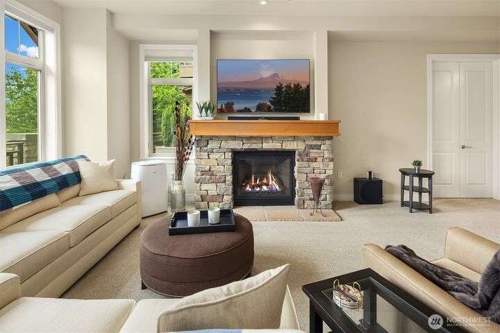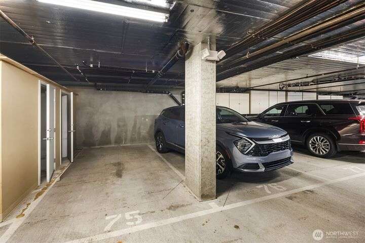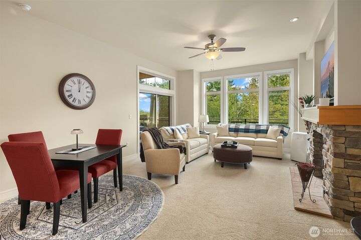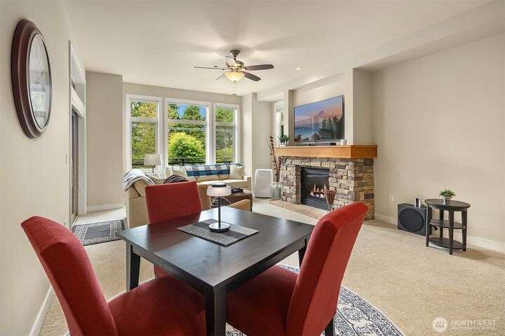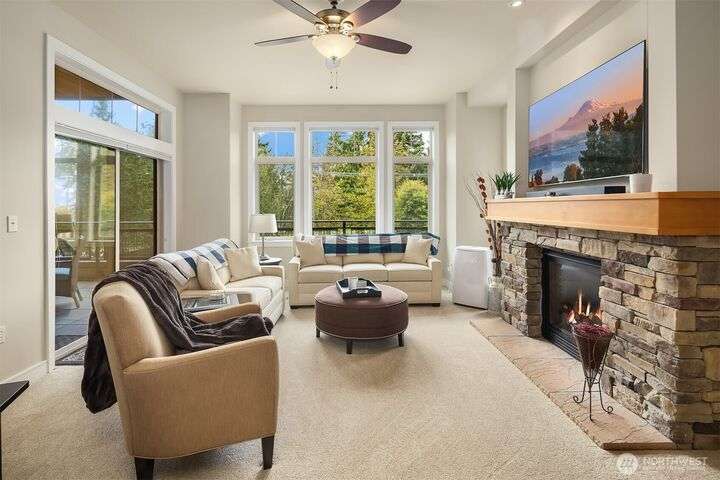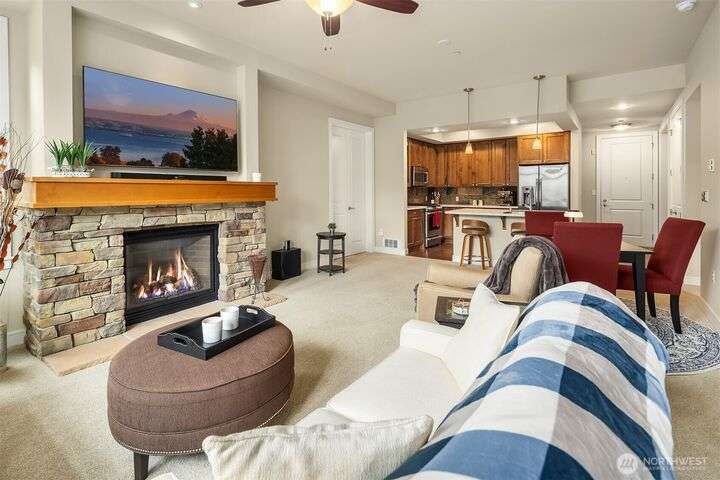 Experience refined living at The Fairview, perfectly positioned beside Harbour Pointe Golf Club with effortless access to everything Mukilteo has to offer. This 2-bedroom, 1.75-bath residence showcases a tastefully updated kitchen, fresh interior paint, brand-new carpet, abundant storage, and a versatile flex/office space with recently added built-ins. The spacious primary suite offers a private bath, walk-in closet, and patio access where seasonal peek-a-boo views of Puget Sound can be enjoyed. Building amenities include a fitness center, community clubroom, peaceful courtyard with fountains and BBQ, secure lobby, and elevator access—no stairs required! This unit comes with TWO walk in storage units and TWO covered garage parking spots.