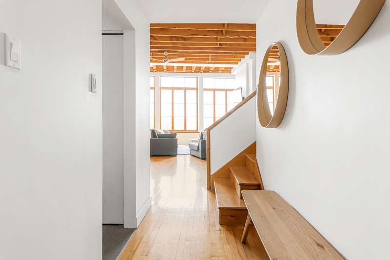 Corner townhouse-style apartment, beautifully renovated, with 2 bedrooms, 2 bathrooms, an open floor plan on the ground floor, a large terrace upstairs with stunning views of the city, and a garage with adjoining storage. It has virtually no neighbors, and despite its central location, the unit enjoys a peaceful environment. This property has the advantage of being located close to several downtown shops and restaurants, the Place d'Armes metro station, and right in front of the Palais des Congrès.