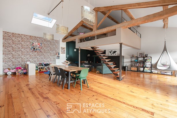 Perfectly designed for family life or convivial moments, this unique property offers a spacious and bright living room, enhanced by a beautiful high ceiling and exposed beams.
