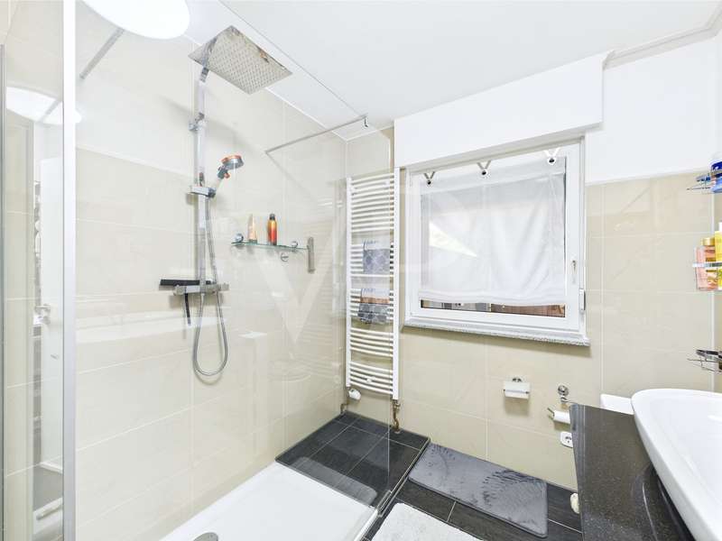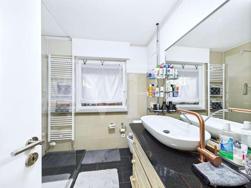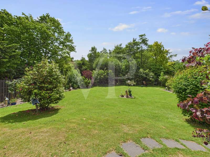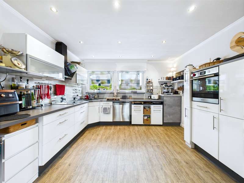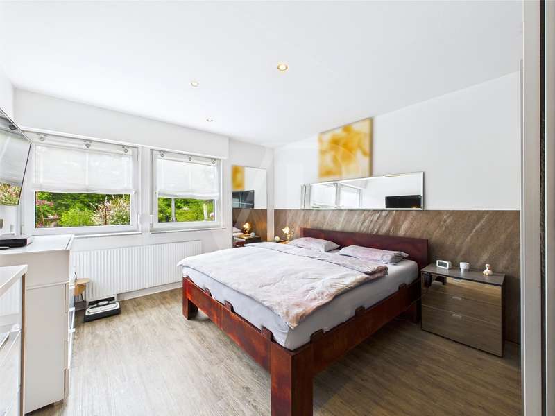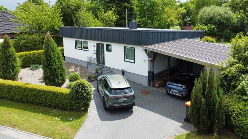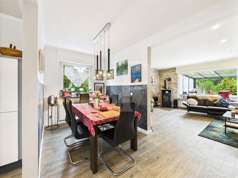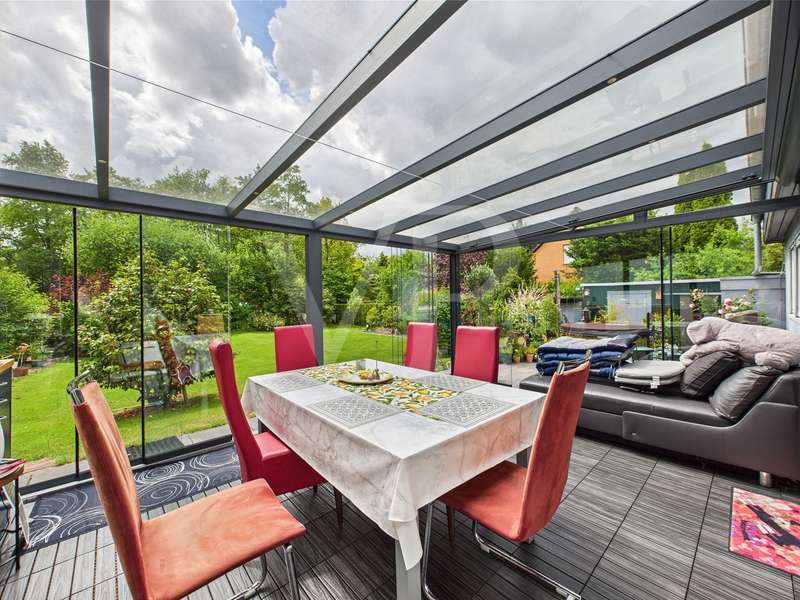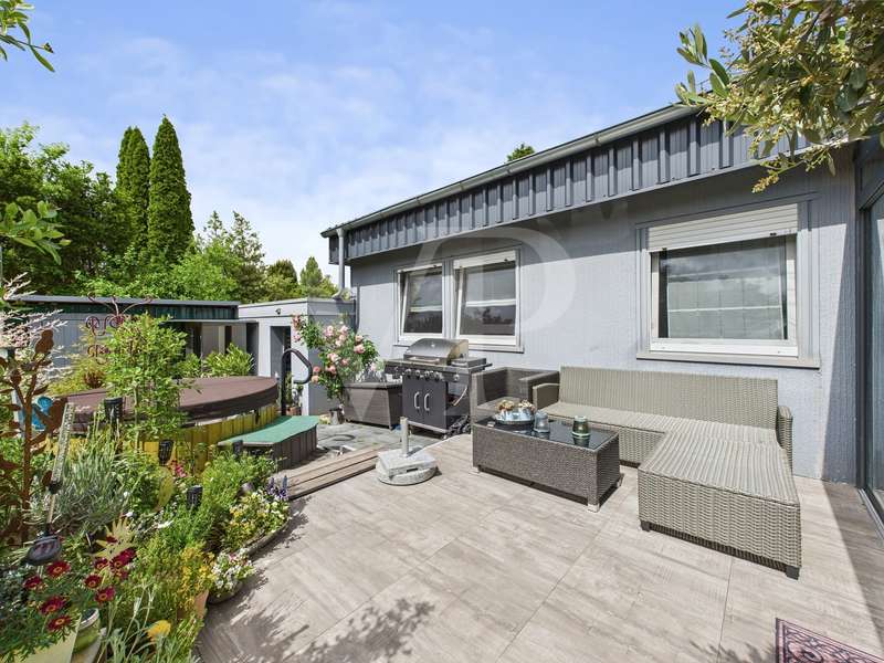 This well-kept flat-roofed bungalow, which was built in 1979 in timber frame construction, awaits you on a spacious plot of approx. 957 m². The property impresses with its well thought-out room layout, bright living spaces and numerous modernizations that ensure contemporary living comfort. The heart of the house is the open-plan living and dining area, which is flooded with light and inviting thanks to the large windows. From here, you have direct access to the cozy conservatory, which offers a wonderful panoramic view of the south-facing garden and the adjoining terrace - a perfect place to relax. The garden offers you a small, private wellness oasis: a high-quality sauna, a stylish hot tub and an outdoor shower ensure relaxing hours in the open air. Perfect for switching off and enjoying yourself - all year round. The house has a spacious bedroom with adjoining dressing room, a further guest bedroom and a modernized, ground-floor shower room from 2019. A separate guest WC is located near the entrance area. Practical: the adjoining boiler room offers additional storage space. The property is technically up to date: the roof has been newly tiled and additionally insulated, the heating system dates from 2023 and some windows have already been replaced. This property combines comfortable living on one level with a spacious plot in a quiet residential area - ideal for couples or small families looking for a home with a feel-good atmosphere.