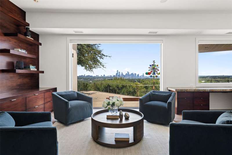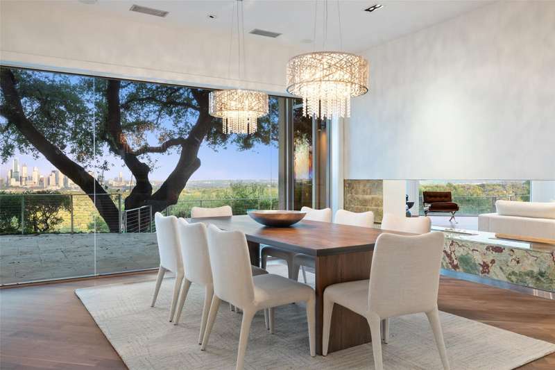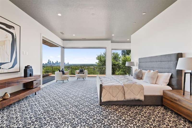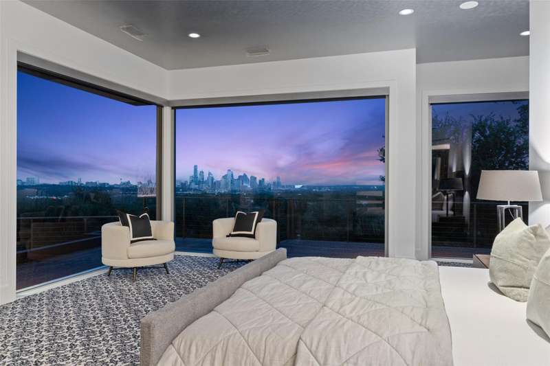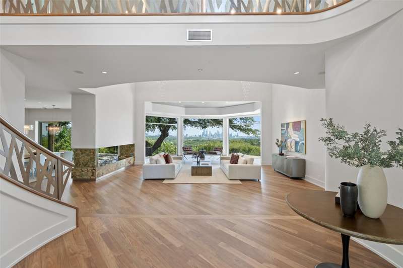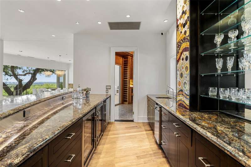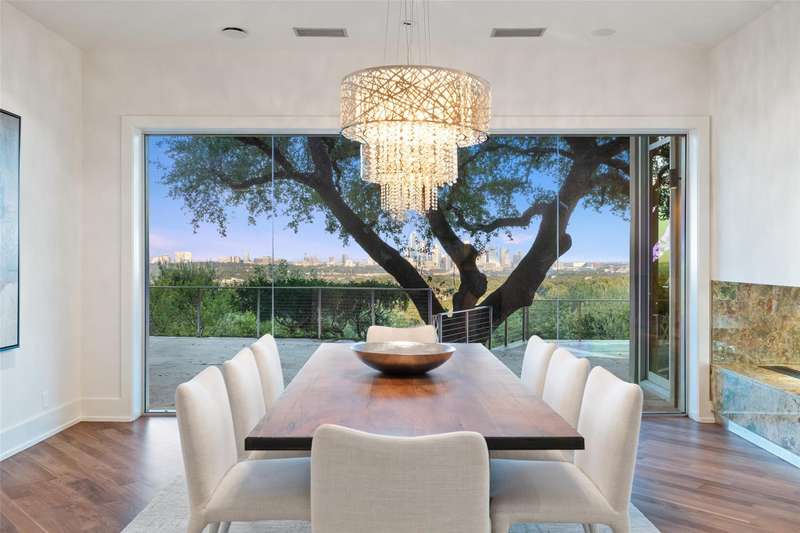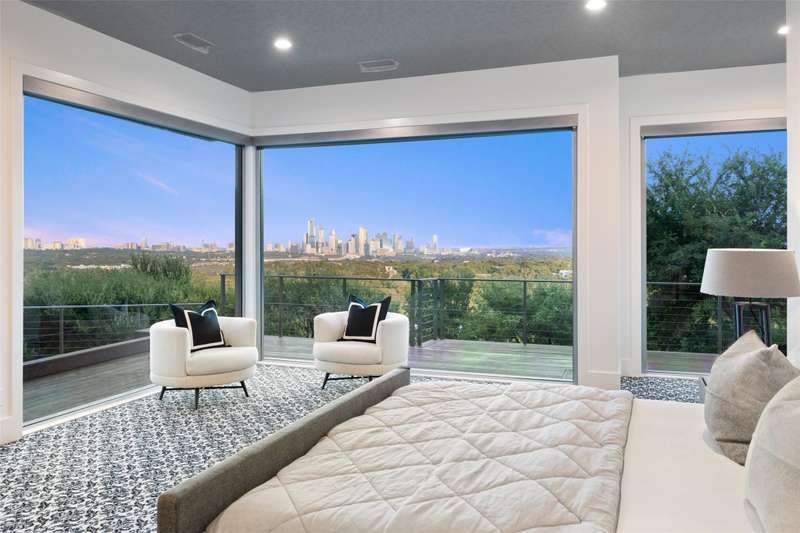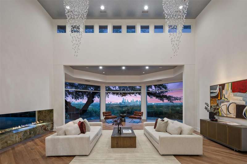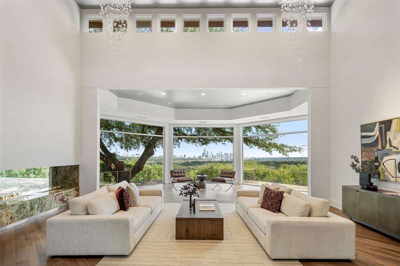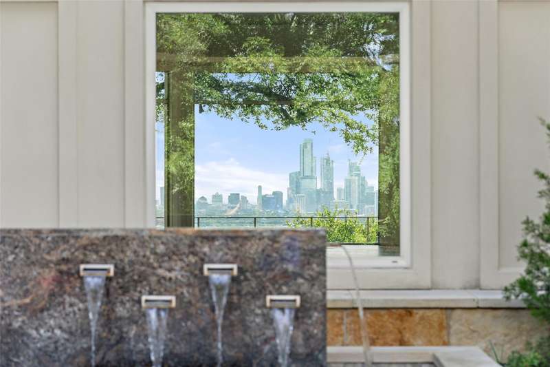 Discreetly perched among heritage oak trees on a hilltop behind a gated entry, this entertainer's dream home offers unparalleled views of downtown Austin. The soft contemporary residence is a testament to modern luxury, with floor to ceiling windows positioned to embrace both dazzling evening city lights and serene sunrises. Thoughtfully curated open-plan living spaces offer wooden floors, custom stainless-steel staircase, onyx fireplace, zebra wood study, 2,200 bottle wine cellar, handcrafted stained glass kitchen and cocktail bar backsplashes, gourmet and prep kitchen, butler's pantry with built-in china cabinets, crystal chandeliers, and a granite fountain upon entry. A private wing blends an oversized primary suite with walls of glass, and a cozy niche to a secluded patio. The primary bathroom offers a 14-head walk-in shower, soaking tub, and an audacious designer closet. Inclusive to the 7,574 square foot estate are two, upstairs ensuite bedrooms for family and friends.