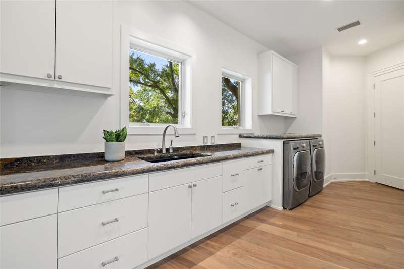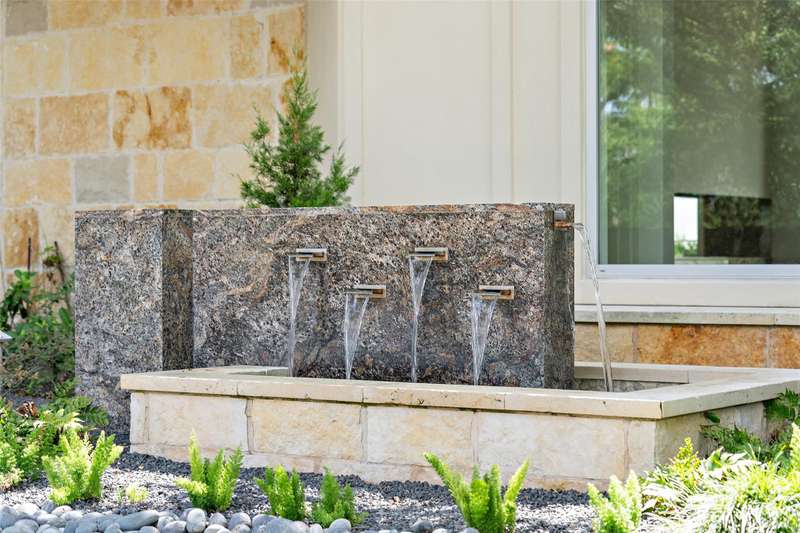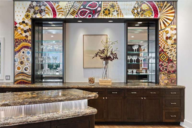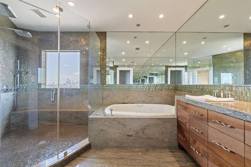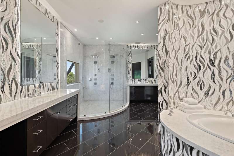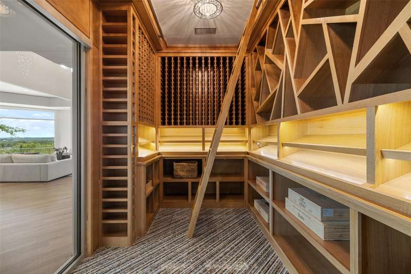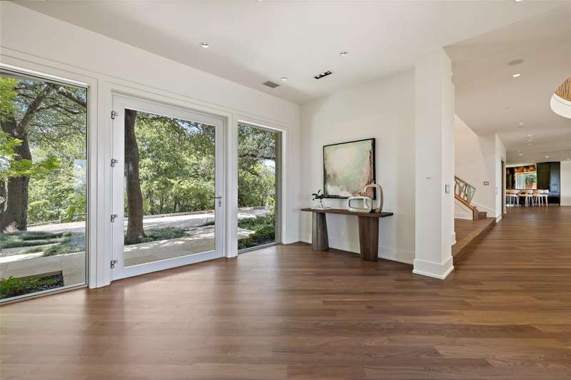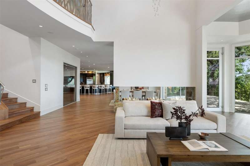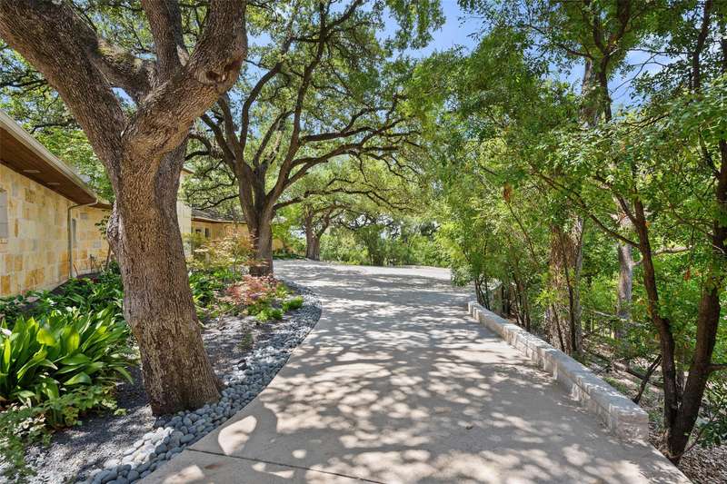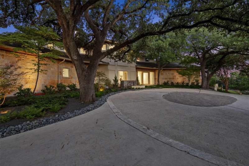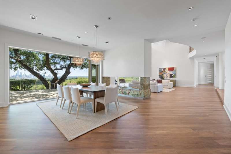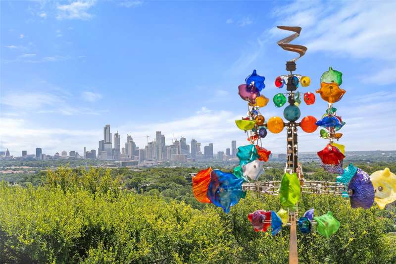 Discreetly perched among heritage oak trees on a hilltop behind a gated entry, this entertainer's dream home offers unparalleled views of downtown Austin. The soft contemporary residence is a testament to modern luxury, with floor to ceiling windows positioned to embrace both dazzling evening city lights and serene sunrises. Thoughtfully curated open-plan living spaces offer wooden floors, custom stainless-steel staircase, onyx fireplace, zebra wood study, 2,200 bottle wine cellar, handcrafted stained glass kitchen and cocktail bar backsplashes, gourmet and prep kitchen, butler's pantry with built-in china cabinets, crystal chandeliers, and a granite fountain upon entry. A private wing blends an oversized primary suite with walls of glass, and a cozy niche to a secluded patio. The primary bathroom offers a 14-head walk-in shower, soaking tub, and an audacious designer closet. Inclusive to the 7,574 square foot estate are two, upstairs ensuite bedrooms for family and friends.