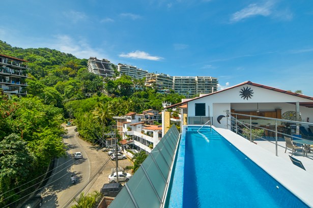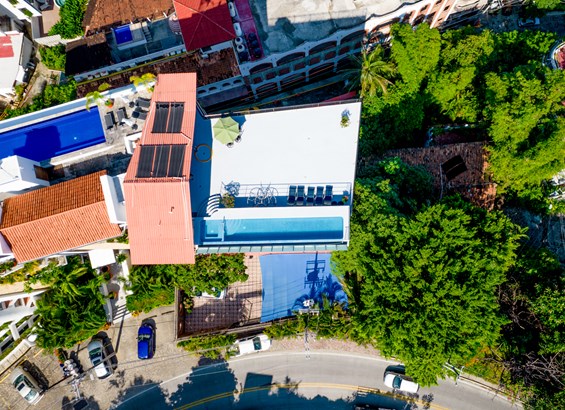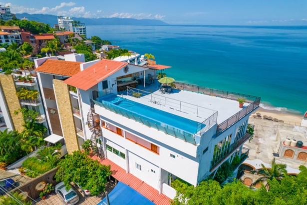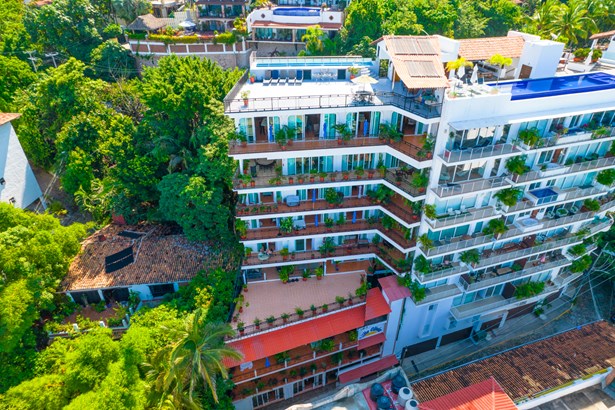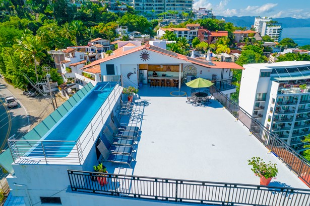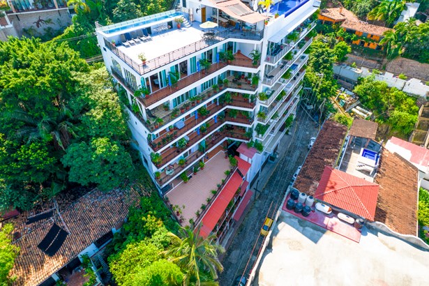 Villa Olivia is an investor’s dream on the Southside of the Romantic Zone ready to be turned into a boutique hotel, B&B; corporate retreat or a family building with income suites. It comprises 22 large studios, 2-2 bedroom apartments; a large 2 bedroom Penthouse; rooftop terrace with pool, bar area and covered sitting spaces; large kitchen breakfast/dining area; reading lounge; professional laundry; gym; sauna and additional sundeck terrace. Gated upper parking. A block away from Playa Los Muertos and Blue Chairs.