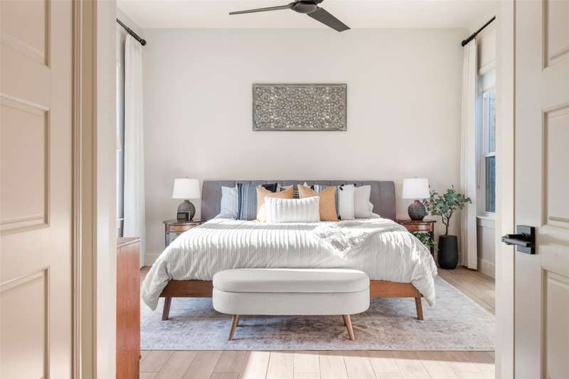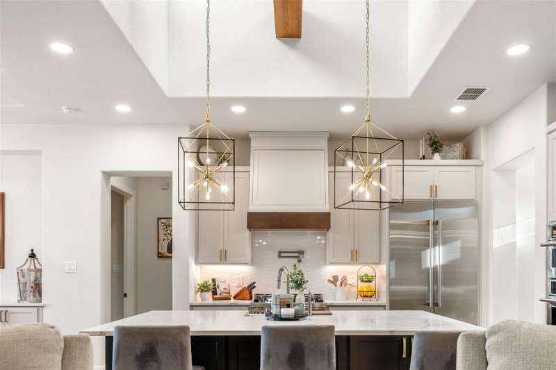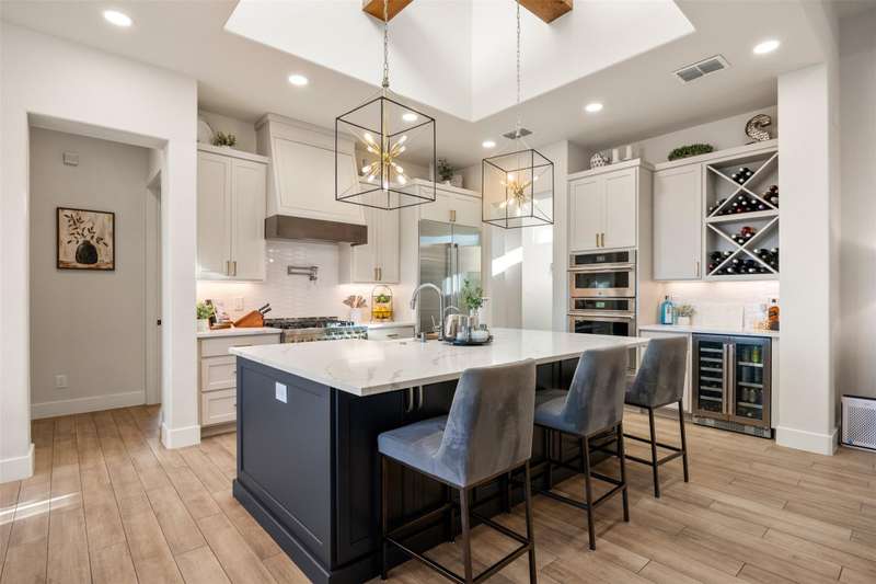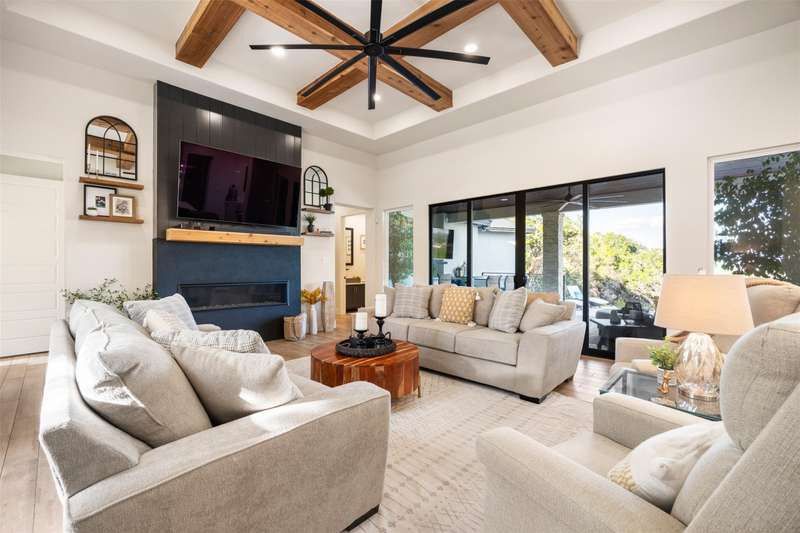 Inside, the open-concept floor plan features high ceilings, exposed beams, premium finishes, and spacious living areas filled with natural light.