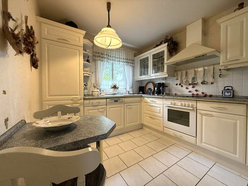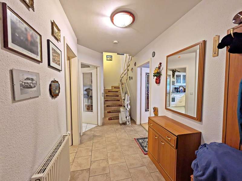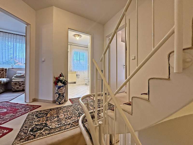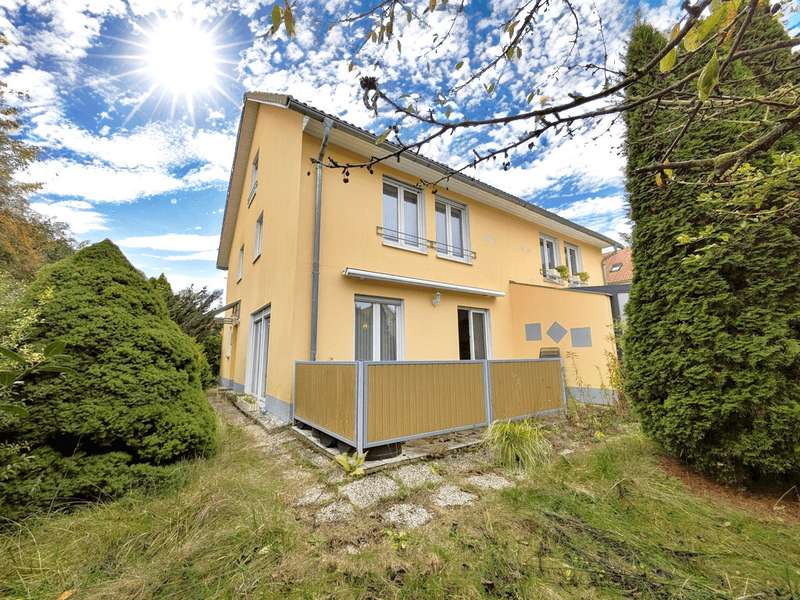 This well-kept semi-detached house with a natural garden plot is located in the quiet residential area "Am Schötener Bache" in Apolda and is situated in a traffic-calmed cul-de-sac not far from the hospital. The surrounding area is green and family-friendly with good connections to the urban infrastructure. Built in 1996 as a solid construction, the house has approx. 140 m² of living space spread over two full floors and a fully developed attic. The approximately 312 m² plot of land is mainly laid out in a natural setting. Upon entering the house, you enter a central hallway on the first floor. From there, you can access the kitchen with fitted kitchen, a guest WC, the utility room and the spacious, bright living room with integrated dining area. The living room has access to the terrace and the garden. There are three bedrooms on the upper floor, including a particularly spacious room with an exit balcony. The other two rooms are suitable as children's rooms or work areas. There is also a daylight bathroom with bathtub and shower on this floor. The top floor is fully developed. There is a large, flexibly usable room here, which is suitable as a hobby room or additional living space. The attic also houses the boiler room. The house is heated by gas central heating. The natural garden offers plenty of space for personal design. Several trees, including an apple tree, make it a small green oasis. An approx. 7 m² terrace offers a pleasant place in the green. The garden also provides access to the spacious garage. The semi-detached house is available immediately. The deposit is 3 cold rents. For further information, please send us a written inquiry using the contact form, stating your full details, so that we can get in touch with you. Your VON POLL real estate team from Weimar The energy certificate was not available when this advertisement was created.