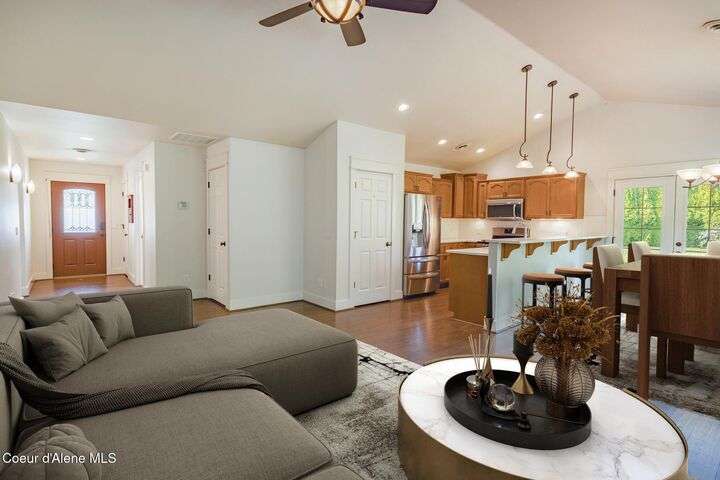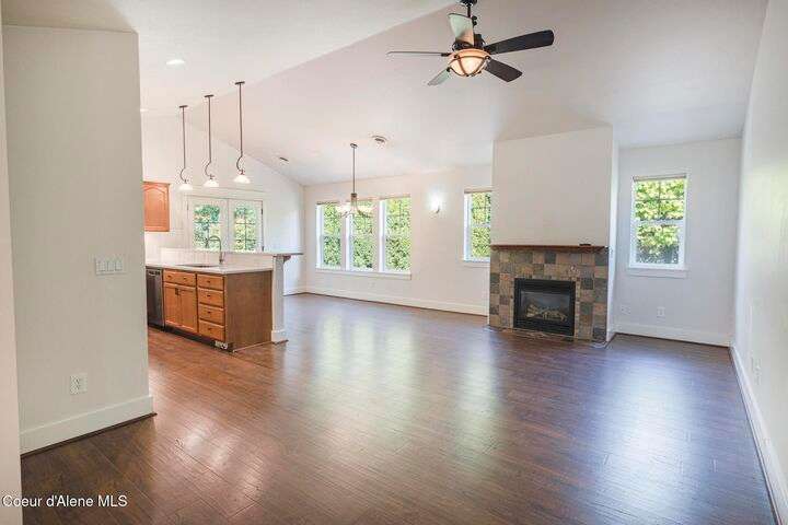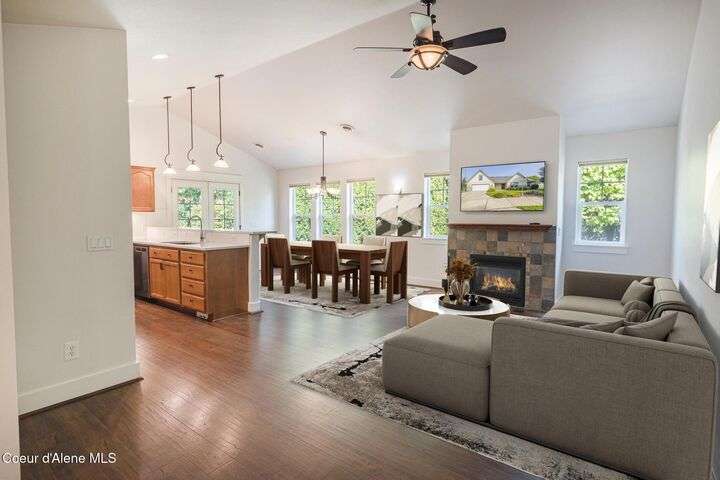 BEAUTIFUL CANFIELD MOUNTAIN VIEW RANCHER. This well-maintained single-level rancher, with a loft, located in the highly desirable Canfield Corners neighborhood, offers both comfort & style with picturesque views. The neighborhood features a PRIVATE COMMUNITY PARK adding to its charm. Inside, you'll find 4 bedrooms on the main level & 2 full bathrooms. The upstairs large loft could be a 5th bedroom. The open-concept kitchen features quartz countertops, stainless steel appliances, breakfast bar & French doors off the dining area that lead to a covered back patio overlooking a large fenced yard. Additional highlights include: vaulted ceilings, a fireplace in living room, durable LVP flooring, central heat and A/C, primary suite with double vanities, a Jacuzzi tub & walk-in closet, fully fenced yard with sprinklers & a garden shed, attached 2-car garage, central vac, and laundry room with built-in cupboards & sink. This home is move-in ready, WALK TO SCHOOLS!