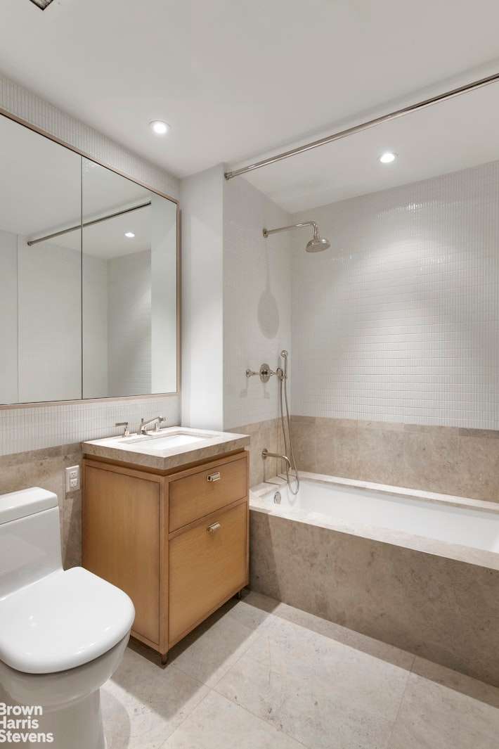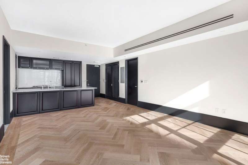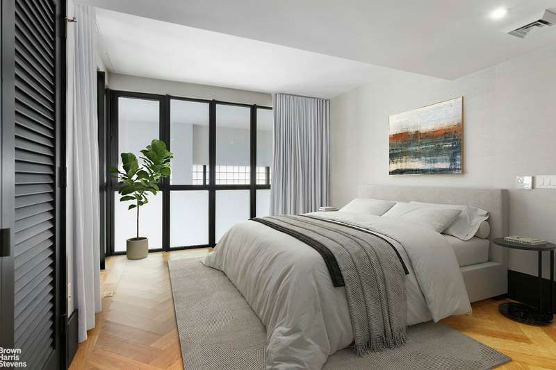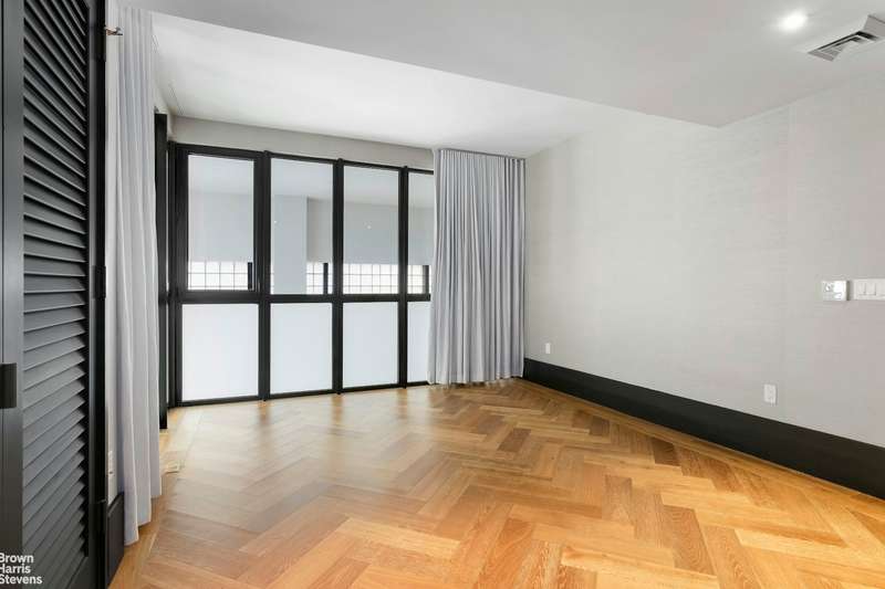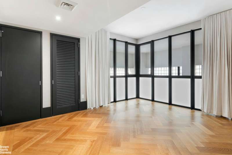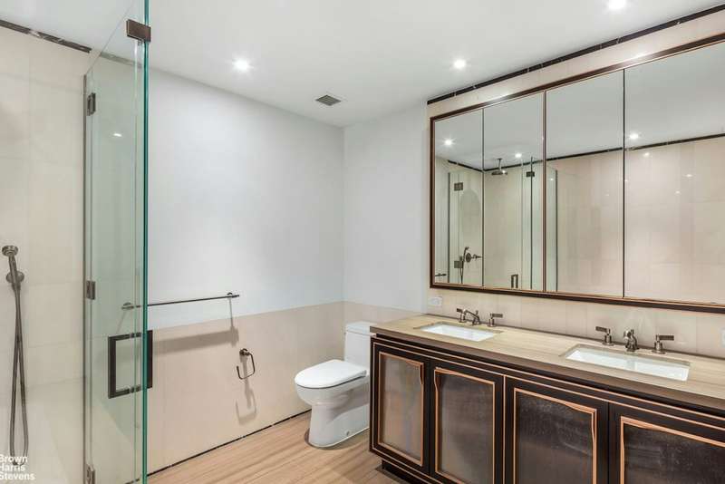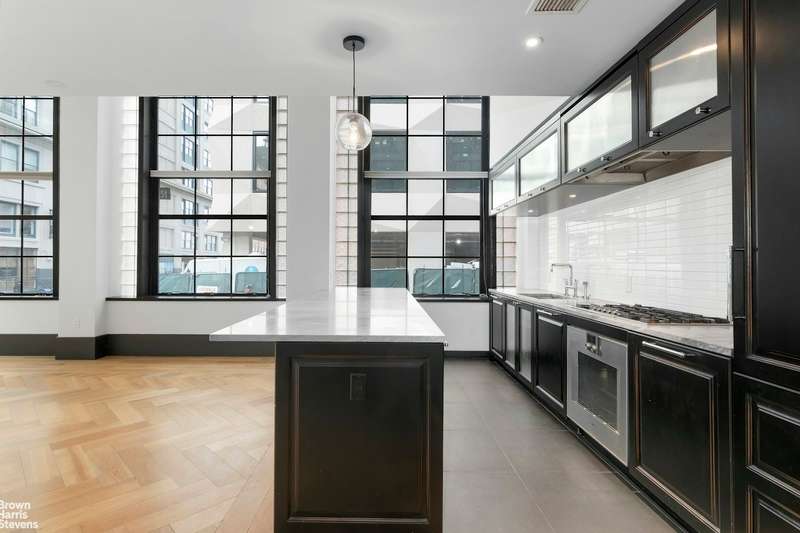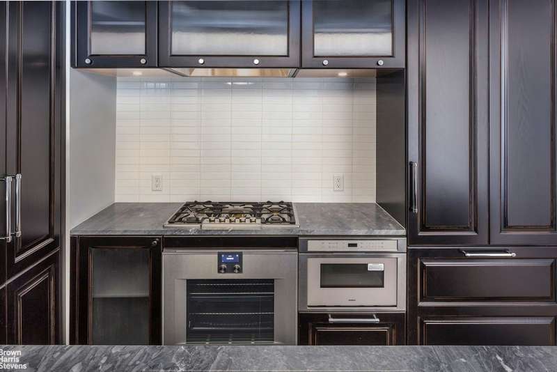 Every detail throughout this duplex speaks of expert craftsmanship and fine materials that exude the industrial charm of the building. Oversized kitchens include dramatic custom cabinetry by Aster Cucine, La Rochelle Gris marble slab countertops, and a suite of Gaggenau appliances. Luxuriously appointed master bathrooms feature lacquered dark brown vanities with copper detailing, walnut brown marble flooring, and a glass-enclosed wet room with walk-in shower and soaking tub.