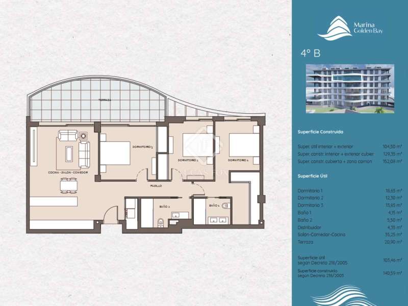 Lucas Fox presents this spectacular new build development in the very port of Benalmádena. The development offers the most exclusive apartments in the Benalmádena area. Marina Golden Bay will enjoy great tranquility, perfect for disconnecting. Its undulating façade, inspired by the shape of a ship trapped in the port, evokes the waves of the sea and allows you to enjoy terraces open to the sea. In addition, its gardens offer a contrast of colors, while in the community pool area there are hammocks to relax. This apartment on the fourth floor has clearly differentiated day and night areas . The day area houses a living-dining room with an open-plan kitchen. For its part, the night area offers two double bedrooms, a full bathroom and the main bedroom with a private bathroom. The living-dining room and one of the bedrooms have access to the terrace. The property has a modern design, with neutral colors in beige and white, which increases the feeling of spaciousness. The main rooms have large windows that access to the terrace with sea views that allow the entry of abundant natural light. Likewise, open-plan rooms are offered with the open-plan kitchen living-dining room and kitchen, which make the most of the space. This luxurious apartment has been meticulously designed to offer a modern and comfortable lifestyle, with spacious, light-filled interiors and high-quality finishes. Contact us for more information about these incredible homes next to the Benalmádena marina, in an area with a temperate climate all year round and more than 320 days of sunshine a year.