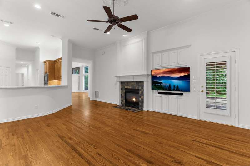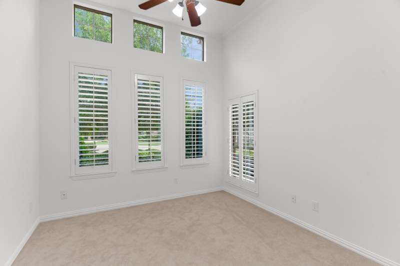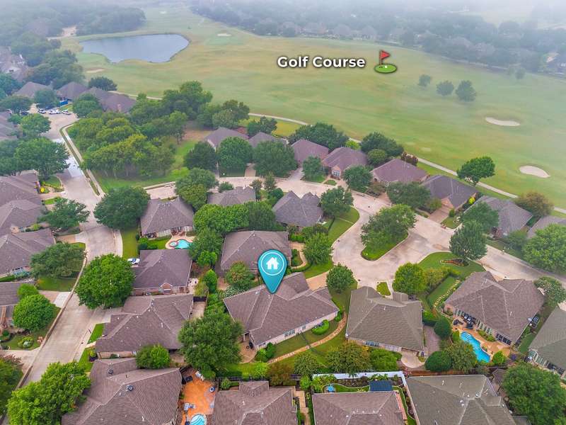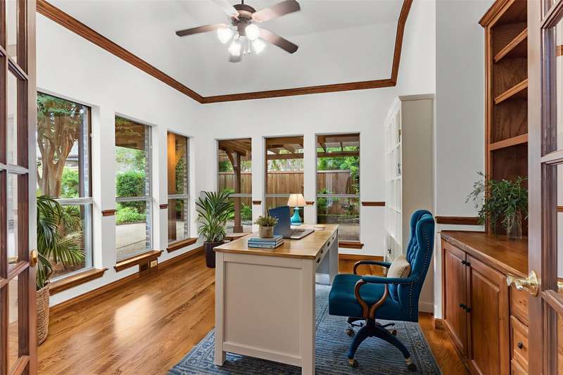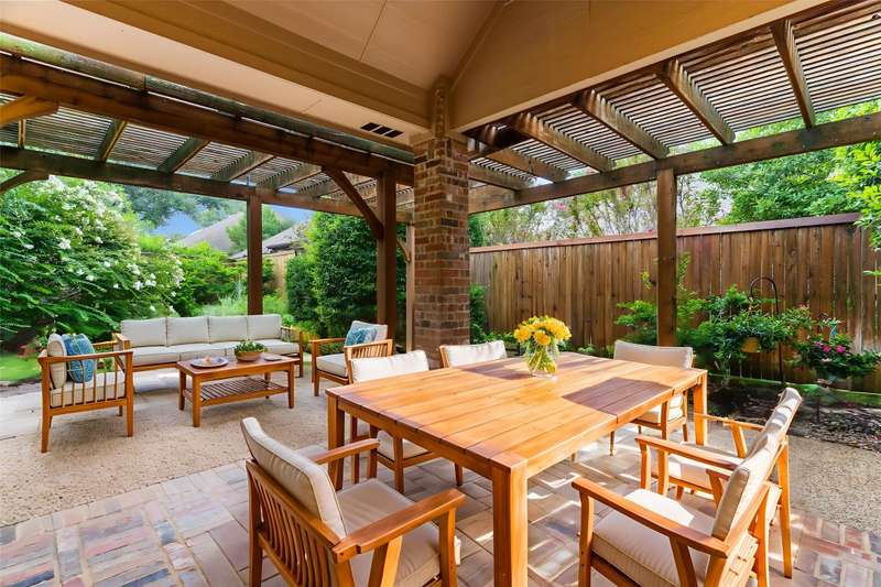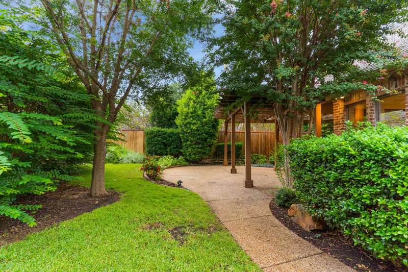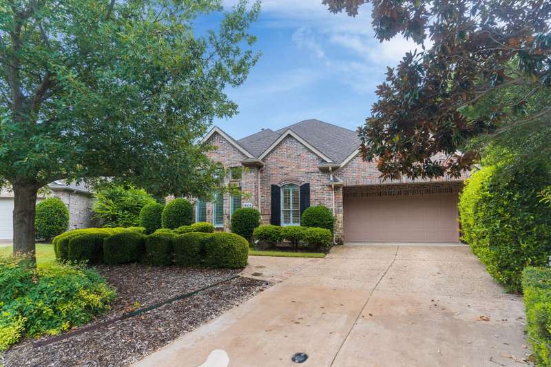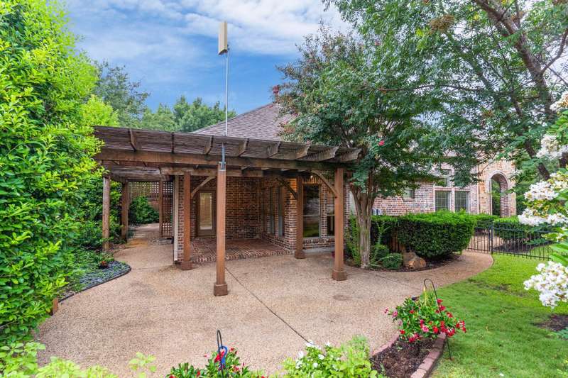 Welcome to this beautifully refreshed residence in the prestigious Muirfield enclave of Stonebridge Ranch. Recently painted interiors provide a fresh, neutral backdrop ready for your personal style. Built by Darling Homes and designed with both comfort and elegance in mind, the property features two inviting patiosa charming breakfast patio for quiet mornings and a cedar-covered pergola overlooking lush landscaping, a flagstone walkway, and a cedar fence with iron gate for privacy. Inside, medium-toned solid engineered hardwood floors, plantation shutters throughout, and rich oak cabinetry set a timeless aesthetic. The private office is enhanced with custom built-ins, panoramic view of landscaped backyard patio. Enjoy family gathers in the spacious living room centered around a cozy gas log fireplace. A dramatic wall of windows illuminates the foyer and formal dining room, seamlessly flowing into the gourmet kitchen with granite island, gas cooktop, and abundant pantry storage. The oversized primary suite offers a serene retreat with a sitting area and spa-inspired bath, complete with a generous walk-in closet. Additional amenities include new carpet in all bedrooms, a Generac whole-home generator (2023), and a walk-up staircase leading to expansive attic storage from garage. HOA includes front yard maintenance.