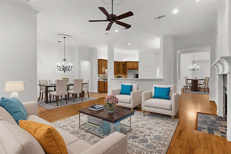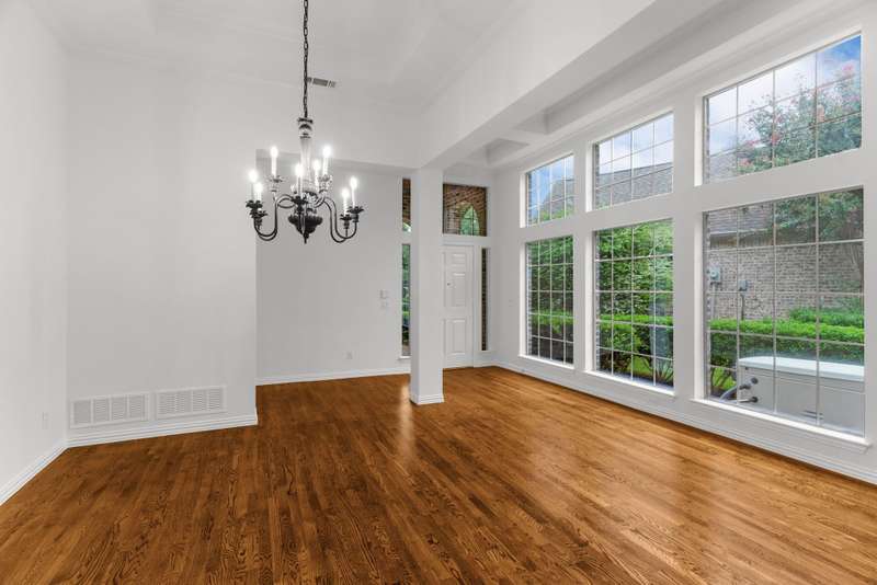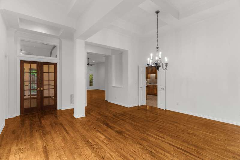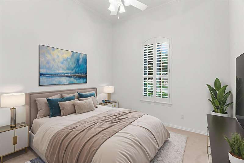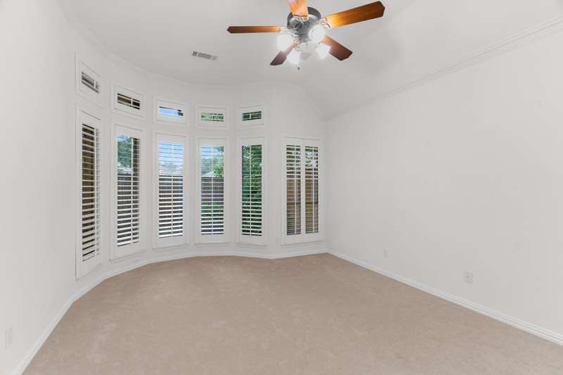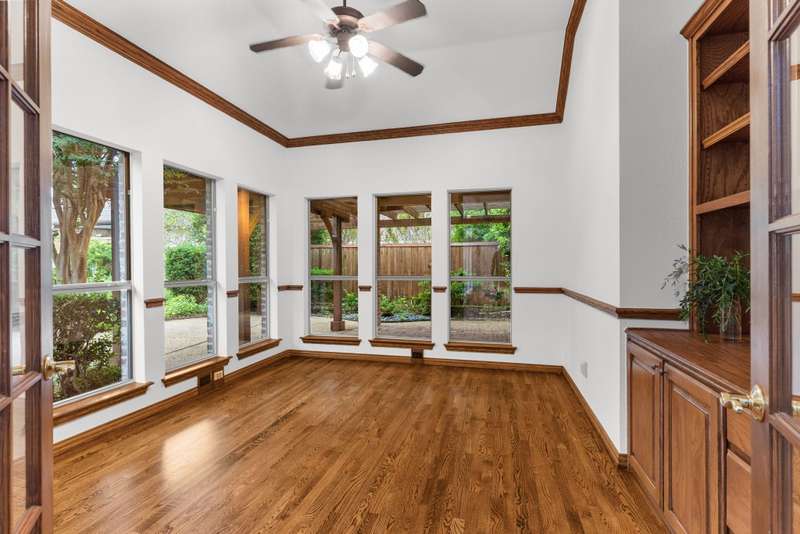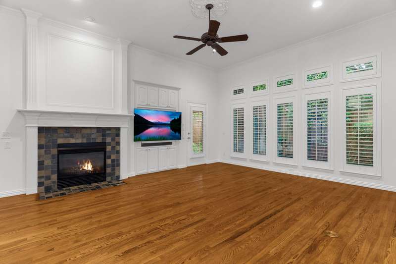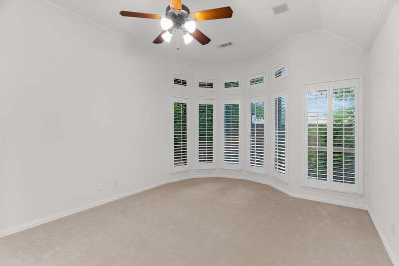 Welcome to this beautifully refreshed residence in the prestigious Muirfield enclave of Stonebridge Ranch. Recently painted interiors provide a fresh, neutral backdrop ready for your personal style. Built by Darling Homes and designed with both comfort and elegance in mind, the property features two inviting patiosa charming breakfast patio for quiet mornings and a cedar-covered pergola overlooking lush landscaping, a flagstone walkway, and a cedar fence with iron gate for privacy. Inside, medium-toned solid engineered hardwood floors, plantation shutters throughout, and rich oak cabinetry set a timeless aesthetic. The private office is enhanced with custom built-ins, panoramic view of landscaped backyard patio. Enjoy family gathers in the spacious living room centered around a cozy gas log fireplace. A dramatic wall of windows illuminates the foyer and formal dining room, seamlessly flowing into the gourmet kitchen with granite island, gas cooktop, and abundant pantry storage. The oversized primary suite offers a serene retreat with a sitting area and spa-inspired bath, complete with a generous walk-in closet. Additional amenities include new carpet in all bedrooms, a Generac whole-home generator (2023), and a walk-up staircase leading to expansive attic storage from garage. HOA includes front yard maintenance.