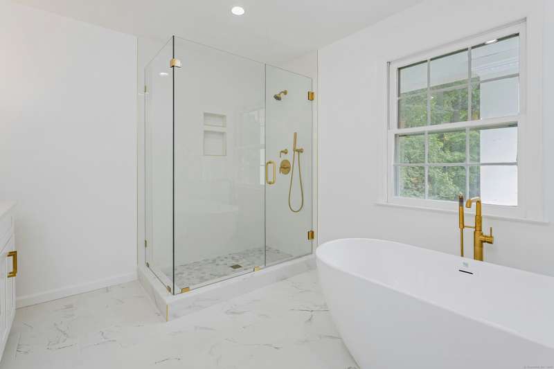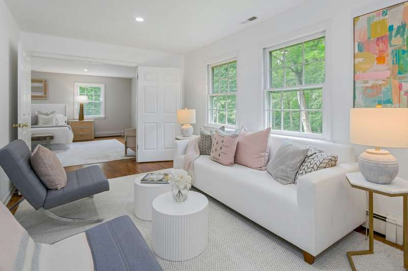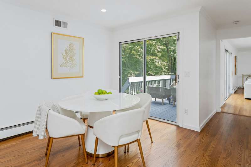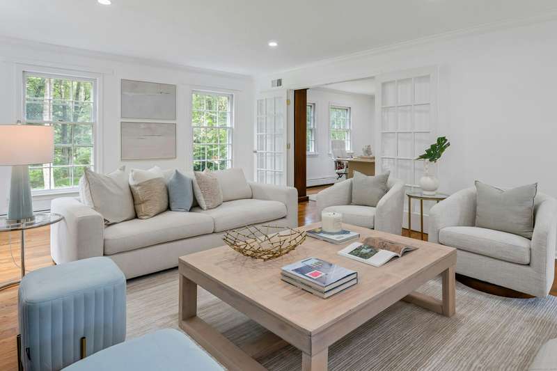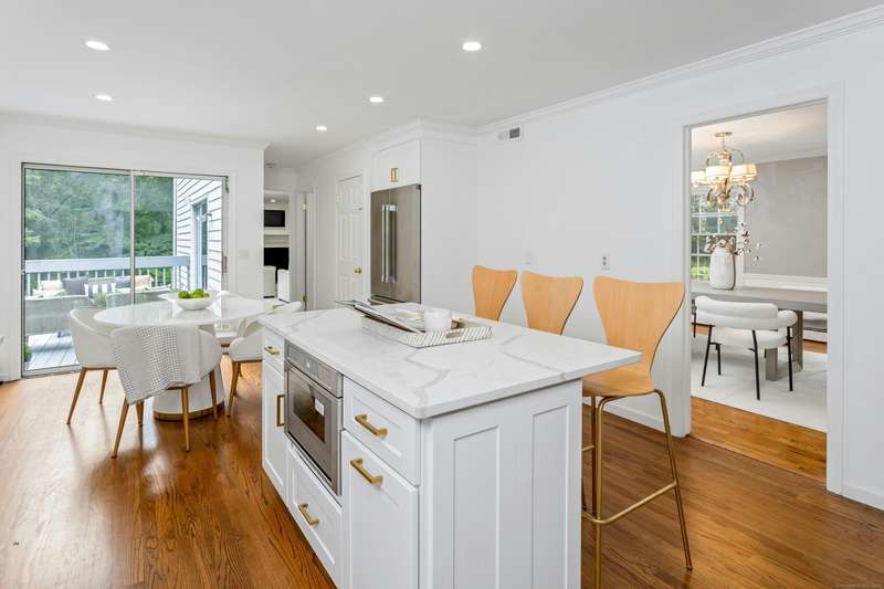 Just renovated to perfection, this 5BR, 3.5BA classic Connecticut colonial with extra 1900 square feet of finished lower level gives you over 5300 square feet of living area and is situated on a very private much sought-after cul de sac in New Canaan's loveliest areas of 4+ acres estates and properties. This home has it all. Beautiful quartz countertops in your new light filled family kitchen with custom cabinets and high end appliances, big island and breakfast room which leads through floor to ceiling glass sliders to your deck and connects to your huge family room with fireplace for ultimate gatherings. Upon entering the foyer, you find a lovely formal dining room, comfortable living room and wonderfully designed office with wood floors and bright windows looking onto your magic estate like private property. Newly renovated bathrooms grace 4 large bedrooms and laundry, with primary suite a sitting room (or nursery), walk-in closet, and a spa-like bath. The connecting and private entry in-law suite has a separate staircase with its own exterior entrance leading to a fifth bedroom suite with sitting room. The huge 1900 square feet of newly finished lower level with glass doors walking out to private patio and has a huge playroom/media room and additional lower-level family room. The 2-car attached garage and possible wine room gives entertaining a new meaning. All just minutes to town, train, and schools!