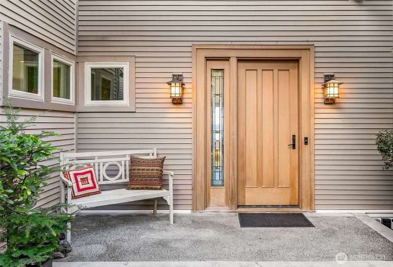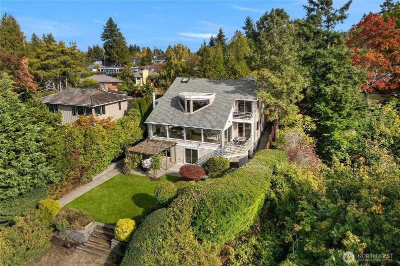 Amazing Northwest Contemporary home. Quiet and Peaceful. Sweeping Puget Sound views from all floors. Exceptional craftsmanship. Expansive living and dining areas. Family room next to gorgeous kitchen with dining nook and top of the line appliances. Upper floor features three bedrooms, two fantastic baths, and sitting or playroom loft space. Downstairs has huge rec room, or use as 2nd primary suite, with glass doors leading to patio and backyard. Office area, exercise room too. New interior paint, carpet, and tile. Beautifully landscaped. Privately tucked away from street down circular driveway that accesses two garages. 2nd garage has electric, water, and sewer for potential extra unit. Level entry. A truly grand property. Whole house A/C!