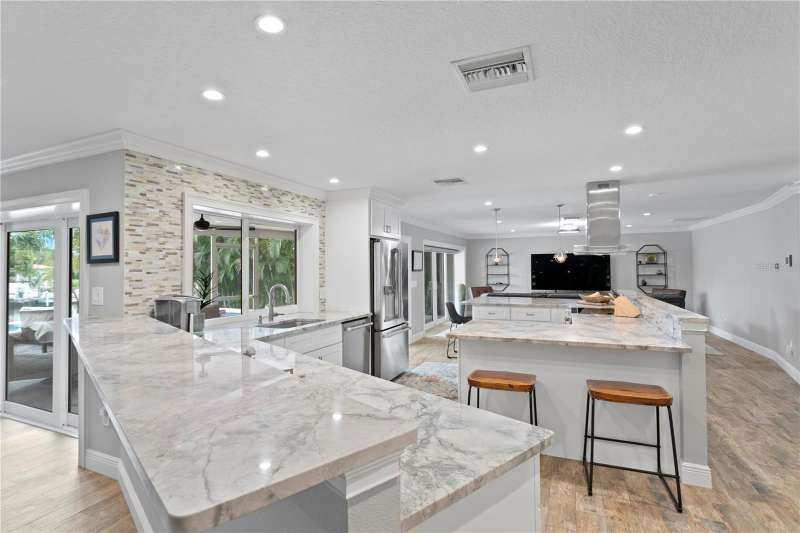 Don’t miss your opportunity to own this stunning home in the highly sought-after waterfront community of Venetian Isles! This beautiful 4-bedroom, 3-bath residence offers the perfect blend of luxury, comfort, and modern coastal living. Step inside to an expansive open-concept layout where the family room, kitchen, and dining area flow seamlessly into a screened lanai and beautifully landscaped backyard—perfect for effortless indoor-outdoor entertaining. The home welcomes you with a spacious foyer or a convenient mudroom entrance from the two-car garage. Throughout the living spaces, wood-look ceramic tile creates a warm, elegant ambiance. At the heart of the home, the chef’s dream kitchen features a large U-shaped eat-in island with marble countertops and backsplash, high-end Café series stainless steel appliances, and stylish custom cabinetry. The interior laundry room is as functional as it is beautiful, complete with Whirlpool Cabrio washer and dryer, built-in cabinetry, utility sink, and marble tile accents. Thoughtfully designed for privacy, the home offers a split bedroom layout. The first guest bedroom enjoys a beautifully appointed full bath, while two additional bedrooms in a separate wing share a spa-like bathroom with Danze fixtures and designer finishes. The private master suite is a true retreat, showcasing a luxurious marble bathroom and a generous walk-in closet. Enjoy true Florida living with hurricane-rated sliding glass doors that fully pocket back, connecting your main living spaces to the screened lanai and creating a seamless indoor-outdoor experience. Whether you're relaxing by the heated saltwater pool and spa, or enjoying tranquil canal views from the cozy firepit corner, this backyard oasis has it all. Boaters will appreciate the composite dock with electric, water, a 10,000 lb. boat lift, and updated seawall (2017). The lush landscaping provides ample privacy and is enhanced by elegant outdoor lighting for evening ambiance. Best of all, this home has experienced no water damage from any hurricanes—a testament to its strong construction and elevated location. Homes like this in Venetian Isles don’t come around often—schedule your private showing today!