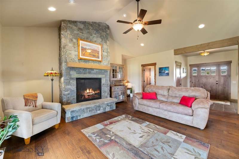 Welcome to a one-of-a-kind custom home on 7.260 acres in the coveted Pronghorn Meadows community, where luxury meets functionality and the views of the Madison Range stretch for miles. This thoughtfully designed 4-bedroom, 3-bath home offers 2,441 sq ft of refined living space - 3 bedrooms and 2 bath on the main level, with an additional private bonus room/bedroom above the garage complete with its own full bath and walk-in closet. Vaulted ceilings and engineered hickory floors welcome you into the main living area, while rich knotty alder trim, doors, and cabinetry carry throughout the home. The chef's kitchen features a walk-in pantry, granite counters, and a 5-burner gas stove (including one long burner) - perfect for hosting or daily living. The primary suite includes French doors to the back patio, two walk-in closets, a double vanity, a walk-in custom tiled shower, and heated tile flooring. Two guest bedrooms with large walk-in closets and a full guest bathroom offer plenty of space for family or visitors. Great storage throughout and a whole-house water softener, and solar panels for energy efficiency add exceptional value. Outside, enjoy beautifully landscaped grounds with two ponds and a waterfall, rock garden, raised beds, and a greenhouse. The stamped concrete patios are ideal for soaking in the peaceful setting. The attached 2-car heated garage is complemented by a third small bay with utility sink and additional storage. A 38x40 toy barn features a 14' door and two 10' doors for all your recreational needs. Two RV hookups complete this incredible property. Located just minutes from Ennis, the Madison River, and all that the Madison Valley has to offer, this home perfectly blends elegance, practicality, and breathtaking scenery.
